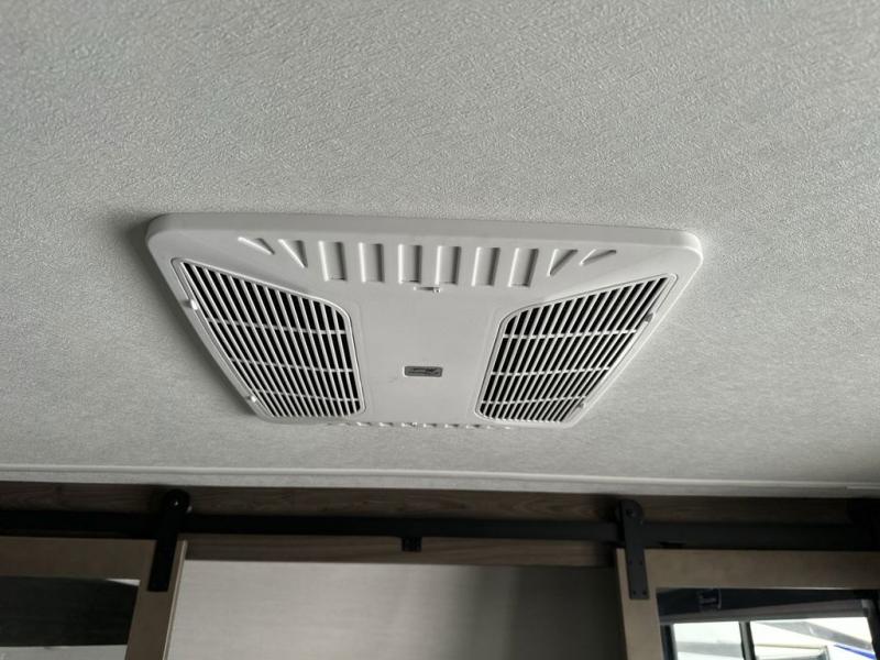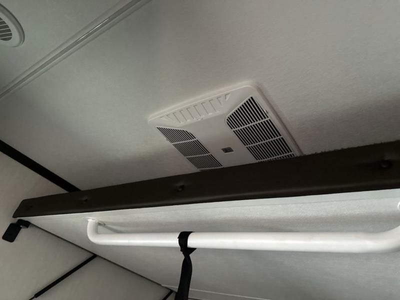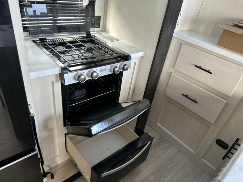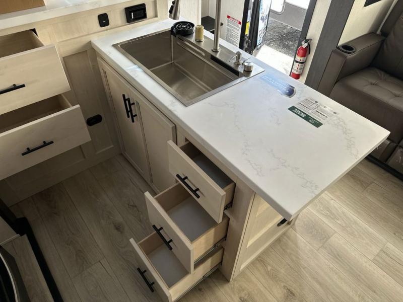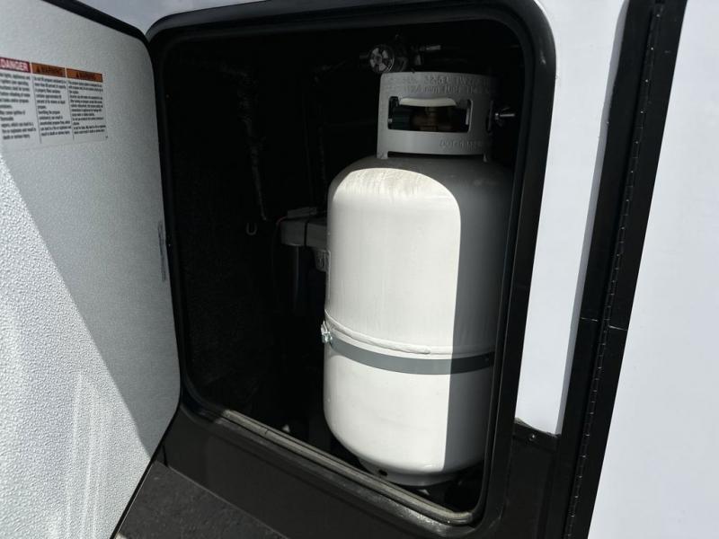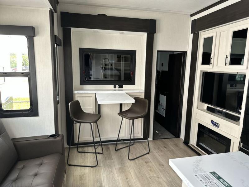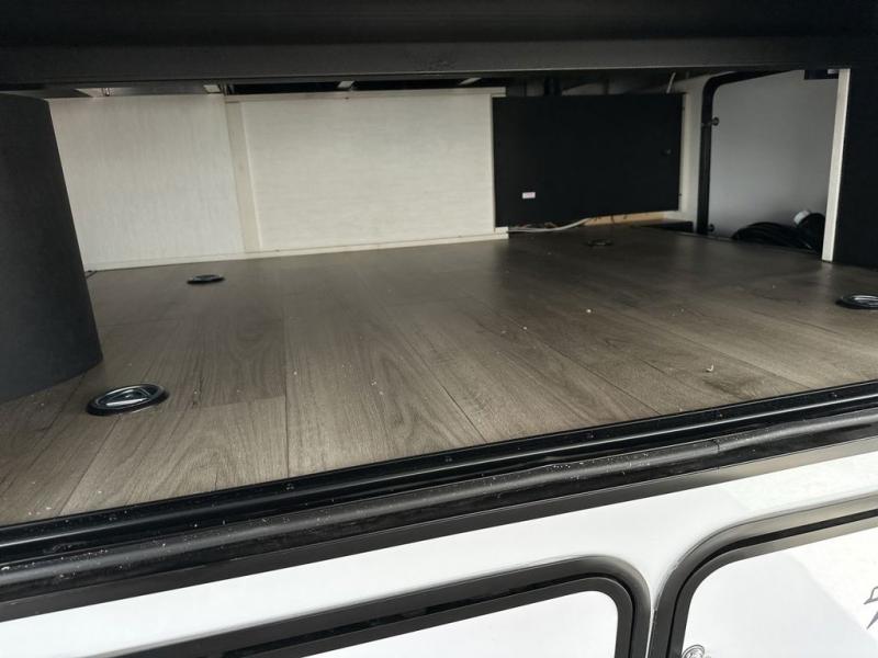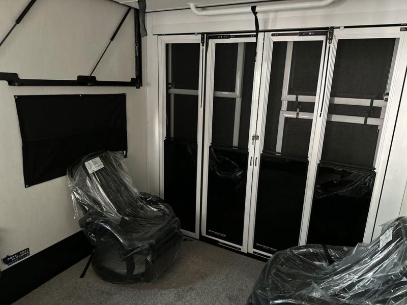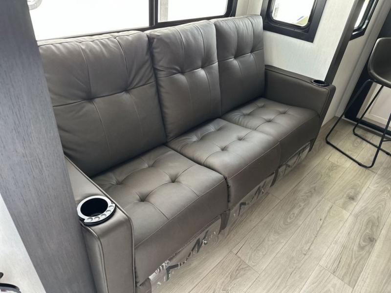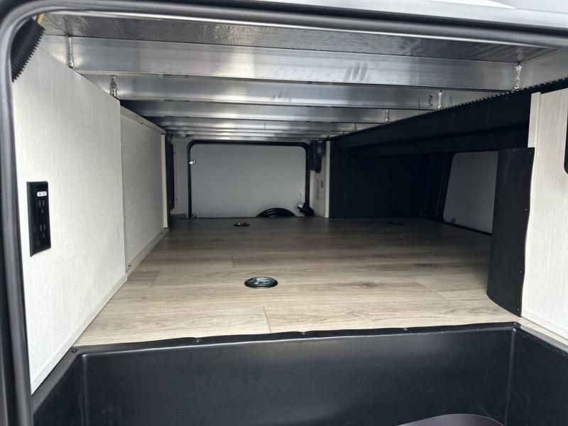This toy hauler with an 11' separate garage is sure to meet your needs! After you've unloaded your toys, you can relax on the Euro recliners or set up the drop-down queen bed for guests if it's getting late. There is also a window in the garage that opens to the main living area to keep everyone connected, and the flip-up table on the other side of the window provides a place to dine at. A counter peninsula will give the chef of your group more space to prep meals, and the dual opposing slides in this space make it more open. You'll also enjoy the sofa with recliners across from the entertainment center with a fireplace. A full bath with a spacious shower is perfect for cleaning up after a day of trail riding, and the front private bedroom with a queen bed slide is sure to have you feeling right at home!