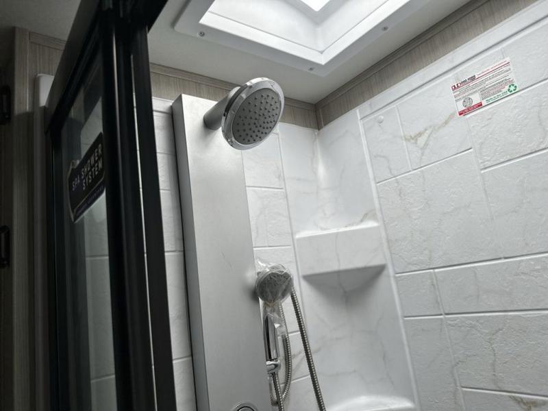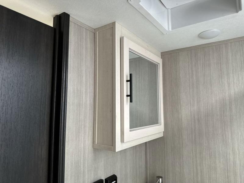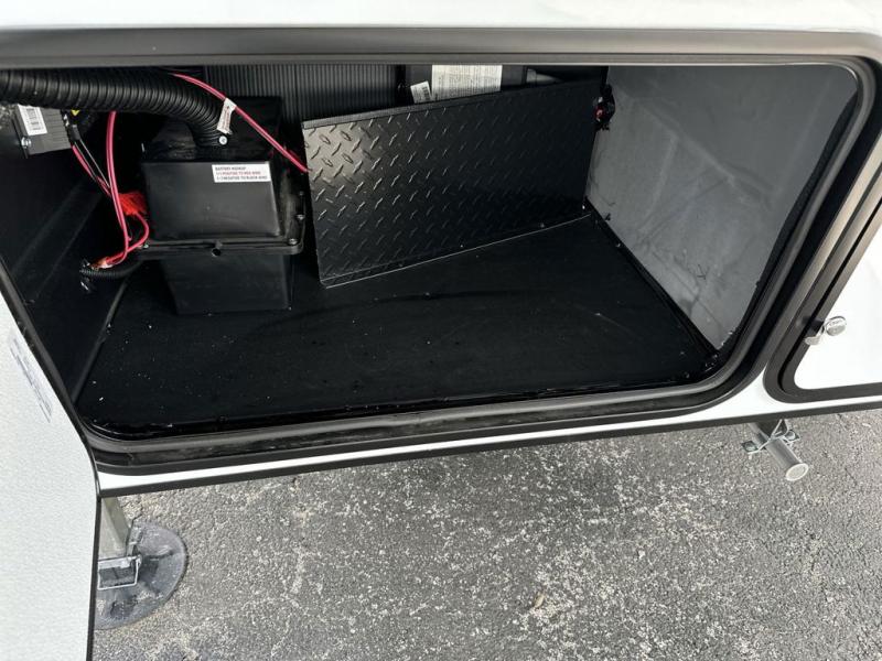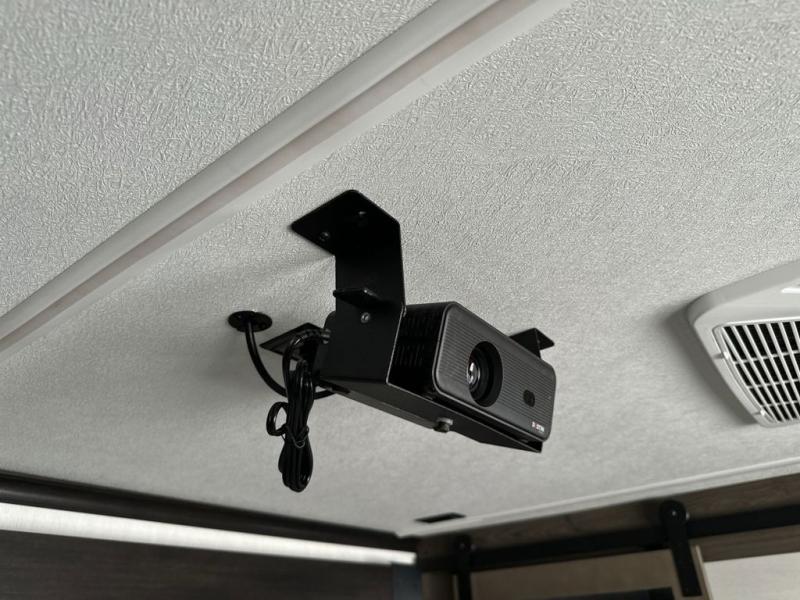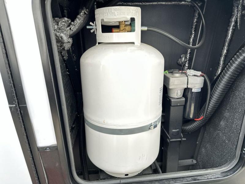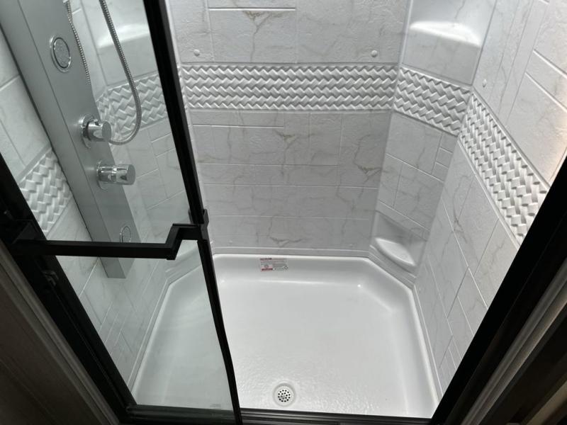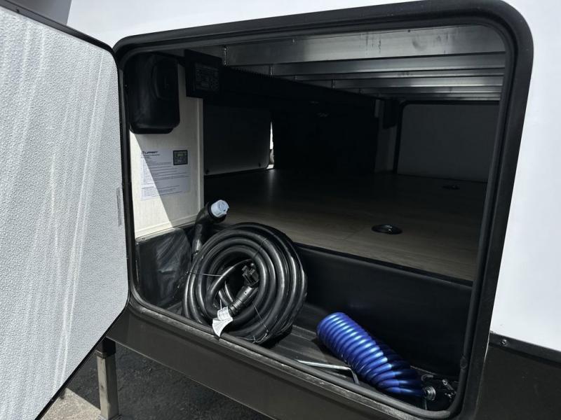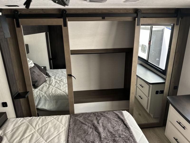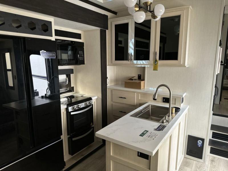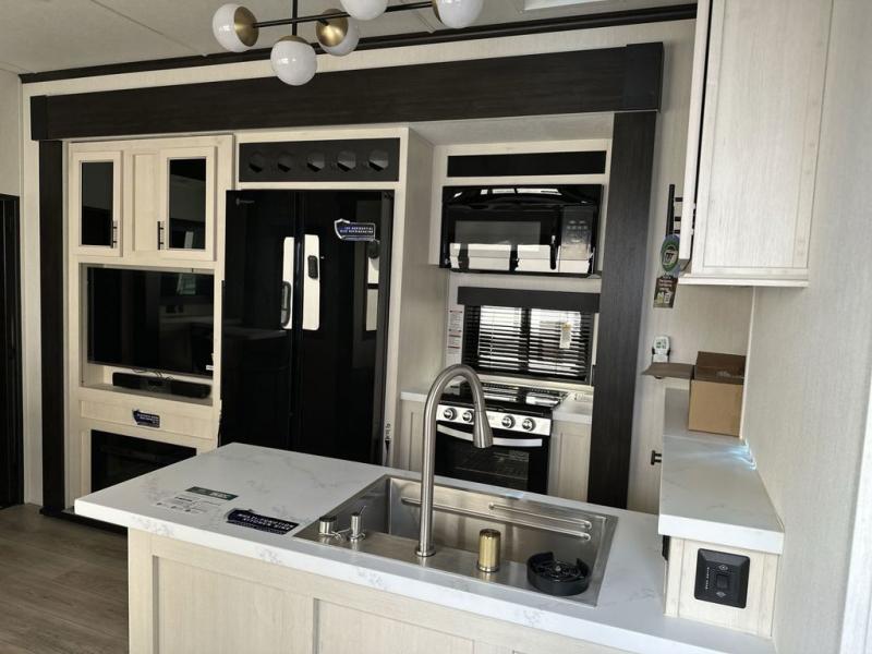 This toy hauler with an 11' separate garage is sure to meet your needs! After you've unloaded your toys, you can relax on the Euro recliners or set up the drop-down queen bed for guests if it's getting late. There is also a window in the garage that opens to the main living area to keep everyone connected, and the flip-up table on the other side of the window provides a place to dine at. A counter peninsula will give the chef of your group more space to prep meals, and the dual opposing slides in this space make it more open. You'll also enjoy the sofa with recliners across from the entertainment center with a fireplace. A full bath with a spacious shower is perfect for cleaning up after a day of trail riding, and the front private bedroom with a queen bed slide is sure to have you feeling right at home!