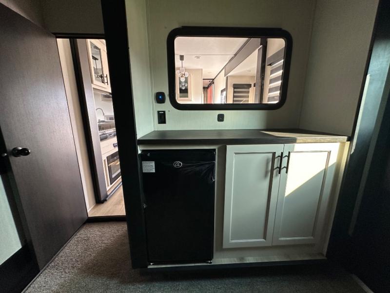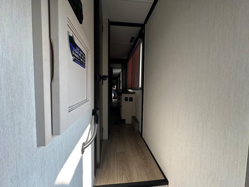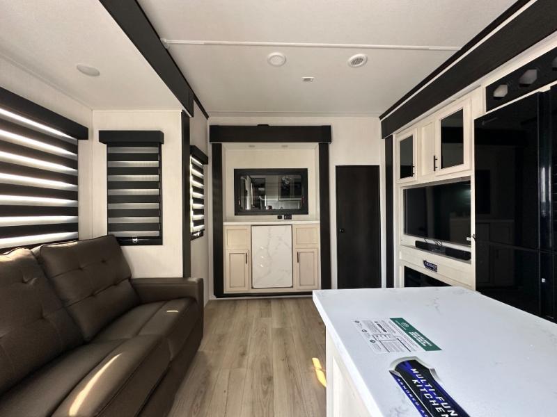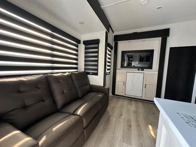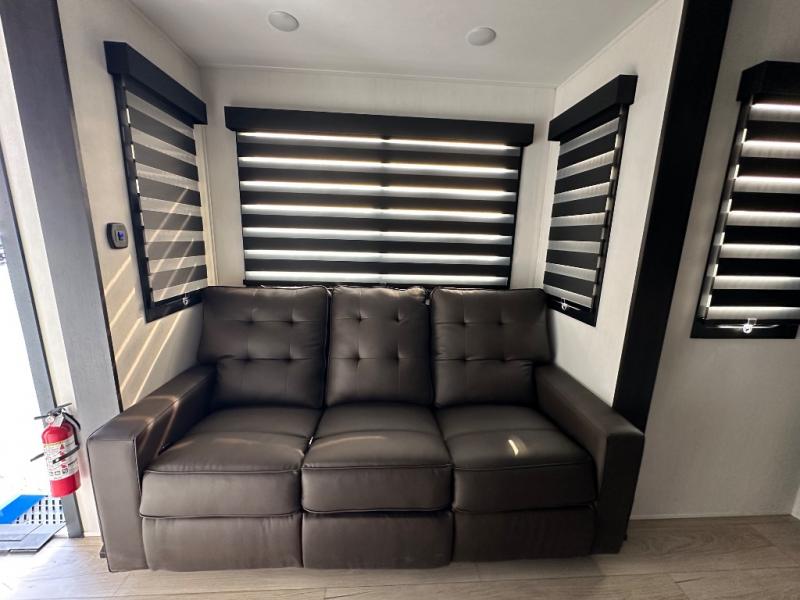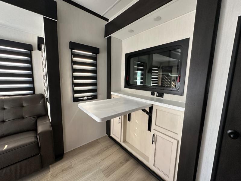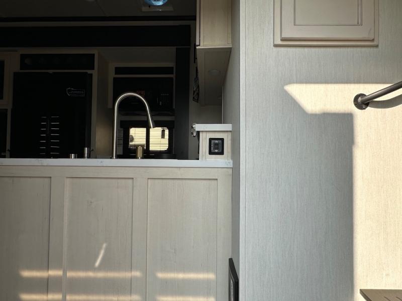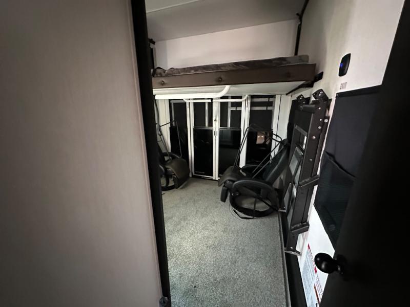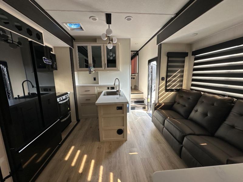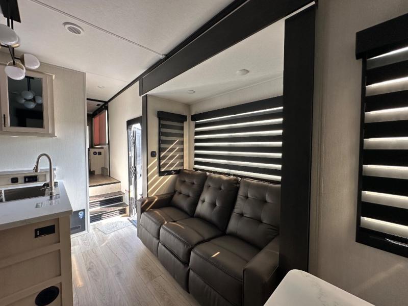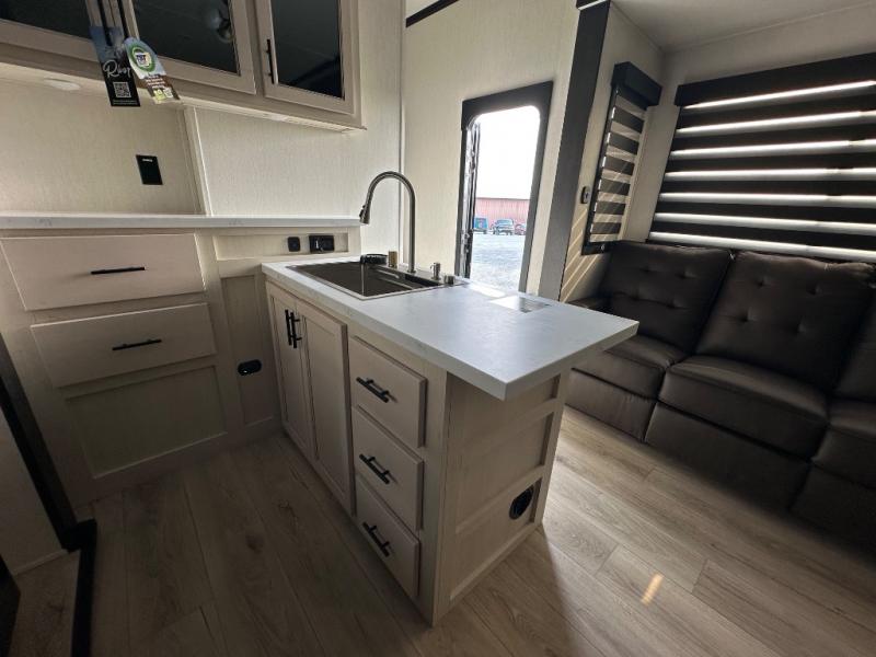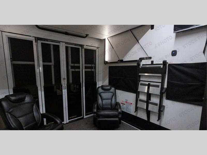 This toy hauler with an 11' separate garage is sure to meet your needs! After you've unloaded your toys, you can relax on the Euro recliners or set up the drop-down queen bed for guests if it's getting late. There is also a window in the garage that opens to the main living area to keep everyone connected, and the flip-up table on the other side of the window provides a place to dine at. A counter peninsula will give the chef of your group more space to prep meals, and the dual opposing slides in this space make it more open. You'll also enjoy the sofa with recliners across from the entertainment center with a fireplace. A full bath with a spacious shower is perfect for cleaning up after a day of trail riding, and the front private bedroom with a queen bed slide is sure to have you feeling right at home!