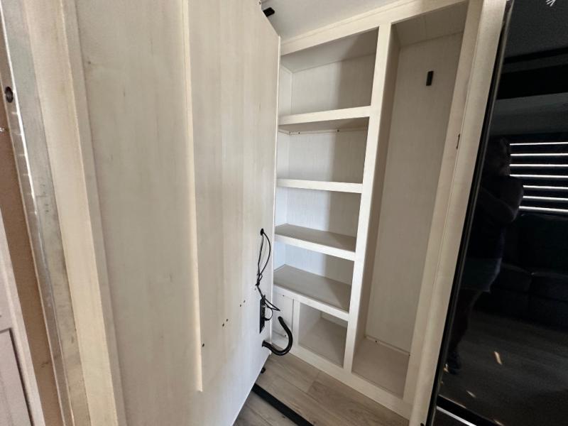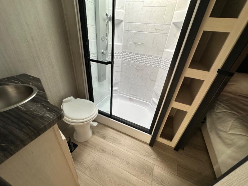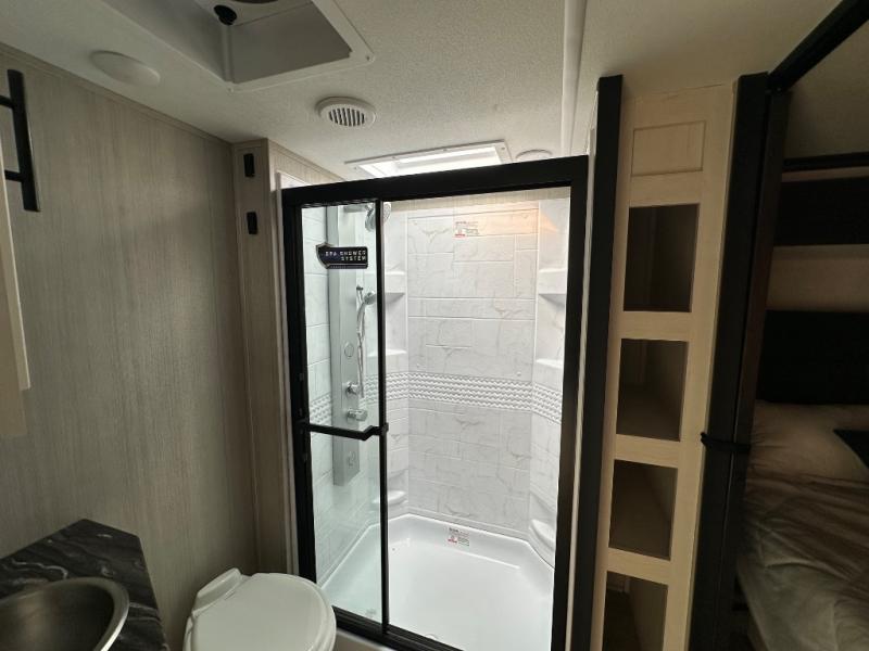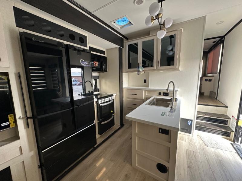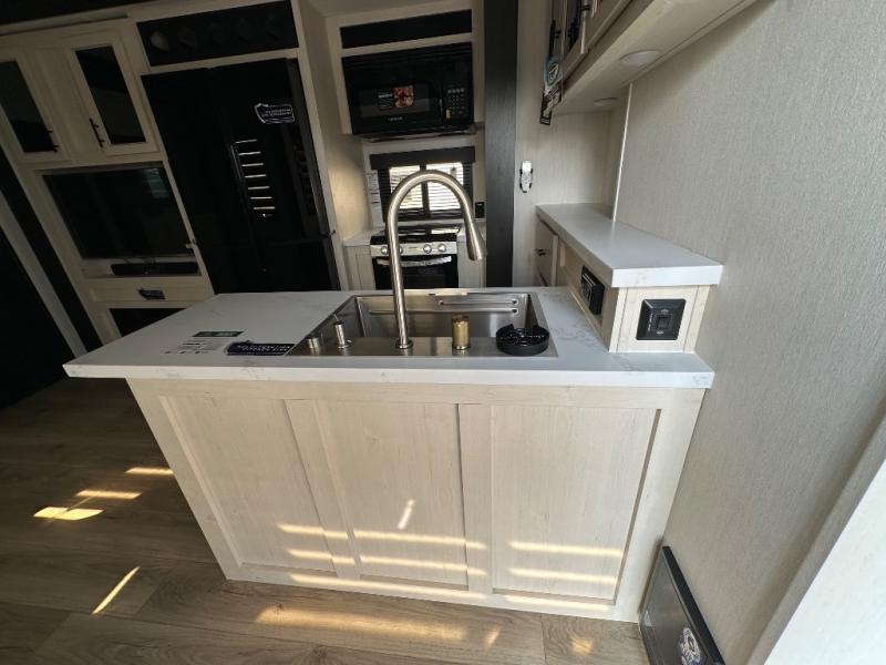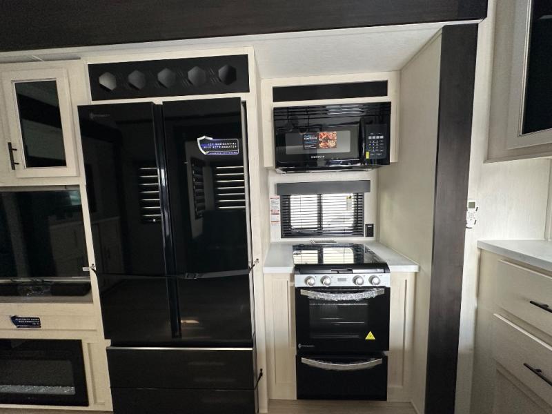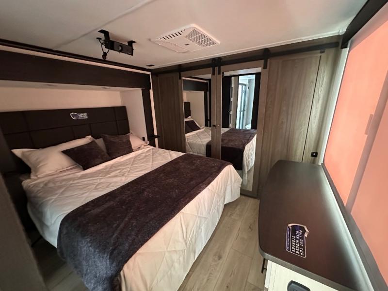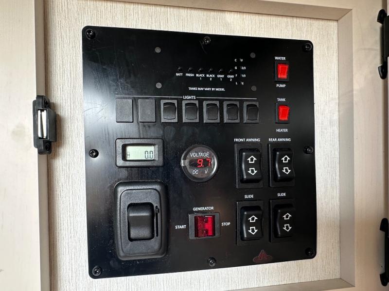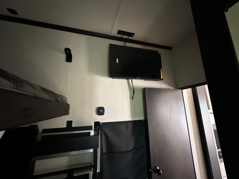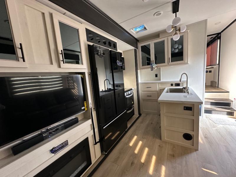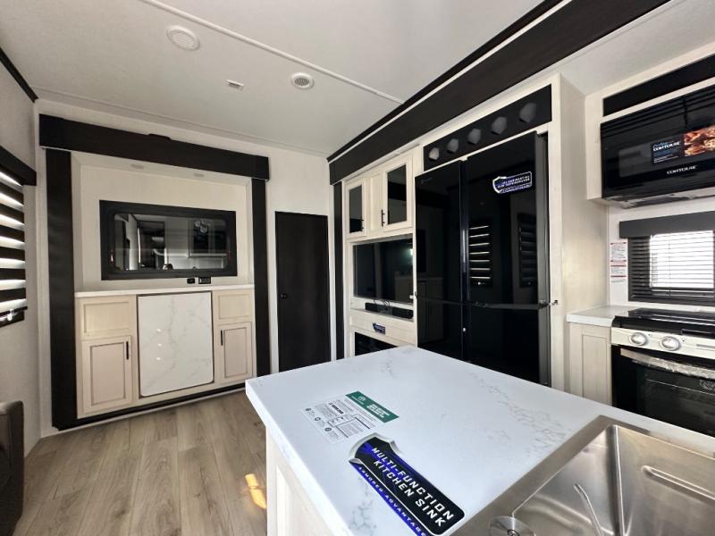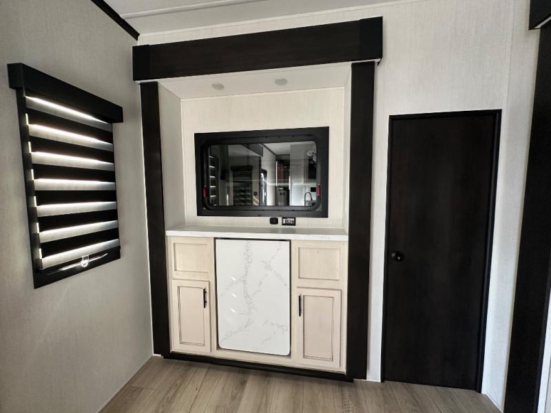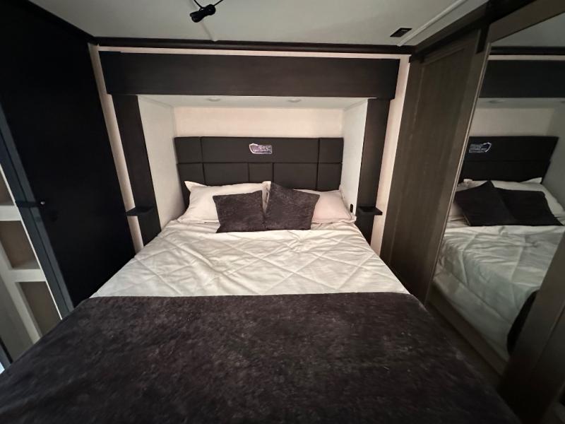 This toy hauler with an 11' separate garage is sure to meet your needs! After you've unloaded your toys, you can relax on the Euro recliners or set up the drop-down queen bed for guests if it's getting late. There is also a window in the garage that opens to the main living area to keep everyone connected, and the flip-up table on the other side of the window provides a place to dine at. A counter peninsula will give the chef of your group more space to prep meals, and the dual opposing slides in this space make it more open. You'll also enjoy the sofa with recliners across from the entertainment center with a fireplace. A full bath with a spacious shower is perfect for cleaning up after a day of trail riding, and the front private bedroom with a queen bed slide is sure to have you feeling right at home!