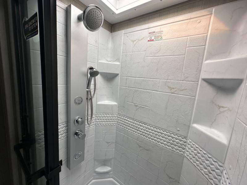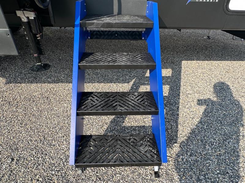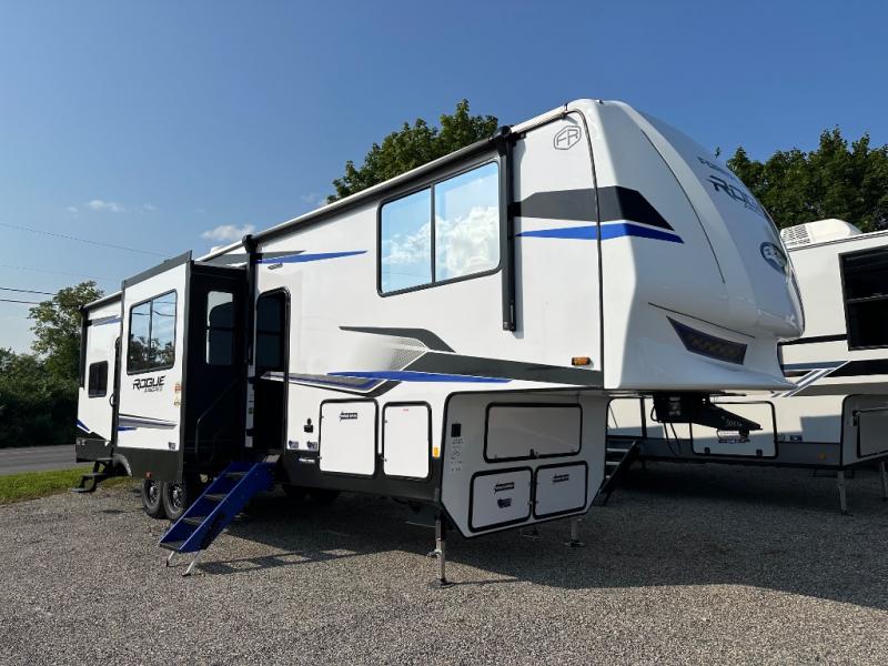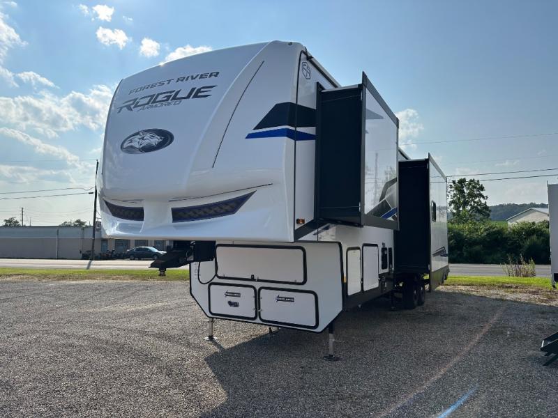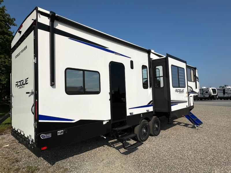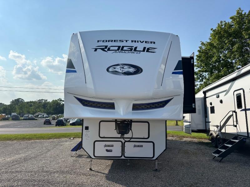 Every one of these Forest River Vengeance Rogue Armored fifth wheel toy haulers come with the features you want most at an affordable price tag! The DuraPoxy gas/oil resistant floor has 5,000 lb. tie downs to ensure your toys will arrive safely without damaging the flooring, plus the 3,000 lb. rated ramp door makes it easy to load them. Two 15,000 BTU A/Cs are "Super H Ducted" to keep you cool even on the hottest summer days, and an Armored underbelly helps keep your unit's vitals protected. The Rogue Ready package comes with a six point leveling system, a power MAXX storage system, a TST tire pressure monitoring system, and many more stand-out features. And don't overlook the Rogue Premium Package with an 8' weatherproof ramp door, an exterior TV hookup for the option to add a television, blue accent wheels, and solar reflective safety glass windows to name a few conveniences.