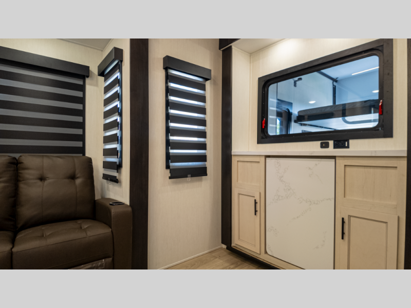 A: This 341GS11’s 11-ft armored garage, three slides, dual Euro recliners, hidden pantry, and two power awnings deliver upscale comfort and rugged durability in a 39'11" frame.