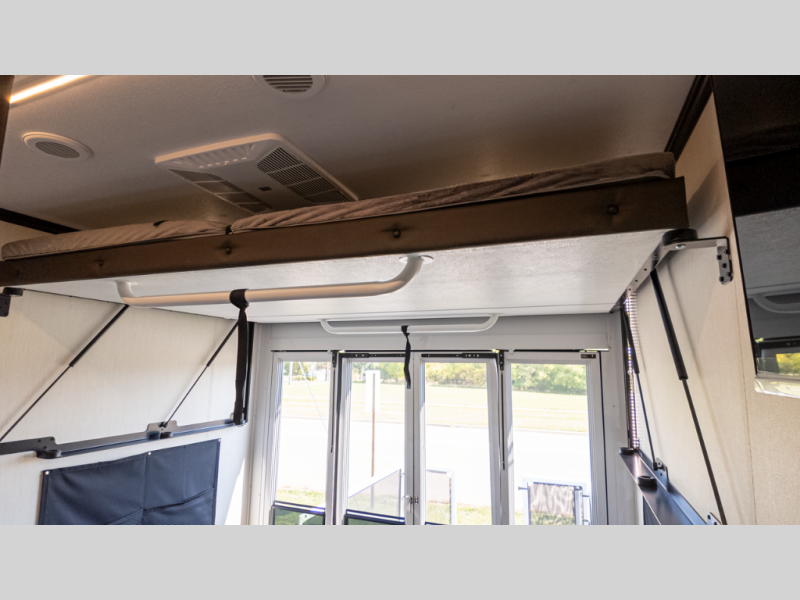 - Layout: Garage with drop-down queen over the dogs; dual Euro recliners; theater seating; three slides; front private bedroom