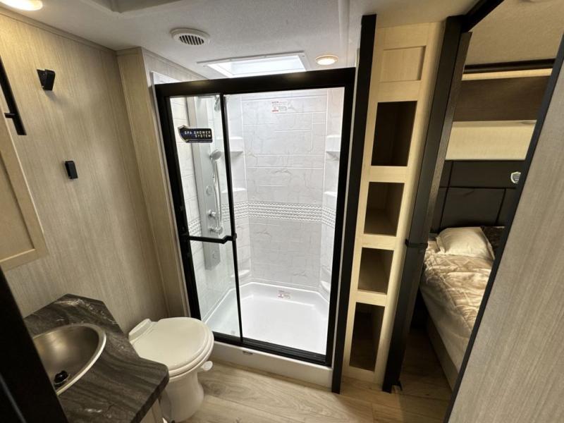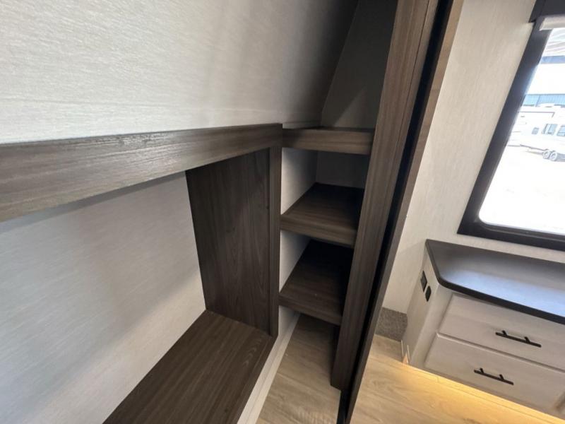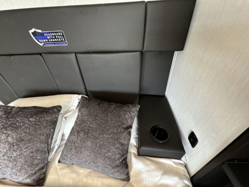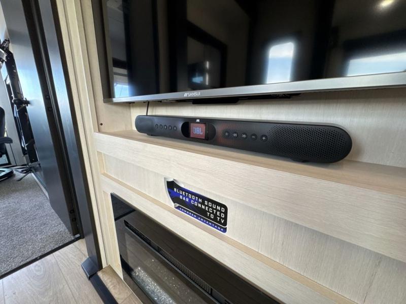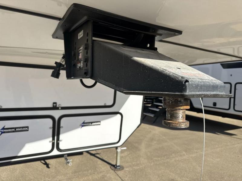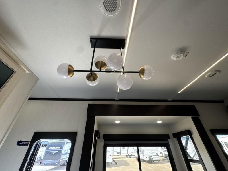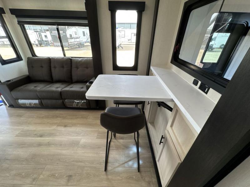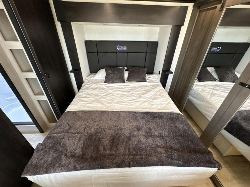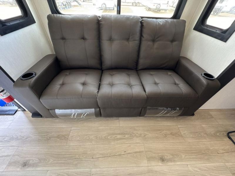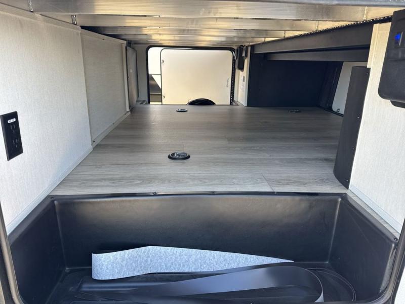 This toy hauler with an 11' separate garage is sure to meet your needs! After you've unloaded your toys, you can relax on the Euro recliners or set up the drop-down queen bed for guests if it's getting late. There is also a window in the garage that opens to the main living area to keep everyone connected, and the flip-up table on the other side of the window provides a place to dine at. A counter peninsula will give the chef of your group more space to prep meals, and the dual opposing slides in this space make it more open. You'll also enjoy the sofa with recliners across from the entertainment center with a fireplace. A full bath with a spacious shower is perfect for cleaning up after a day of trail riding, and the front private bedroom with a queen bed slide is sure to have you feeling right at home!