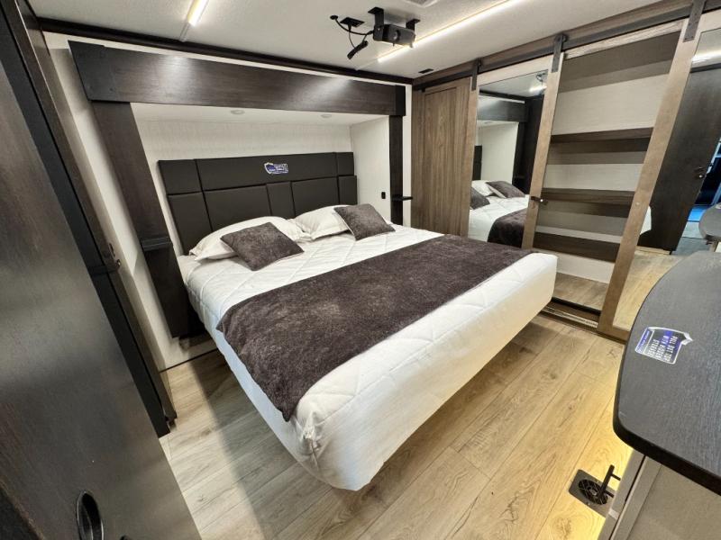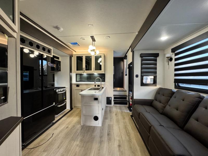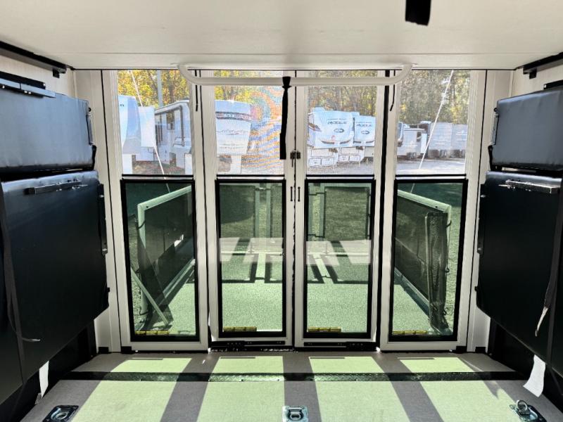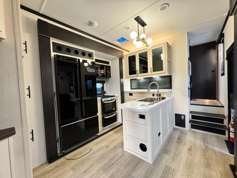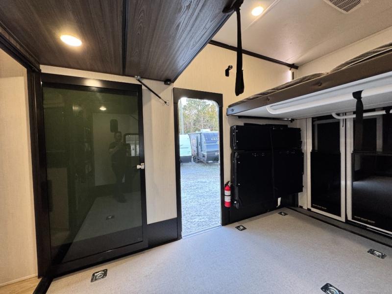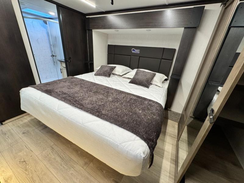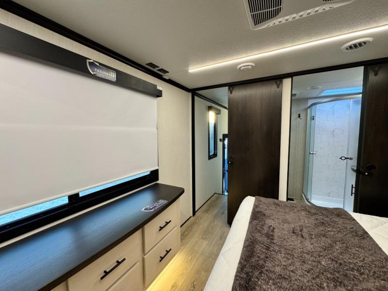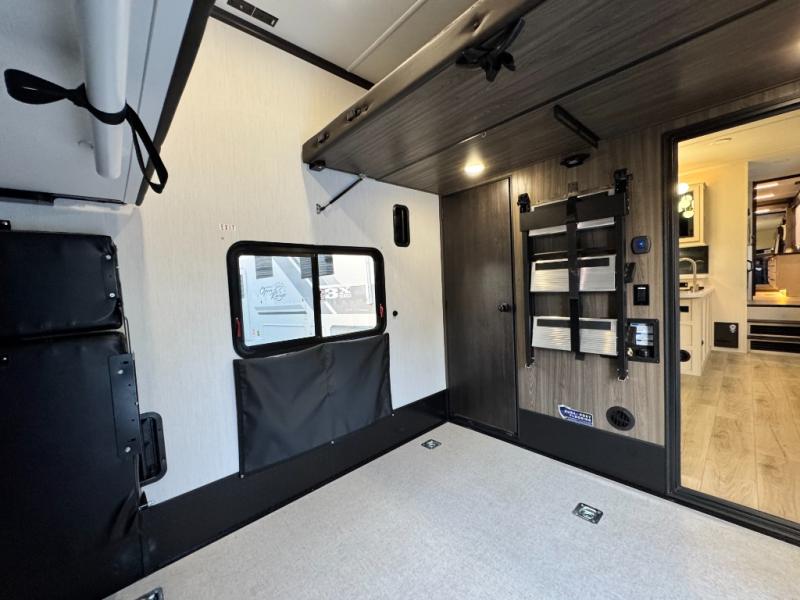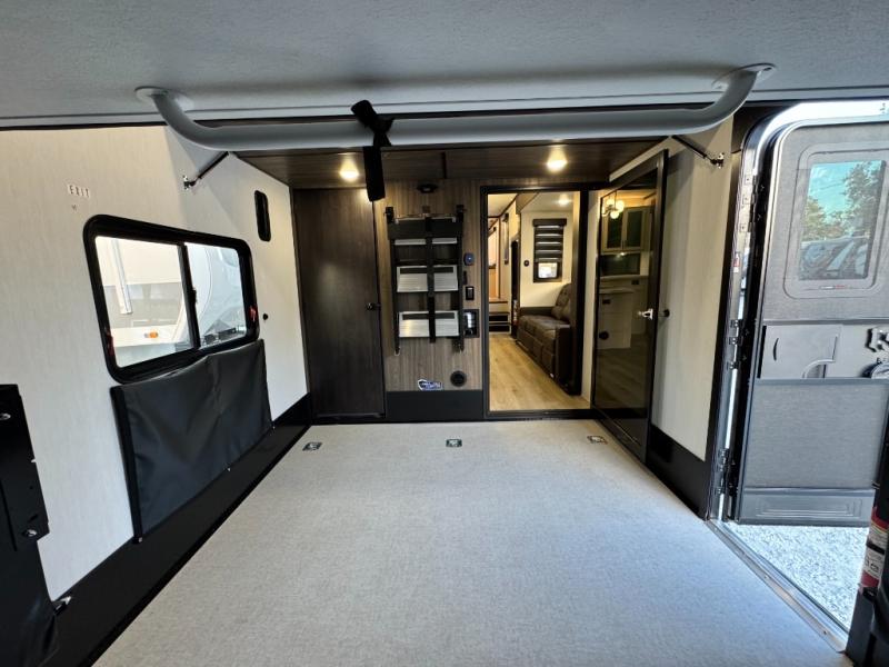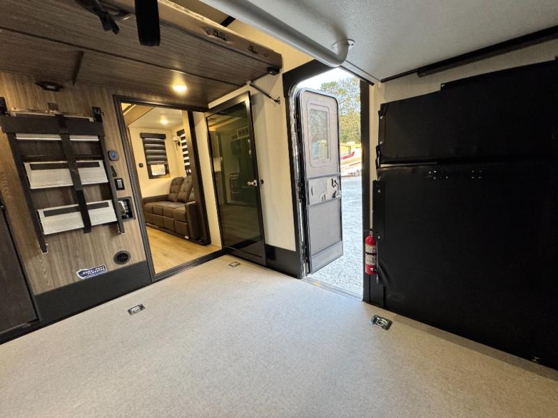 This 44-foot beast is built for serious off-road enthusiasts. It features a massive 13-foot separate garage (perfect for large Side-by-Sides or multiple motorcycles) with a heavy-duty ramp door patio system. The "Armored" package ensures durability with laminated sidewalls and a 102" wide-body construction. Inside, you'll find a King Bed suite, a loft for extra sleeping, 1.5 baths, and a chef’s kitchen with a residential 17 cu. ft. refrigerator. Plus, with a 6000 Watt Generator and 30-gallon fuel station, you are ready for extended dry camping trips.