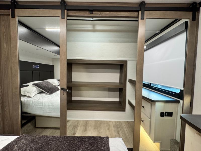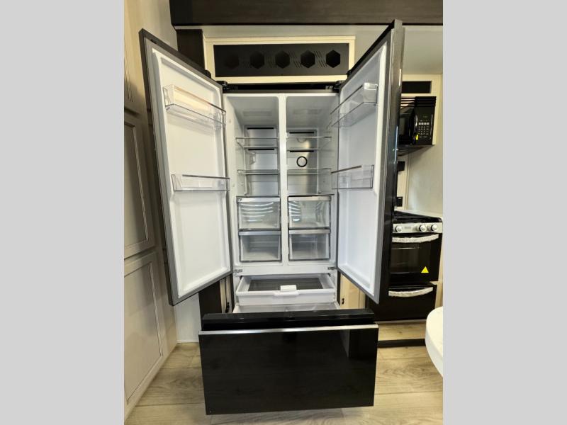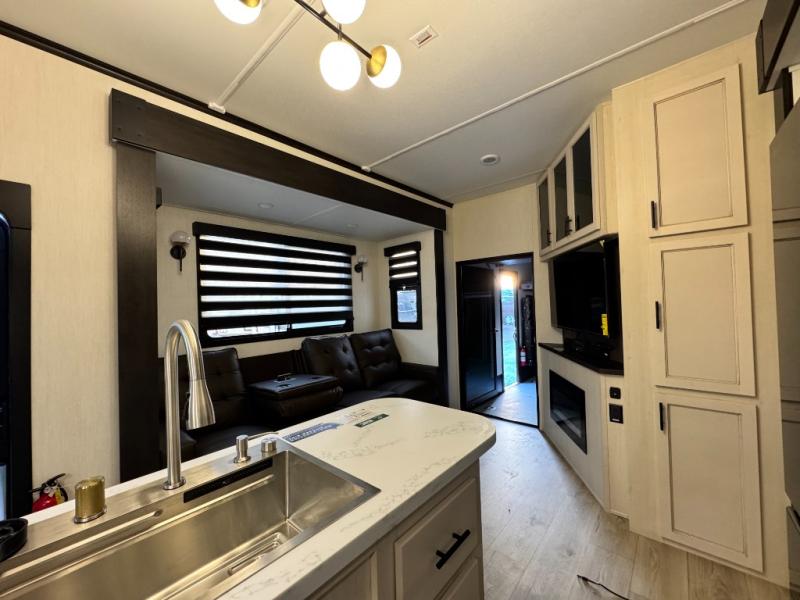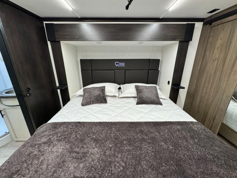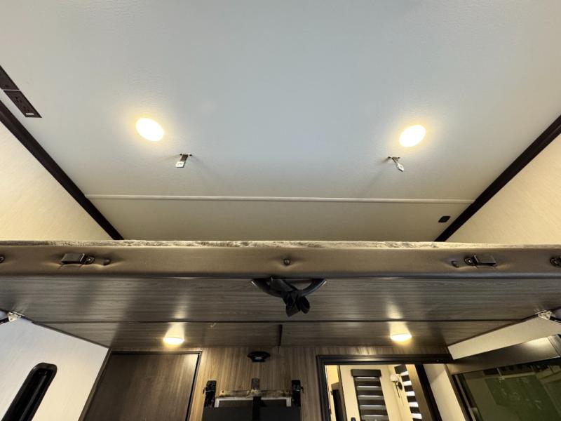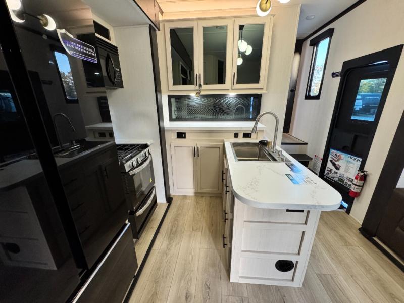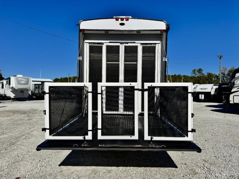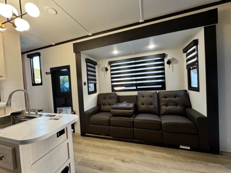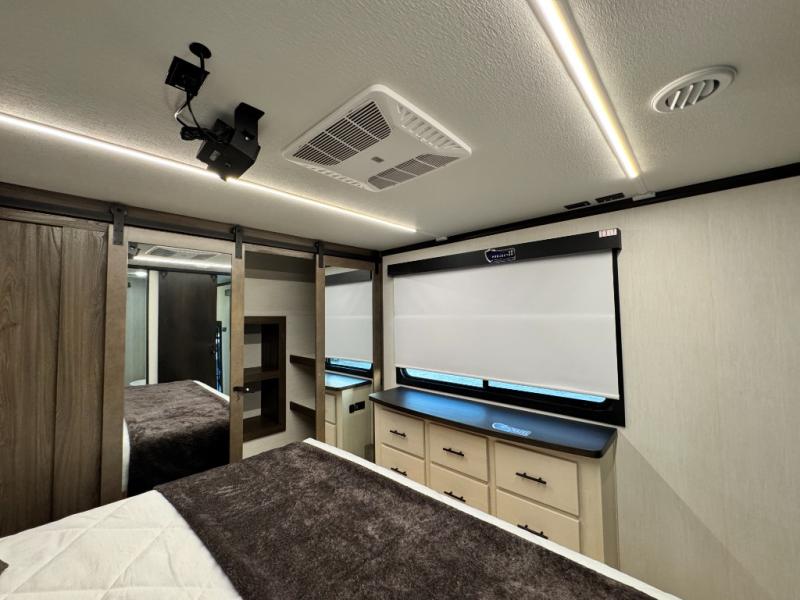 This 44-foot beast is built for serious off-road enthusiasts. It features a massive 13-foot separate garage (perfect for large Side-by-Sides or multiple motorcycles) with a heavy-duty ramp door patio system. The "Armored" package ensures durability with laminated sidewalls and a 102" wide-body construction. Inside, you'll find a King Bed suite, a loft for extra sleeping, 1.5 baths, and a chef’s kitchen with a residential 17 cu. ft. refrigerator. Plus, with a 6000 Watt Generator and 30-gallon fuel station, you are ready for extended dry camping trips.