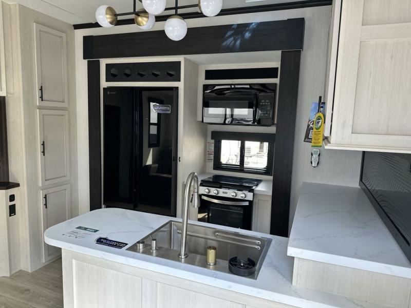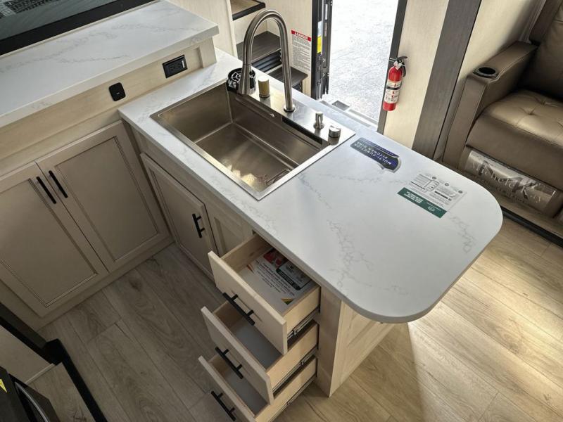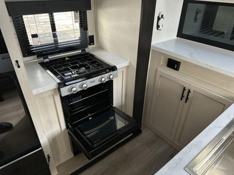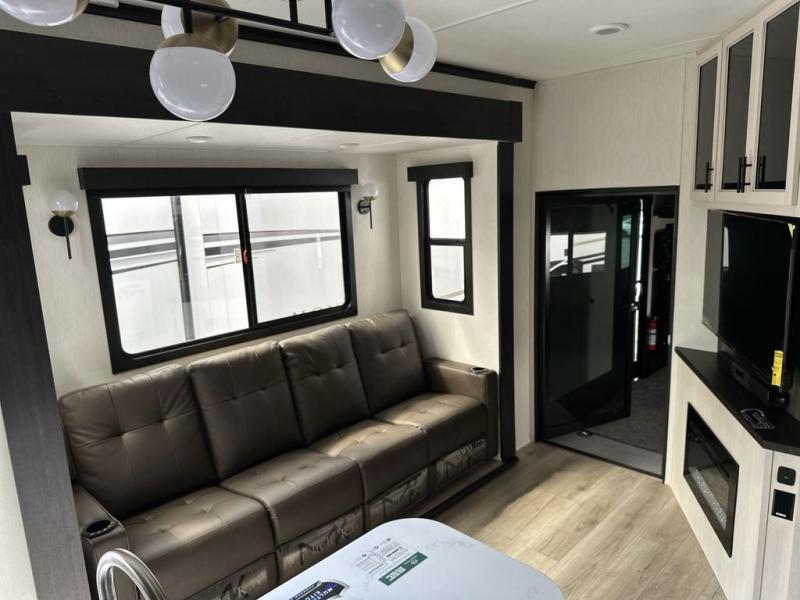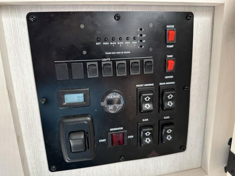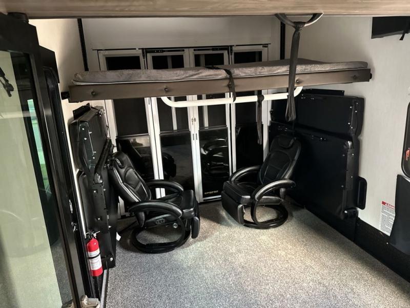 There is ample space in this triple slide out toy hauler for toys, gear, friends and more! The front private bedroom has a king bed slide to lay your head on at night, a front wall wardrobe, a dresser to keep your clothes looking nice, plus an entrance into the bathroom. The kitchen has a counter peninsula to prepare your meals, and a 12V black glass residential-style refrigerator to store any leftovers. The garage area has a loft, opposing flip-up sofas with a table in between and a raised queen bed above them, as well as a second entry door. And the half bath/utility bath is an extra bonus when camping with friends!
