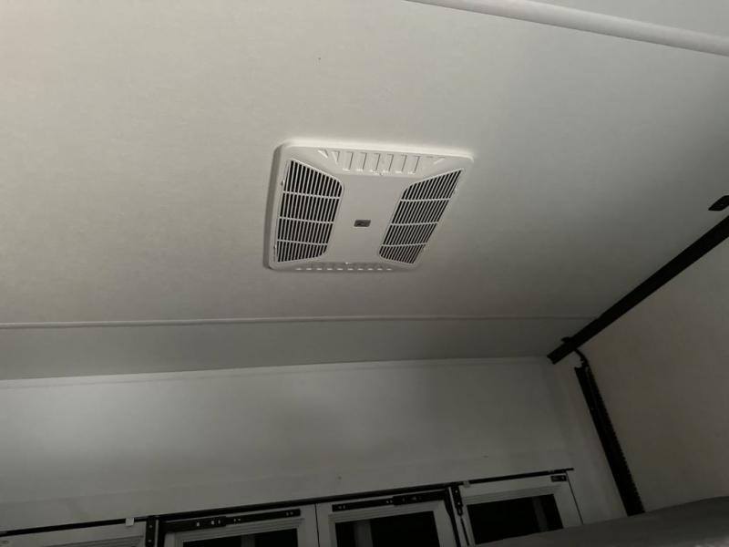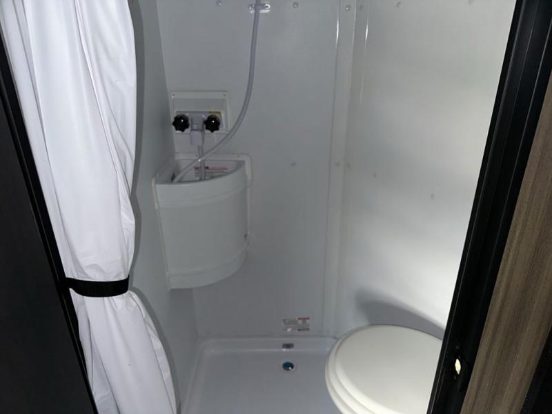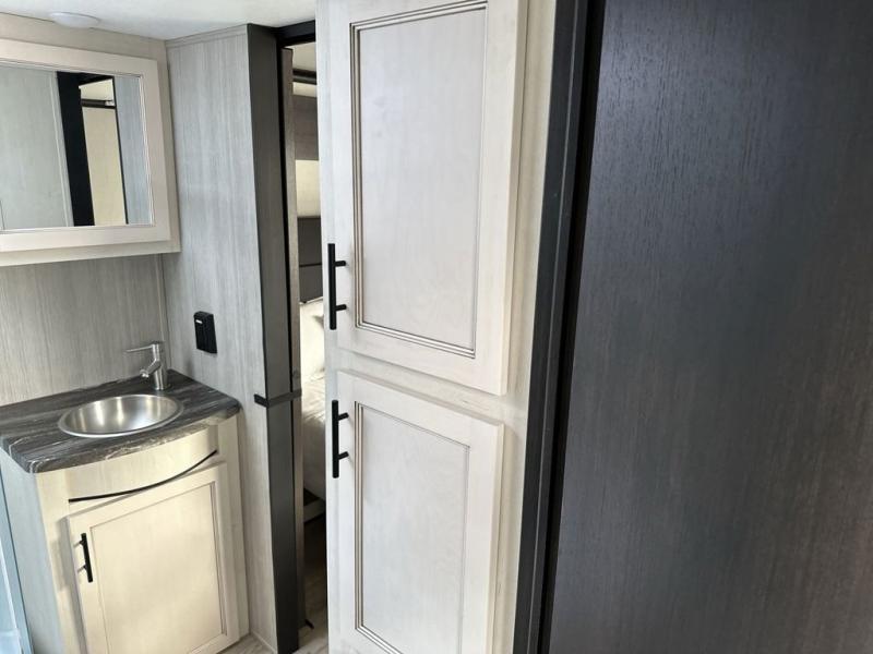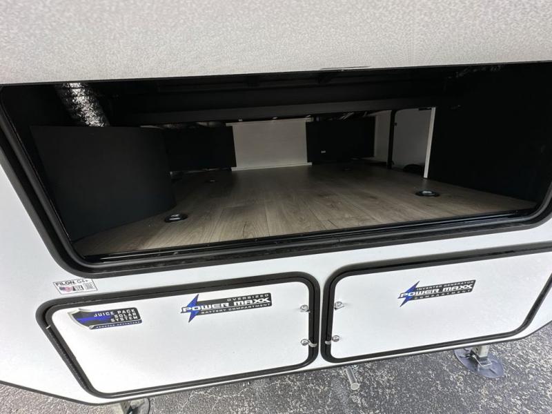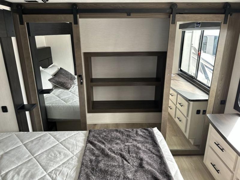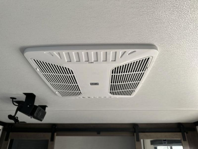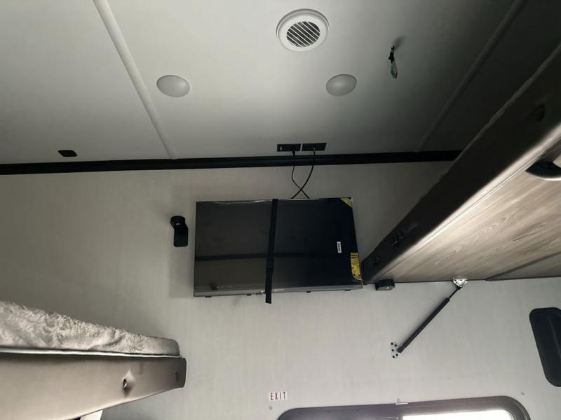 There is ample space in this triple slide out toy hauler for toys, gear, friends and more! The front private bedroom has a king bed slide to lay your head on at night, a front wall wardrobe, a dresser to keep your clothes looking nice, plus an entrance into the bathroom. The kitchen has a counter peninsula to prepare your meals, and a 12V black glass residential-style refrigerator to store any leftovers. The garage area has a loft, opposing flip-up sofas with a table in between and a raised queen bed above them, as well as a second entry door. And the half bath/utility bath is an extra bonus when camping with friends!