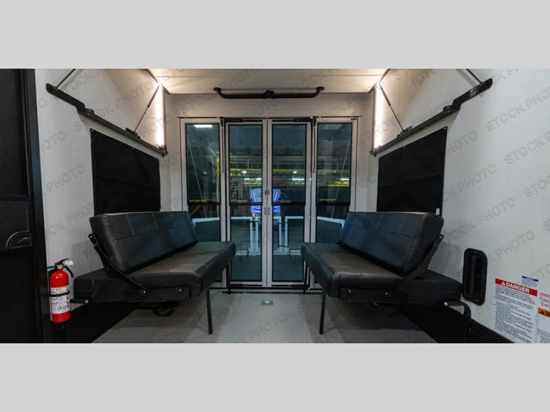 There is ample space in this triple slide out toy hauler for toys, gear, friends and more! The front private bedroom has a king bed slide to lay your head on at night, a front wall wardrobe, a dresser to keep your clothes looking nice, plus an entrance into the bathroom. The kitchen has a counter peninsula to prepare your meals, and a 12V black glass residential-style refrigerator to store any leftovers. The garage area has a loft, opposing flip-up sofas with a table in between and a raised queen bed above them, as well as a second entry door. And the half bath/utility bath is an extra bonus when camping with friends!