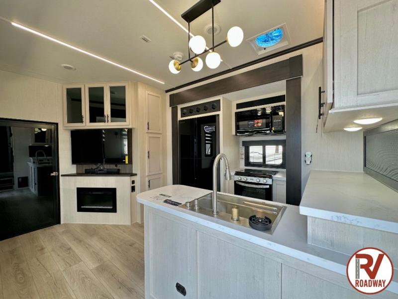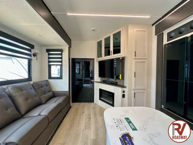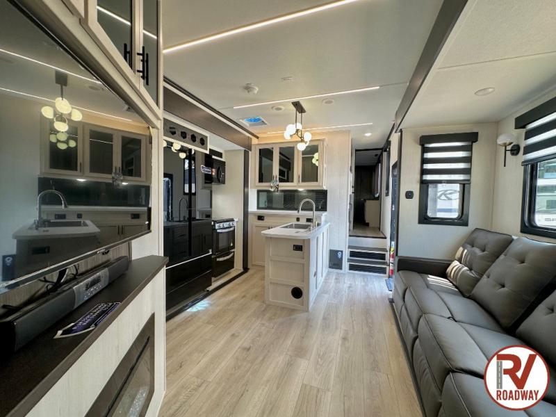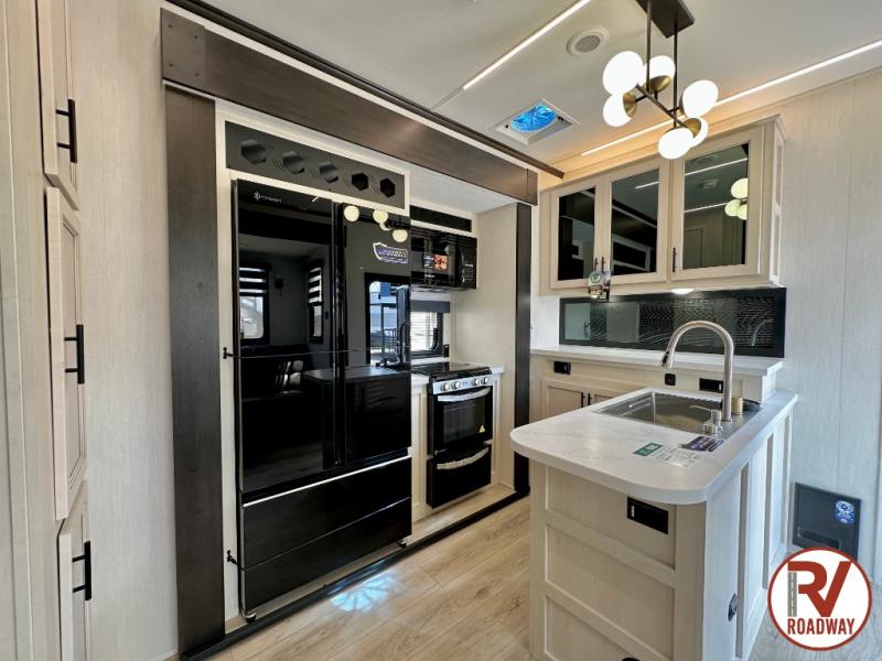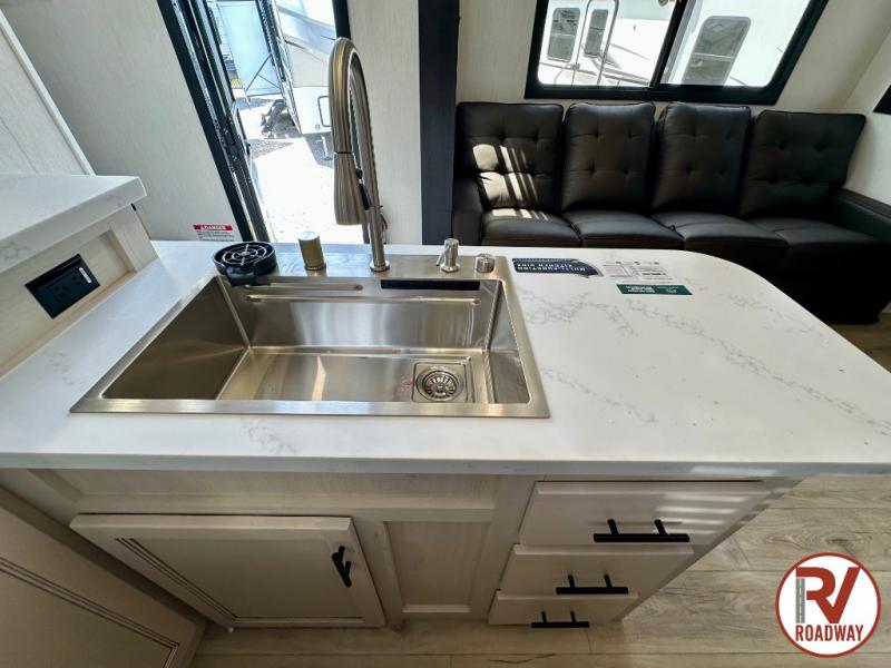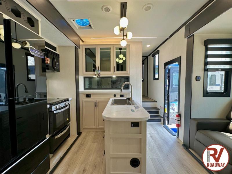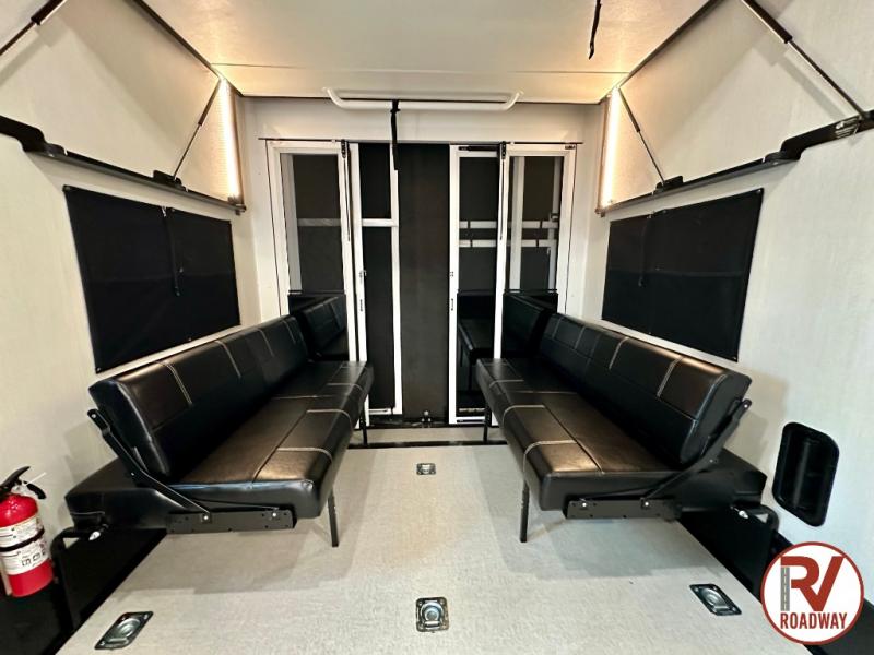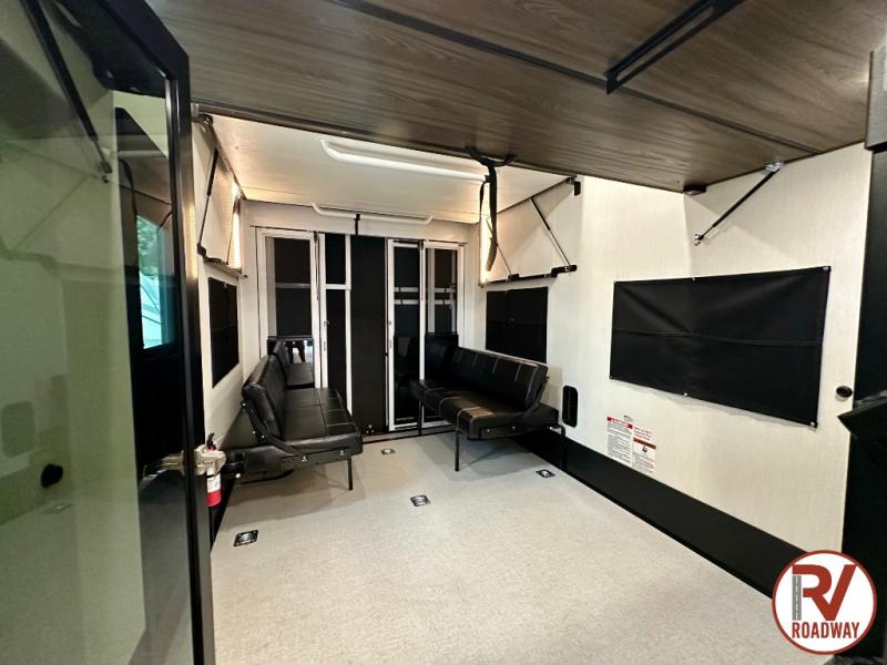 There is ample space in this triple slide out toy hauler for toys, gear, friends and more! The front private bedroom has a king bed slide to lay your head on at night, a front wall wardrobe, a dresser to keep your clothes looking nice, plus an entrance into the bathroom. The kitchen has a counter peninsula to prepare your meals, and a 12V black glass residential-style refrigerator to store any leftovers. The garage area has a loft, opposing flip-up sofas with a table in between and a raised queen bed above them, as well as a second entry door. And the half bath/utility bath is an extra bonus when camping with friends!