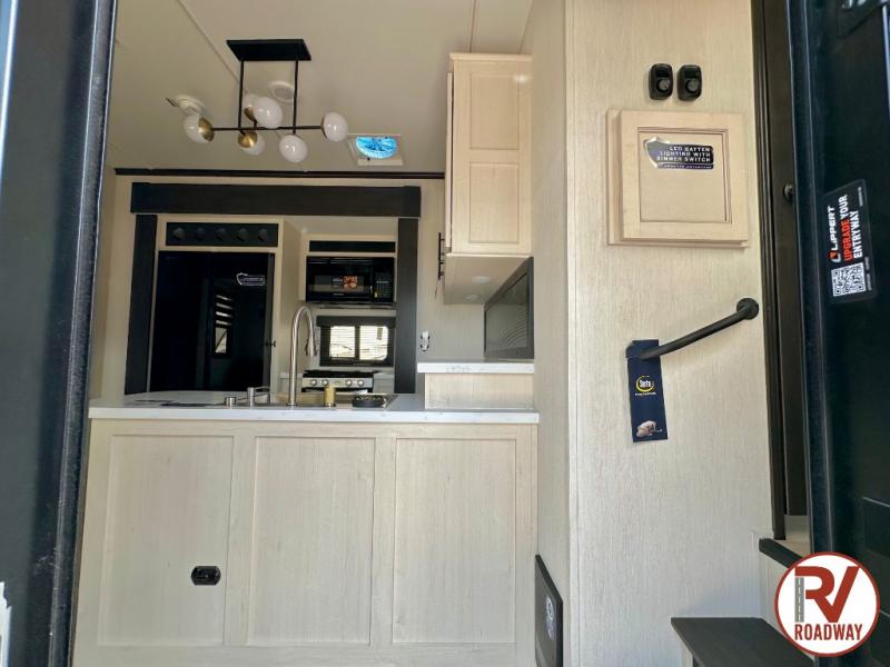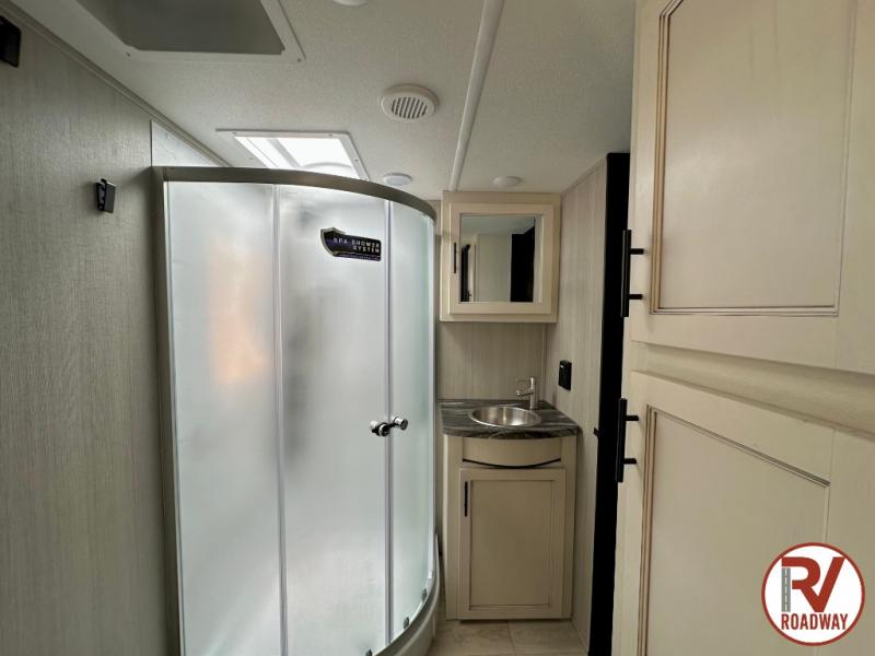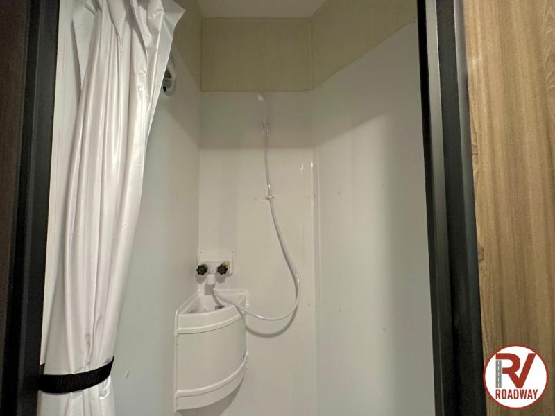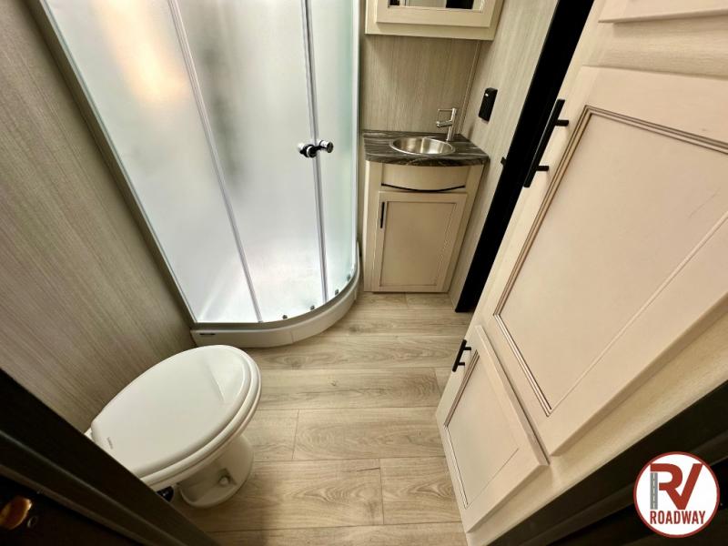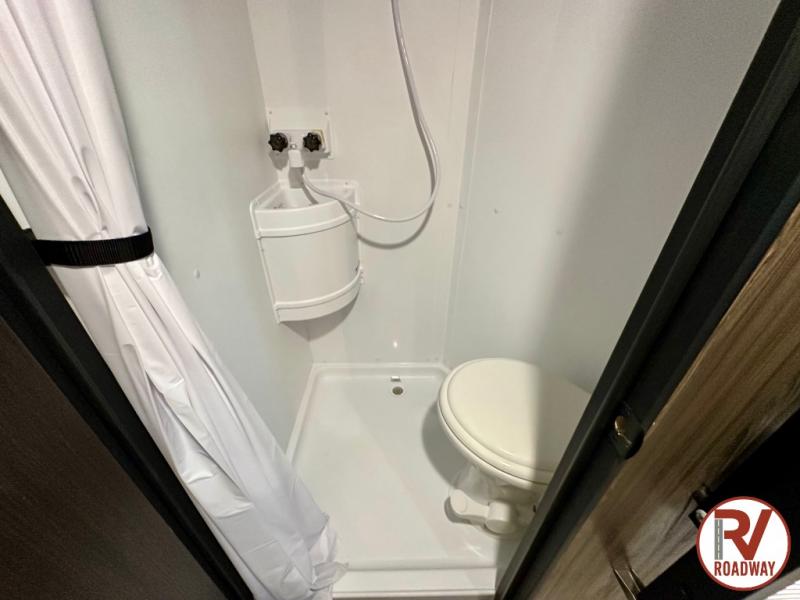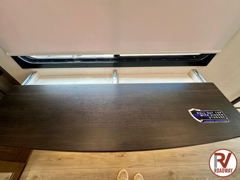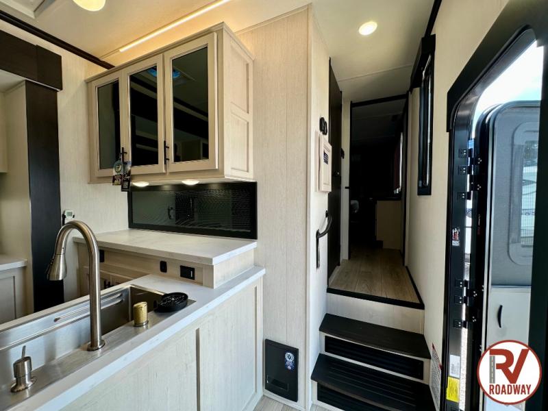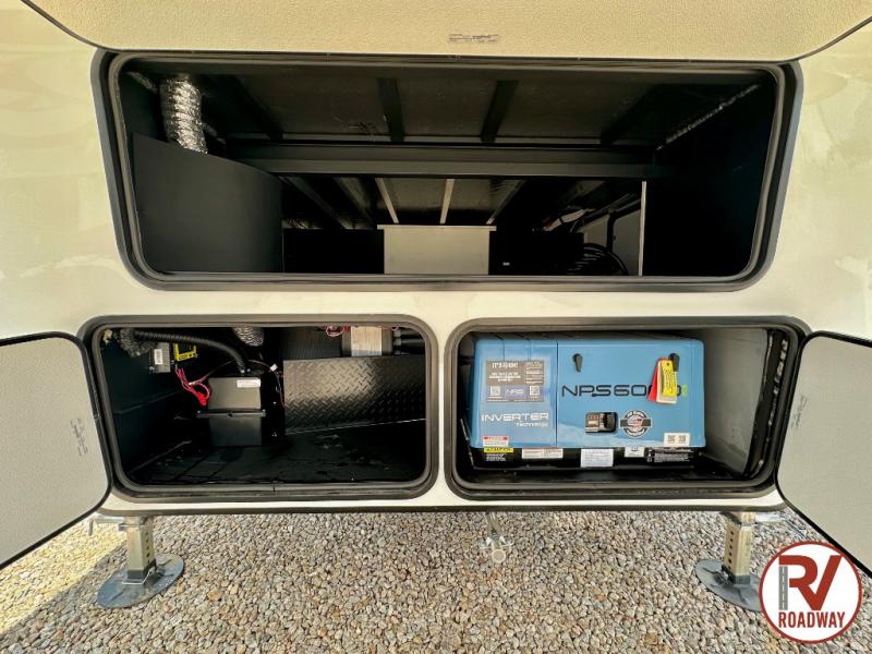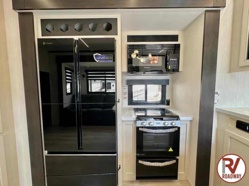 There is ample space in this triple slide out toy hauler for toys, gear, friends and more! The front private bedroom has a king bed slide to lay your head on at night, a front wall wardrobe, a dresser to keep your clothes looking nice, plus an entrance into the bathroom. The kitchen has a counter peninsula to prepare your meals, and a 12V black glass residential-style refrigerator to store any leftovers. The garage area has a loft, opposing flip-up sofas with a table in between and a raised queen bed above them, as well as a second entry door. And the half bath/utility bath is an extra bonus when camping with friends!