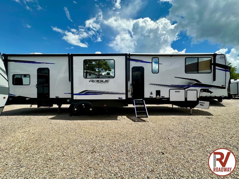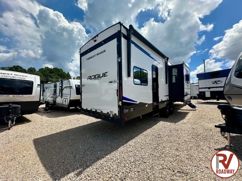 Every one of these Forest River Vengeance Rogue Armored fifth wheel toy haulers come with the features you want most at an affordable price tag! The DuraPoxy gas/oil resistant floor has 5,000 lb. tie downs to ensure your toys will arrive safely without damaging the flooring, plus the 3,000 lb. rated ramp door makes it easy to load them. Two 15,000 BTU A/Cs are "Super H Ducted" to keep you cool even on the hottest summer days, and an Armored underbelly helps keep your unit's vitals protected. The Rogue Ready package comes with a six point leveling system, a power MAXX storage system, a TST tire pressure monitoring system, and many more stand-out features. And don't overlook the Rogue Premium Package with an 8' weatherproof ramp door, an exterior TV hookup for the option to add a television, blue accent wheels, and solar reflective safety glass windows to name a few conveniences.
