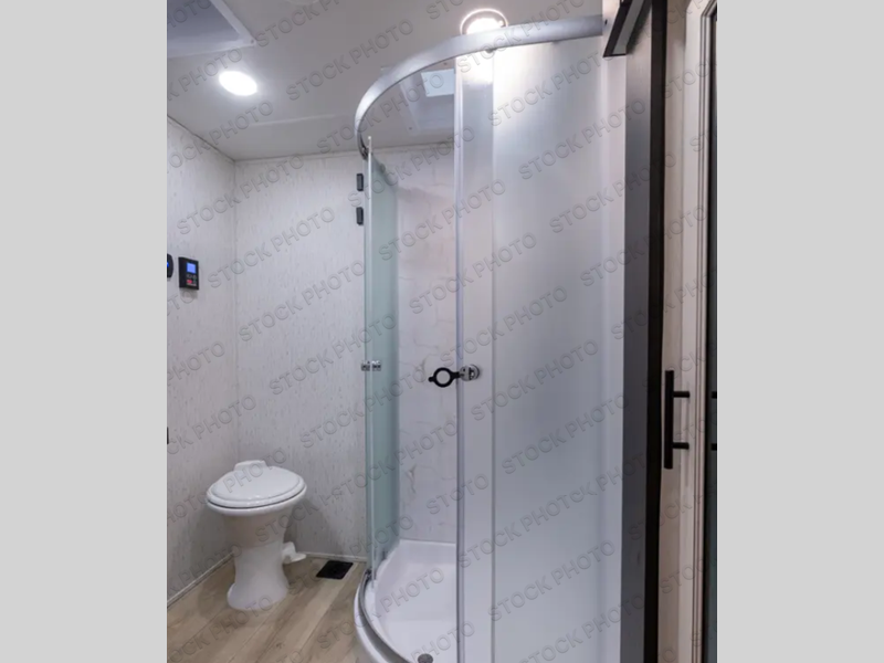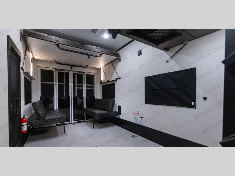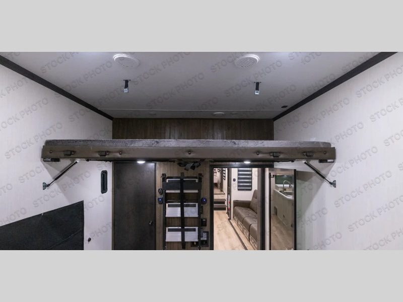 The 15' 6" garage area of this fifth wheel toy hauler has enough space for you to bring along your favorite off-road toys! The garage area also has opposing flip-up sofas with a table in between and a raised queen bed above, plus a loft and a half bath/utility bath. There is plenty of interior space in the central combined living/kitchen area thanks to the large slide out sofa with recliners, as well as the refrigerator and three burner cooktop slide. The front dual entry bathroom has a radius shower for you to freshen up in each morning and an entrance into a private bedroom with king bed and lots of storage!