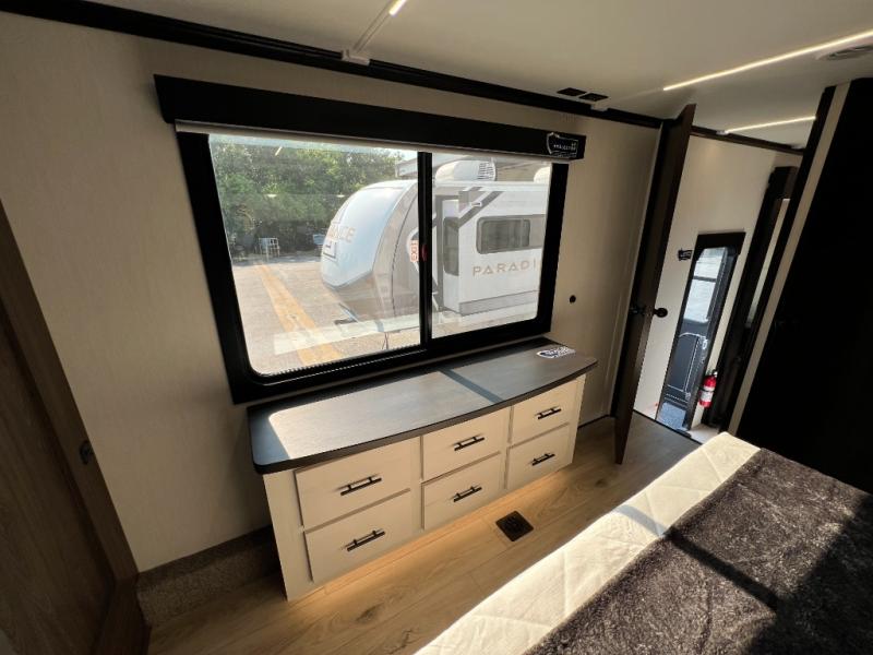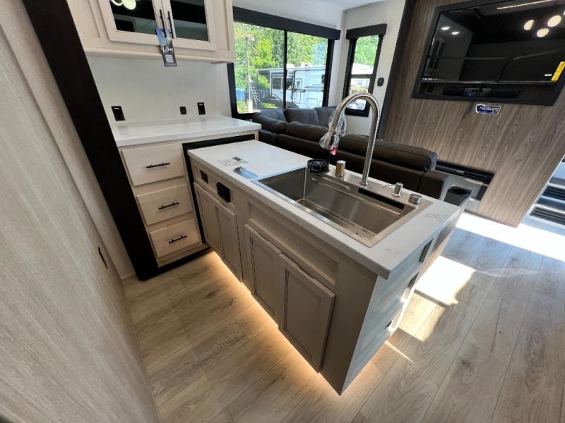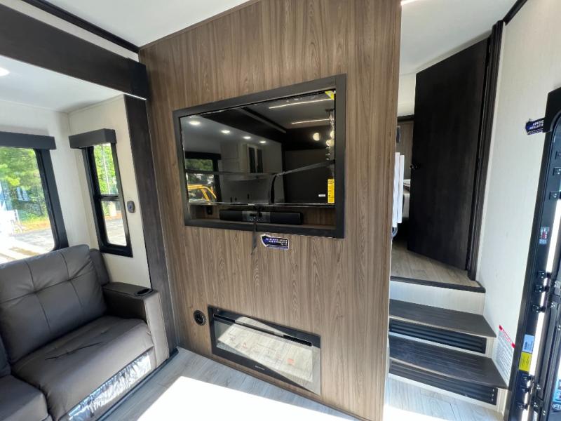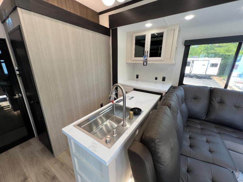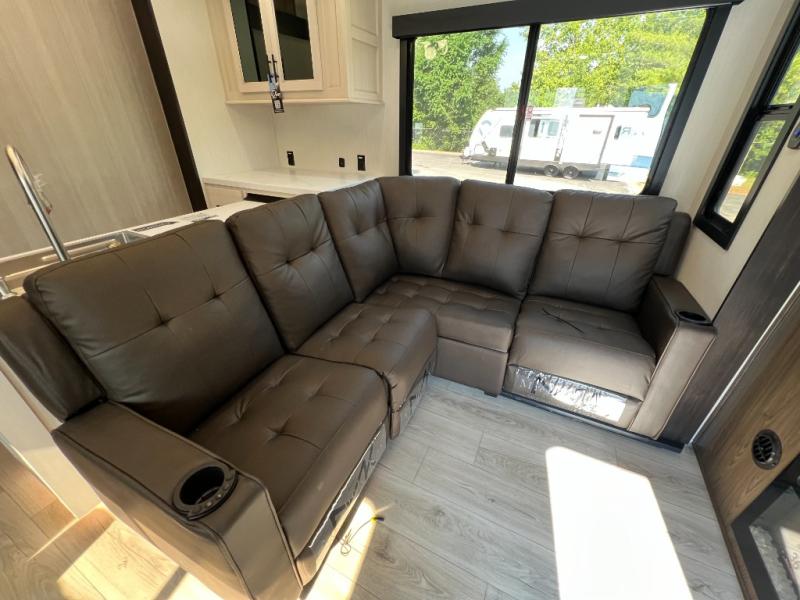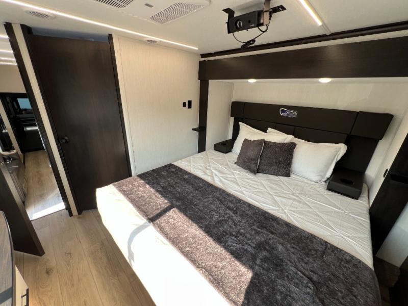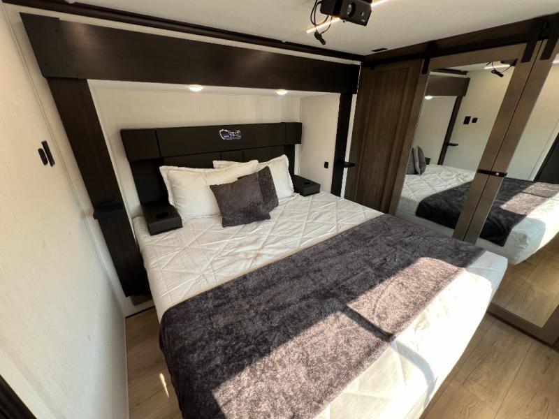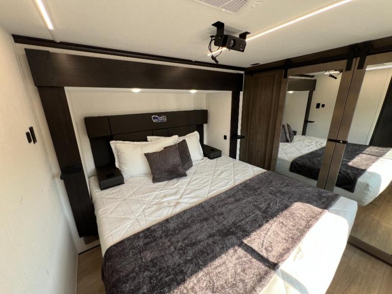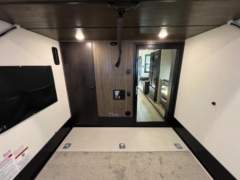 Hit the trails with this triple slide out toy hauler! Once your dirt bikes are unloaded from the 14' 6" garage, you can relax on the dual flip-up sofas with a free-standing table. There is also a raised queen bed above the sofas, a wet bath plus a loft, making this space perfect for guests! The chef of your group will find a counter peninsula to prep meals, a 12V black glass residential style refrigerator, plus a 30" microwave when you need to heat up leftovers. Your crew can get comfortable on the L-shaped sofa or the second sofa, and there is a large flat screen TV for movie night! Head up front to the master bedroom that includes a king bed slide out, a large front wardrobe and a dresser with a TV hookup, plus your own private full bathroom!