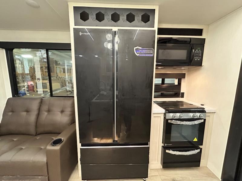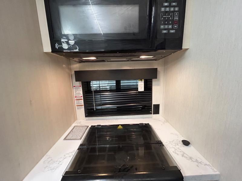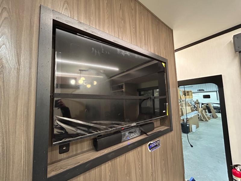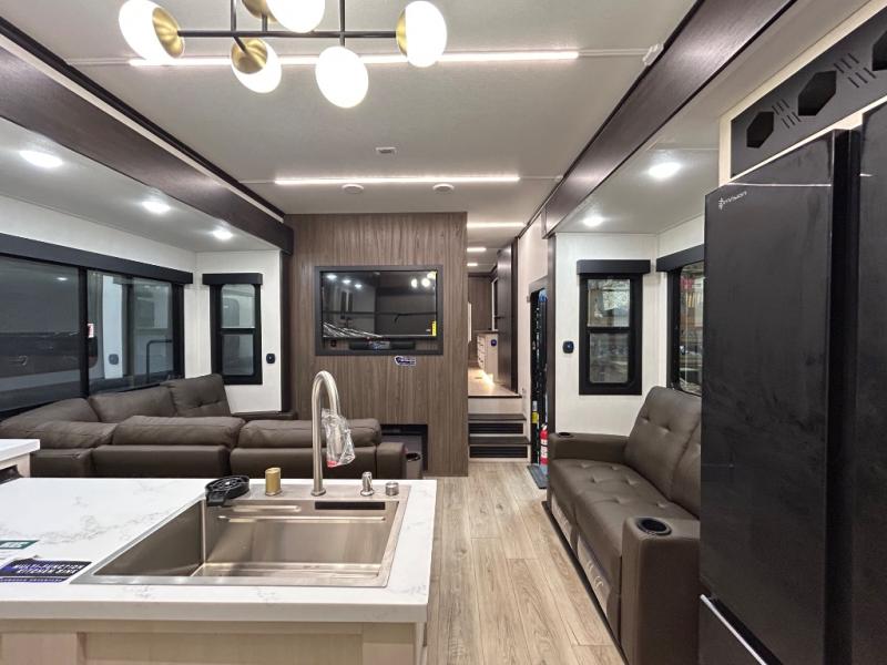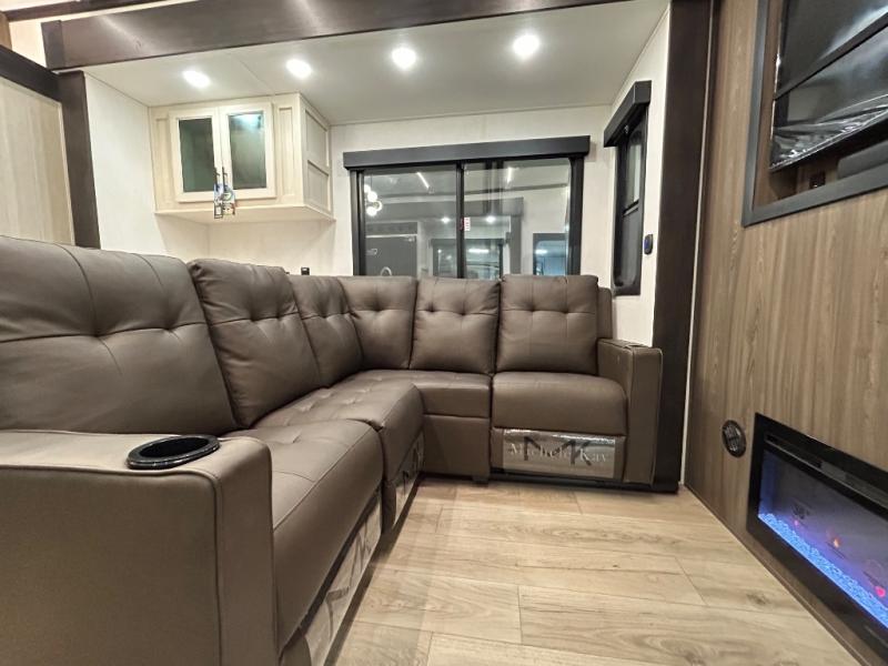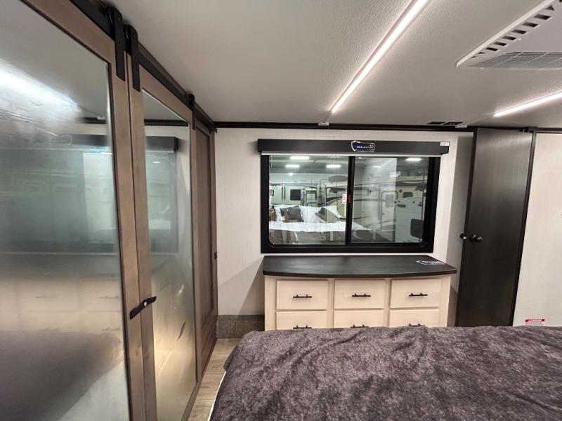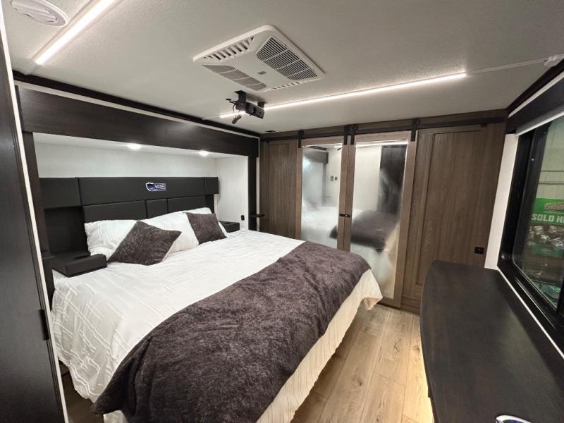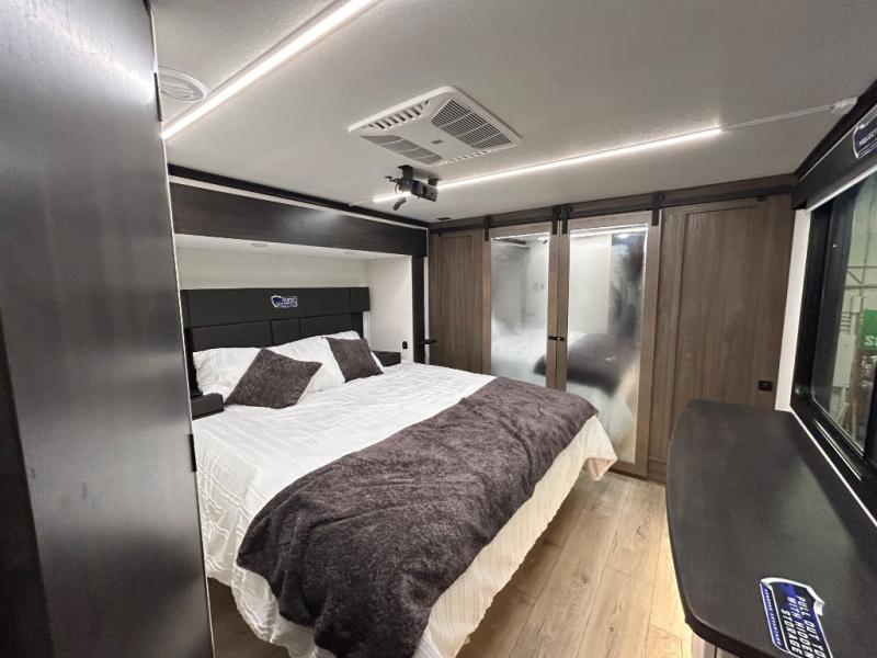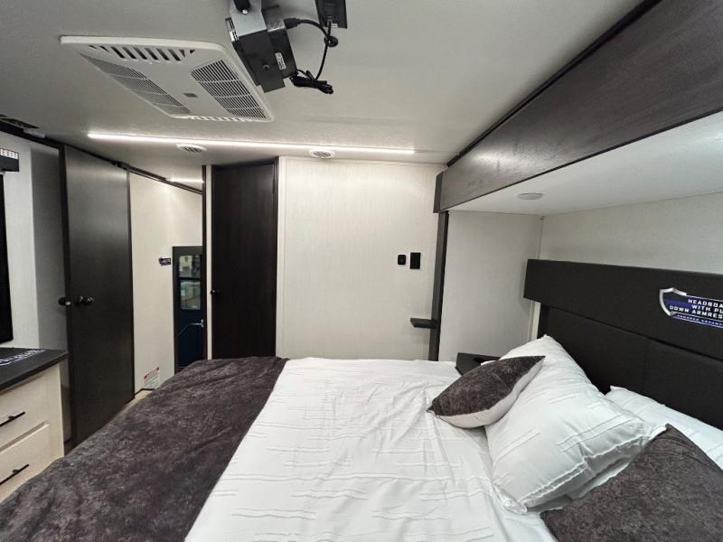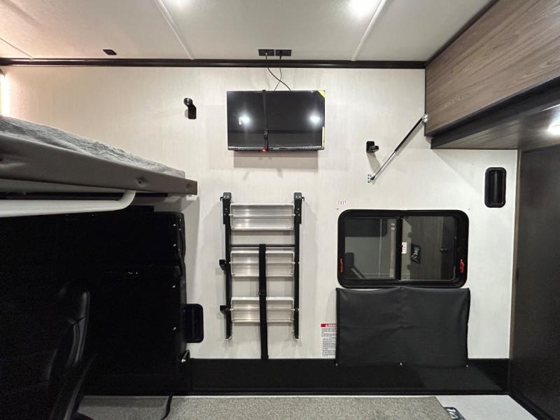Hit the trails with this triple slide out toy hauler! Once your dirt bikes are unloaded from the 14' 6" garage, you can relax on the dual flip-up sofas with a free-standing table. There is also a raised queen bed above the sofas, a wet bath plus a loft, making this space perfect for guests! The chef of your group will find a counter peninsula to prep meals, a 12V black glass residential style refrigerator, plus a 30" microwave when you need to heat up leftovers. Your crew can get comfortable on the L-shaped sofa or the second sofa, and there is a large flat screen TV for movie night! Head up front to the master bedroom that includes a king bed slide out, a large front wardrobe and a dresser with a TV hookup, plus your own private full bathroom!