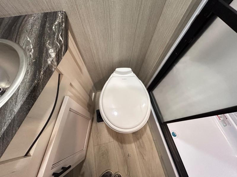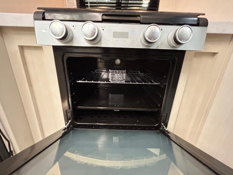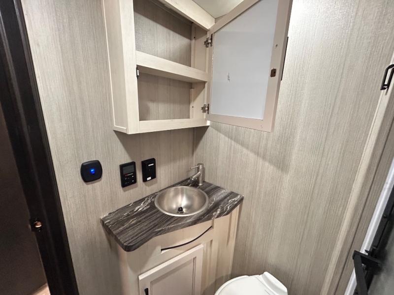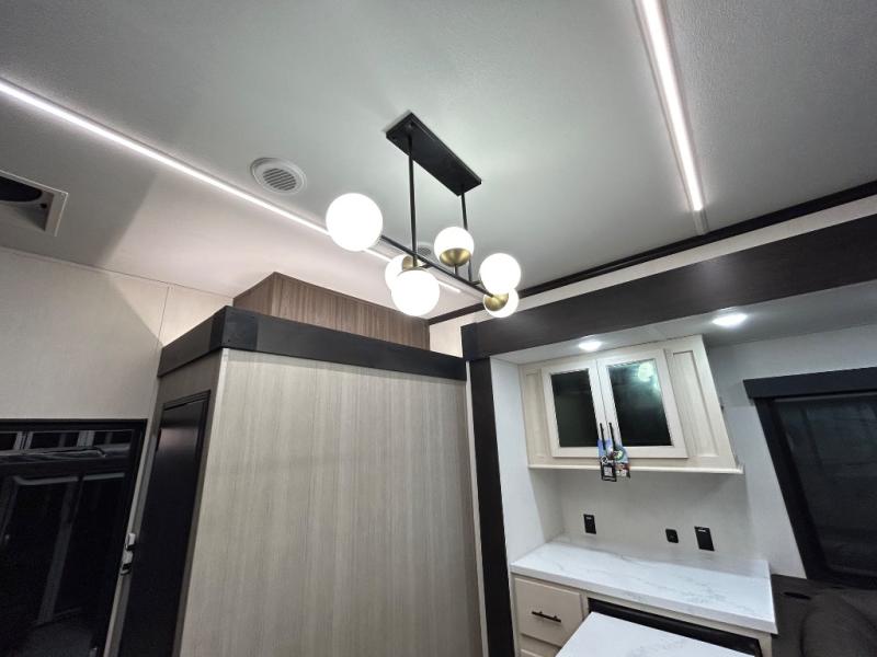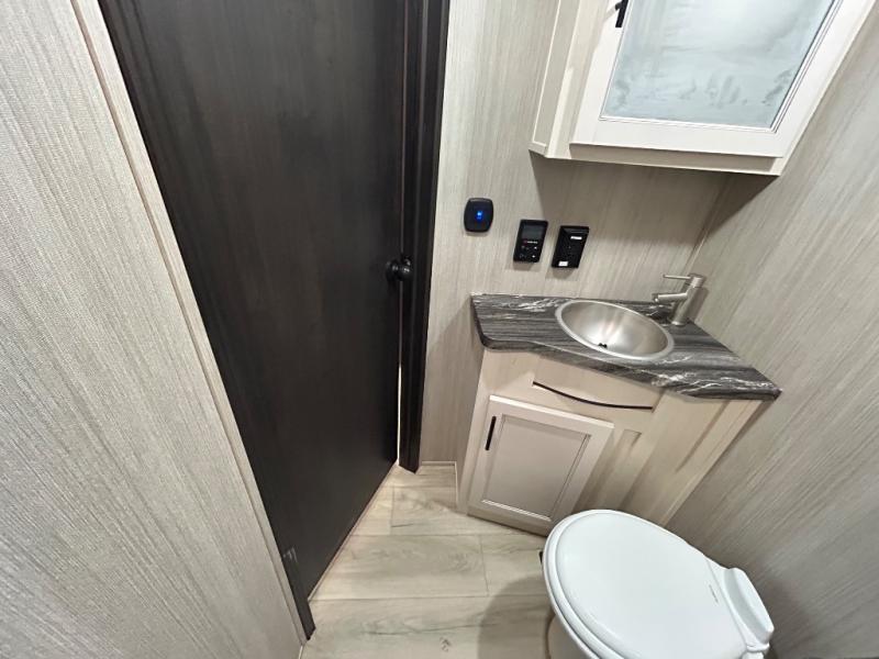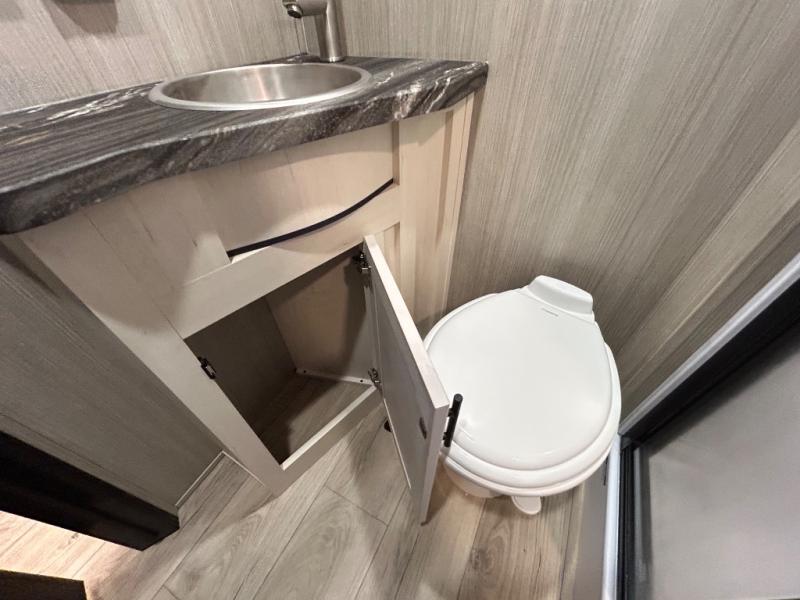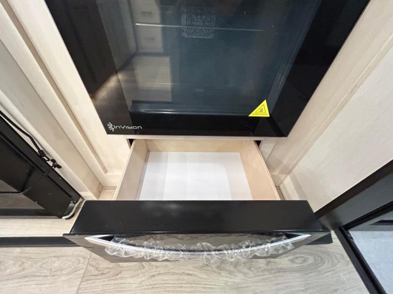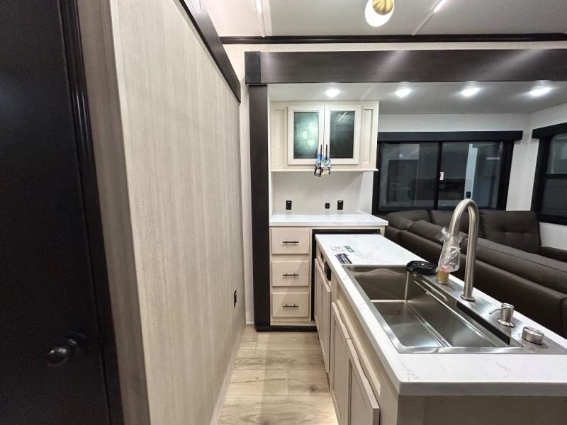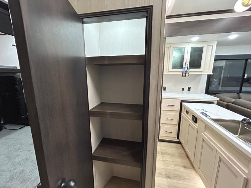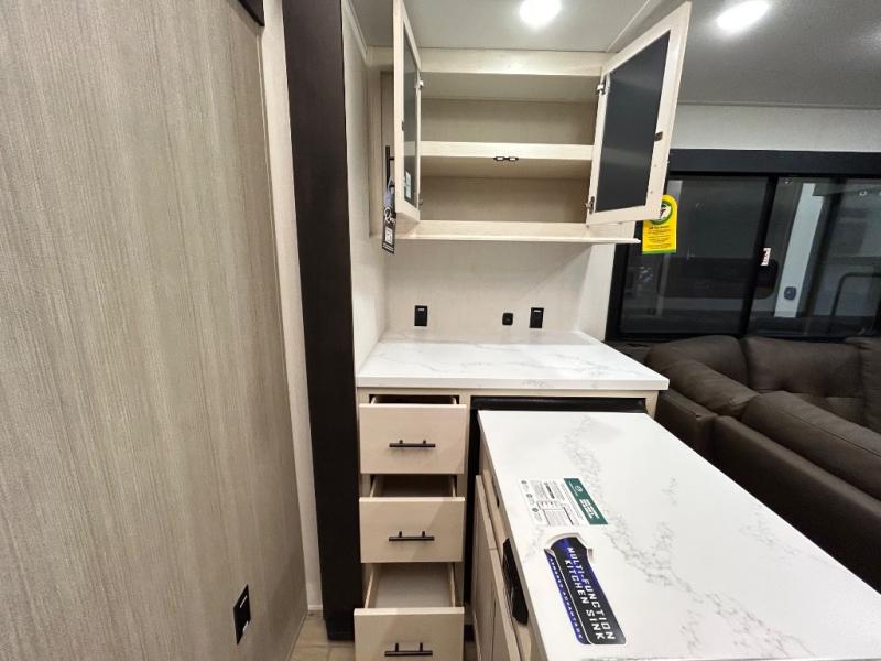 Hit the trails with this triple slide out toy hauler! Once your dirt bikes are unloaded from the 14' 6" garage, you can relax on the dual flip-up sofas with a free-standing table. There is also a raised queen bed above the sofas, a wet bath plus a loft, making this space perfect for guests! The chef of your group will find a counter peninsula to prep meals, a 12V black glass residential style refrigerator, plus a 30" microwave when you need to heat up leftovers. Your crew can get comfortable on the L-shaped sofa or the second sofa, and there is a large flat screen TV for movie night! Head up front to the master bedroom that includes a king bed slide out, a large front wardrobe and a dresser with a TV hookup, plus your own private full bathroom!
