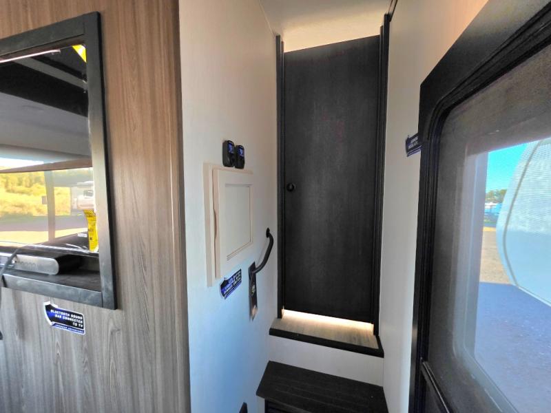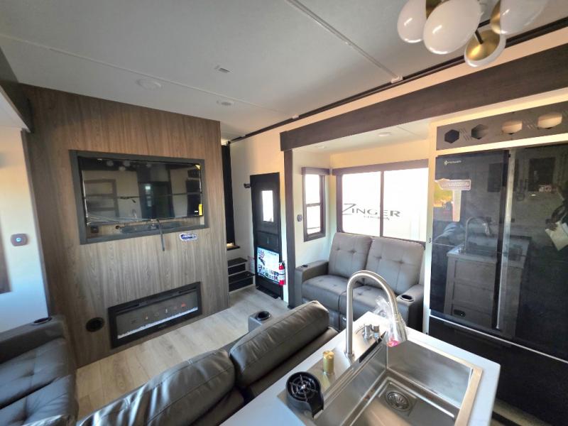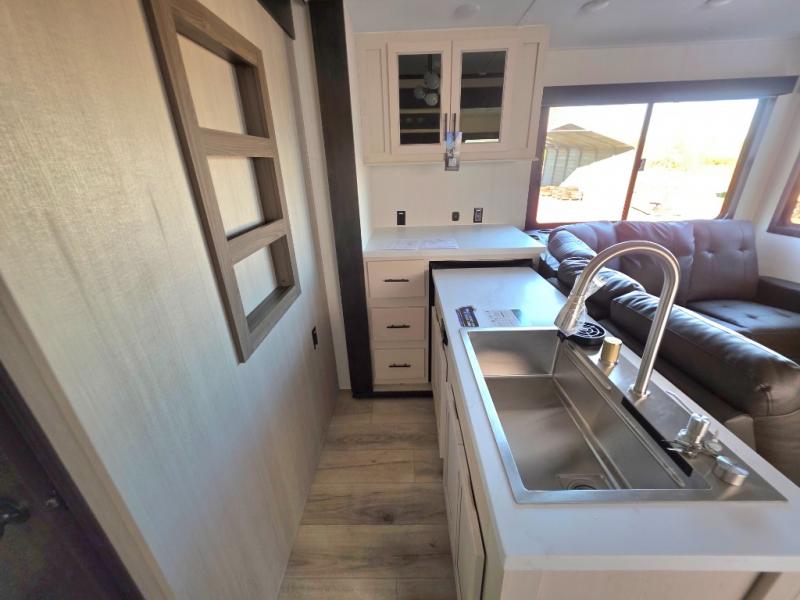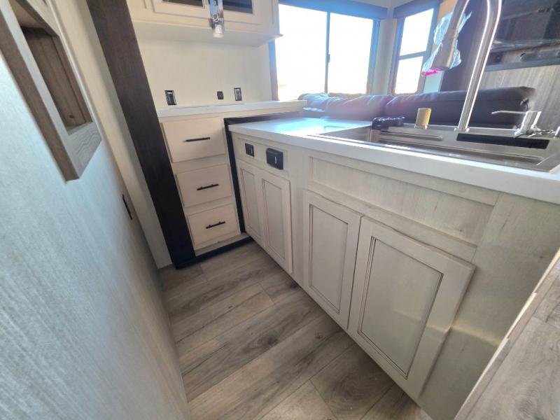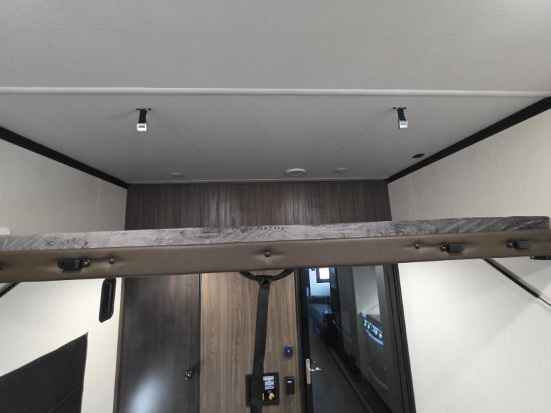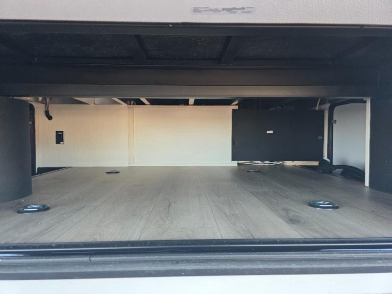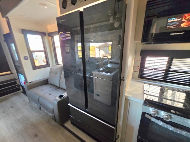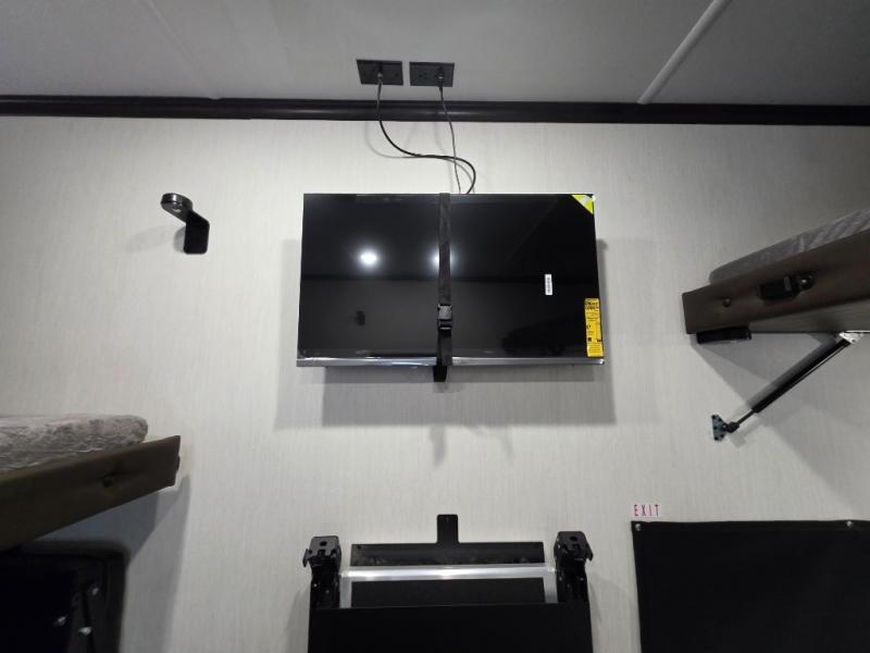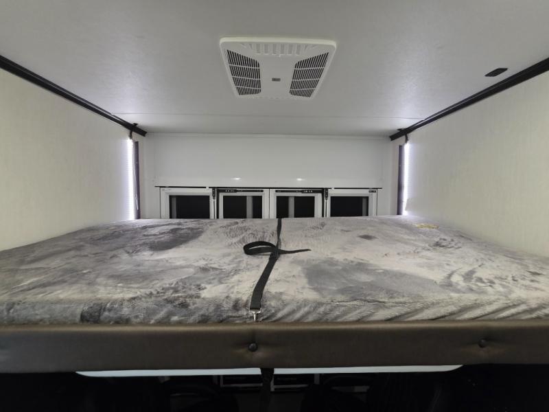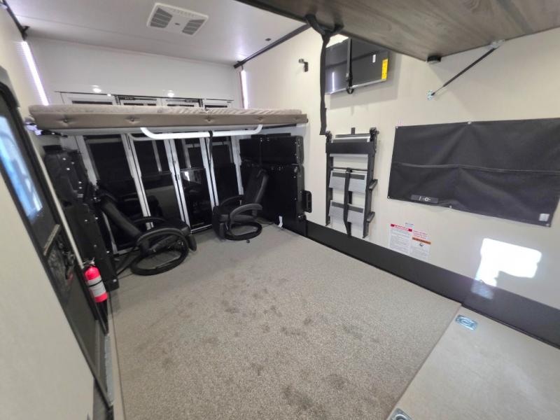 Hit the trails with this triple slide out toy hauler! Once your dirt bikes are unloaded from the 14' 6" garage, you can relax on the dual flip-up sofas with a free-standing table. There is also a raised queen bed above the sofas, a wet bath plus a loft, making this space perfect for guests! The chef of your group will find a counter peninsula to prep meals, a 12V black glass residential style refrigerator, plus a 30" microwave when you need to heat up leftovers. Your crew can get comfortable on the L-shaped sofa or the second sofa, and there is a large flat screen TV for movie night! Head up front to the master bedroom that includes a king bed slide out, a large front wardrobe and a dresser with a TV hookup, plus your own private full bathroom!