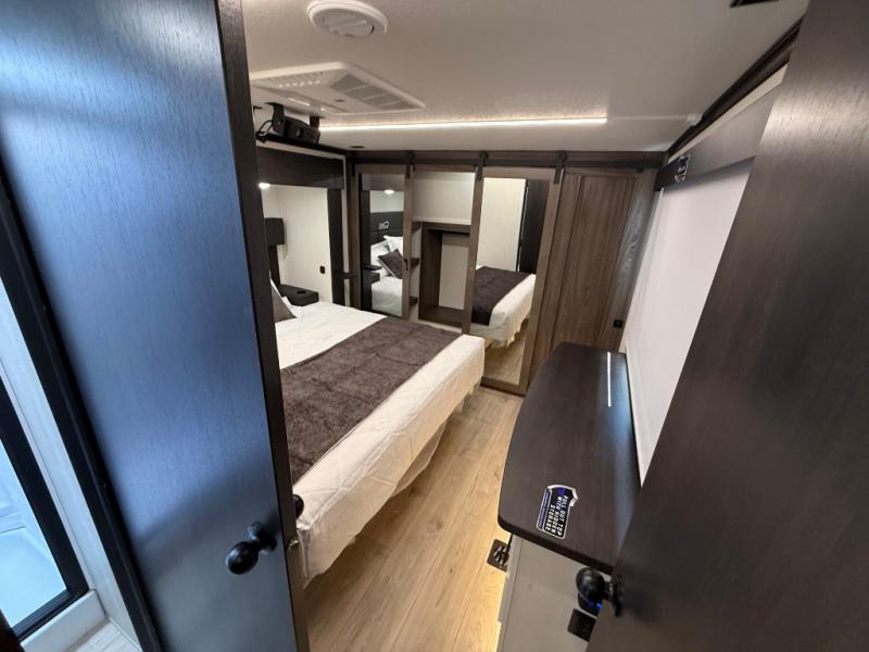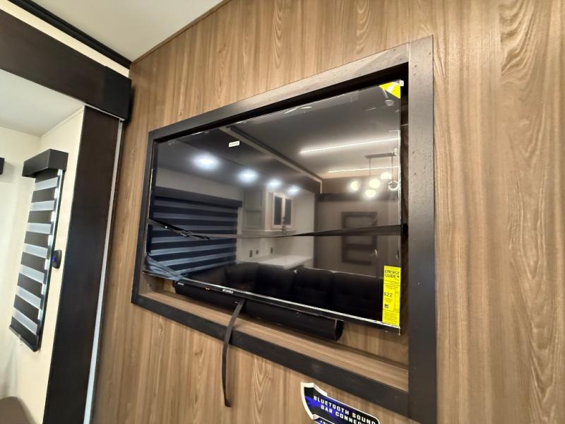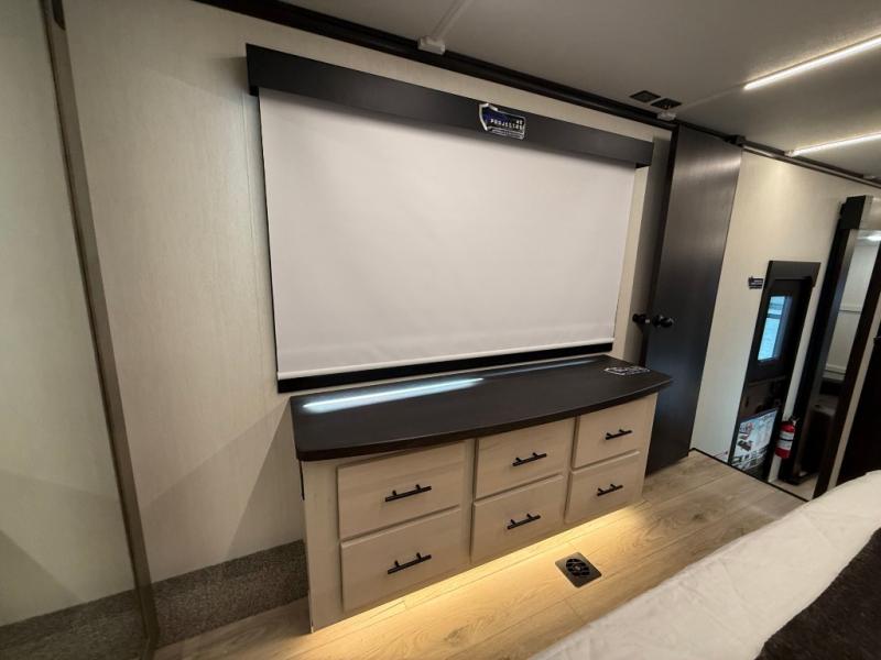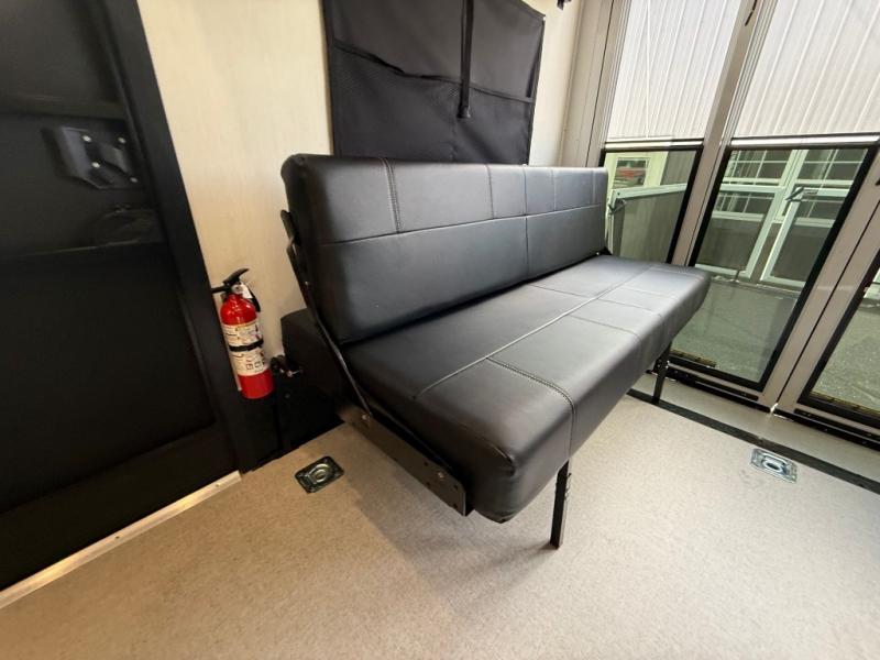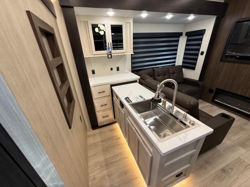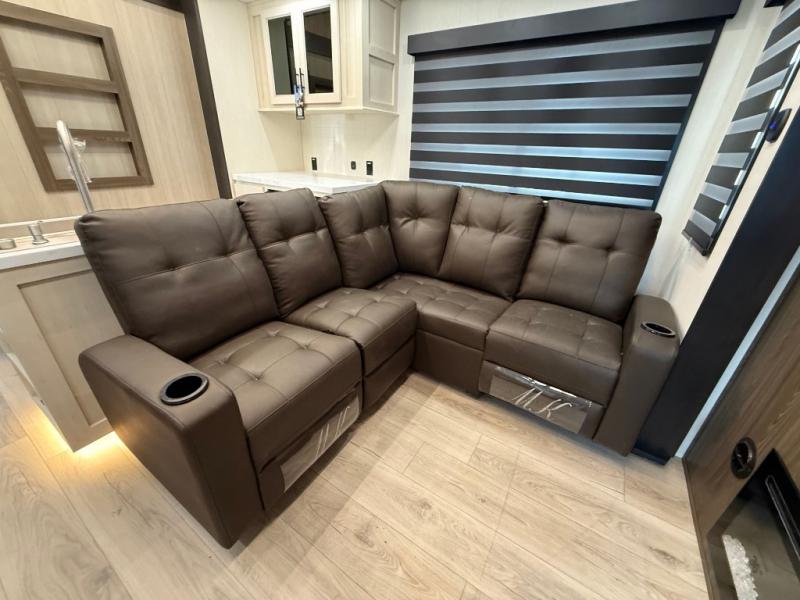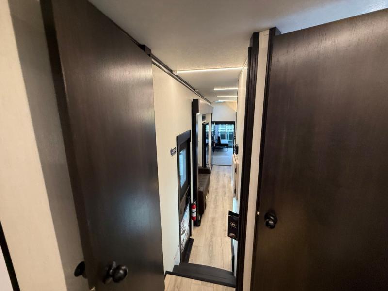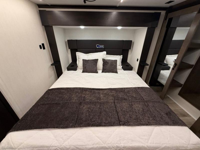 Hit the trails with this triple slide out toy hauler! Once your dirt bikes are unloaded from the 14' 6" garage, you can relax on the dual flip-up sofas with a free-standing table. There is also a raised queen bed above the sofas, a utility bath/shower plus a loft, making this space perfect for guests! The chef of your group will find a counter peninsula to prep meals, a 12V residential style refrigerator, plus a 30" microwave when you need to heat up leftovers. Your crew can get comfortable on the L-shaped sofa or the second sofa, and there is a fireplace to make it cozier! Head up front to the master bedroom that includes a king bed slide out, a large front wardrobe and a dresser, plus your own private full bathroom!