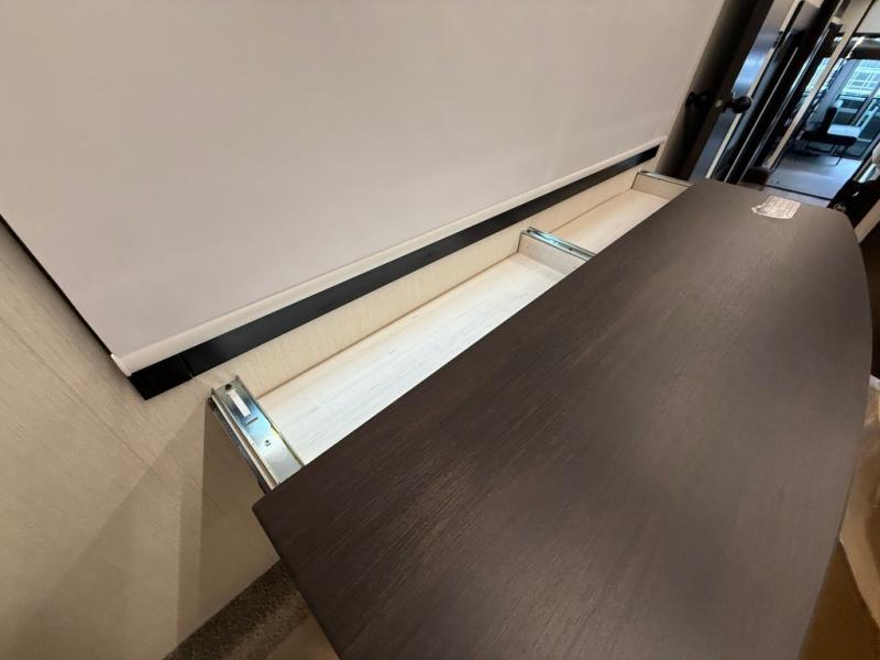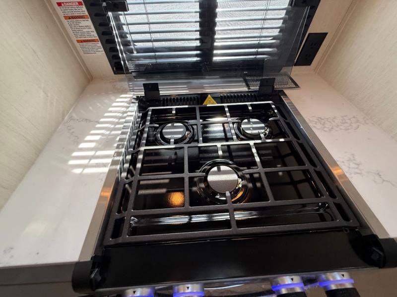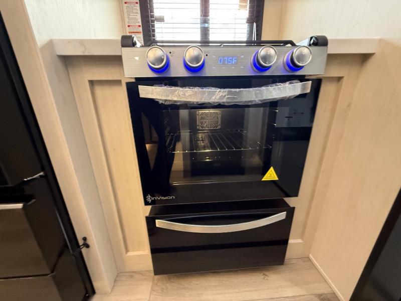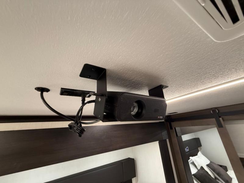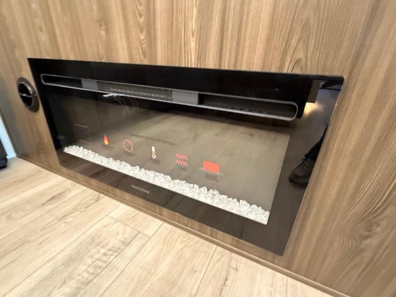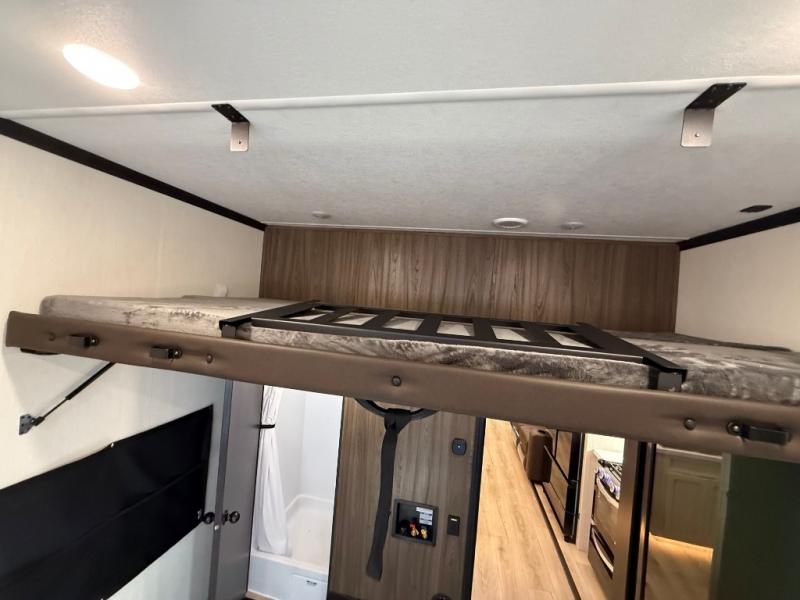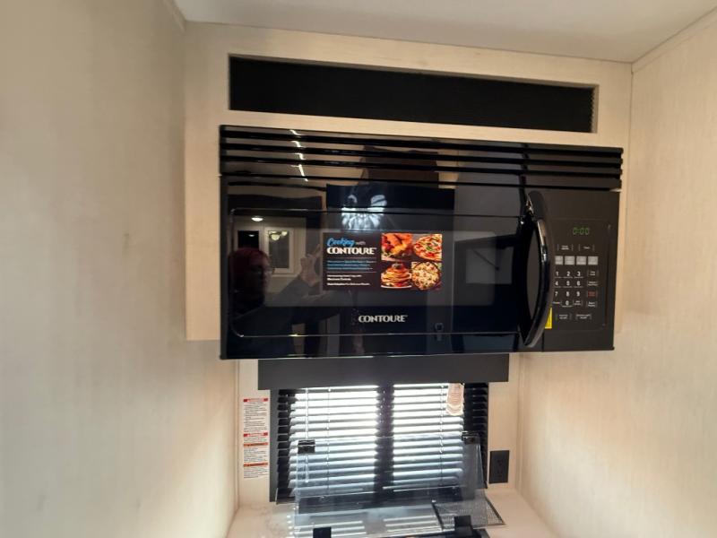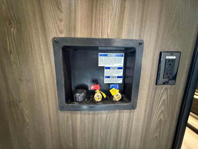 Hit the trails with this triple slide out toy hauler! Once your dirt bikes are unloaded from the 14' 6" garage, you can relax on the dual flip-up sofas with a free-standing table. There is also a raised queen bed above the sofas, a utility bath/shower plus a loft, making this space perfect for guests! The chef of your group will find a counter peninsula to prep meals, a 12V residential style refrigerator, plus a 30" microwave when you need to heat up leftovers. Your crew can get comfortable on the L-shaped sofa or the second sofa, and there is a fireplace to make it cozier! Head up front to the master bedroom that includes a king bed slide out, a large front wardrobe and a dresser, plus your own private full bathroom!