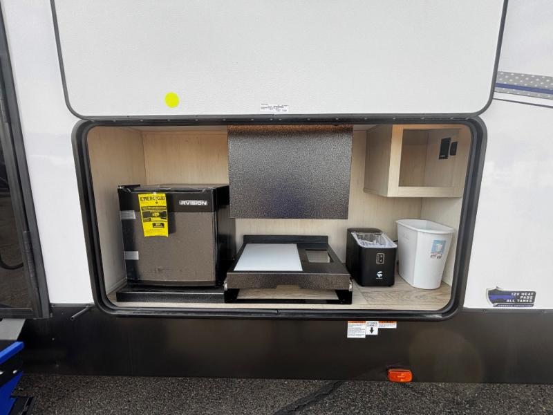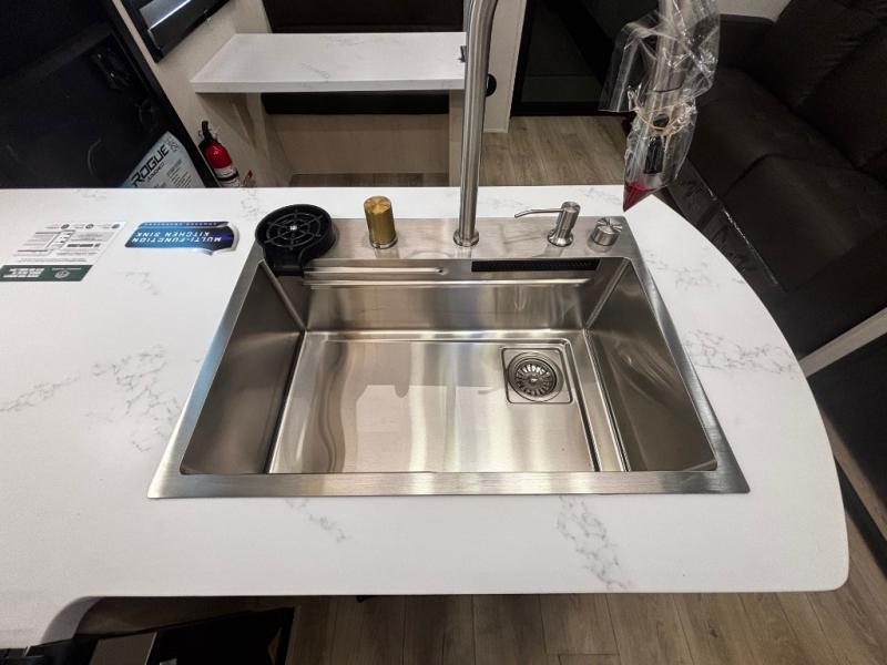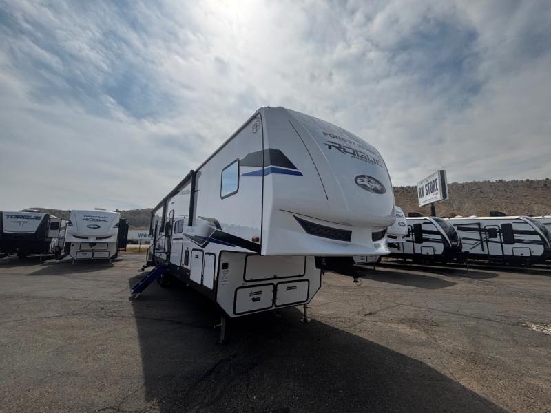 Every one of these Forest River Vengeance Rogue Armored fifth wheel toy haulers come with the features you want most at an affordable price tag! The DuraPoxy gas/oil resistant floor has 5,000 lb. tie downs to ensure your toys will arrive safely without damaging the flooring, plus the 3,000 lb. rated ramp door makes it easy to load them. Two 15,000 BTU A/Cs are "Super H Ducted" to keep you cool even on the hottest summer days, and an Armored underbelly helps keep your unit's vitals protected. The Rogue Ready package comes with a six point leveling system, a power MAXX storage system, a TST tire pressure monitoring system, and many more stand-out features. And don't overlook the Rogue Premium Package with an 8' weatherproof ramp door, an exterior TV hookup for the option to add a television, blue accent wheels, and solar reflective safety glass windows to name a few conveniences.