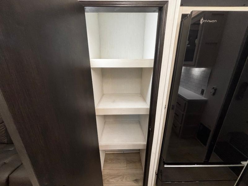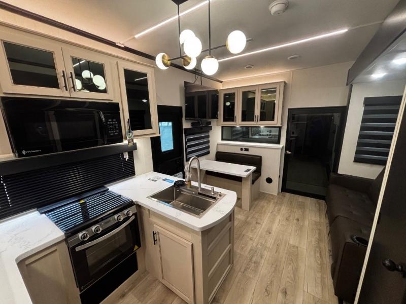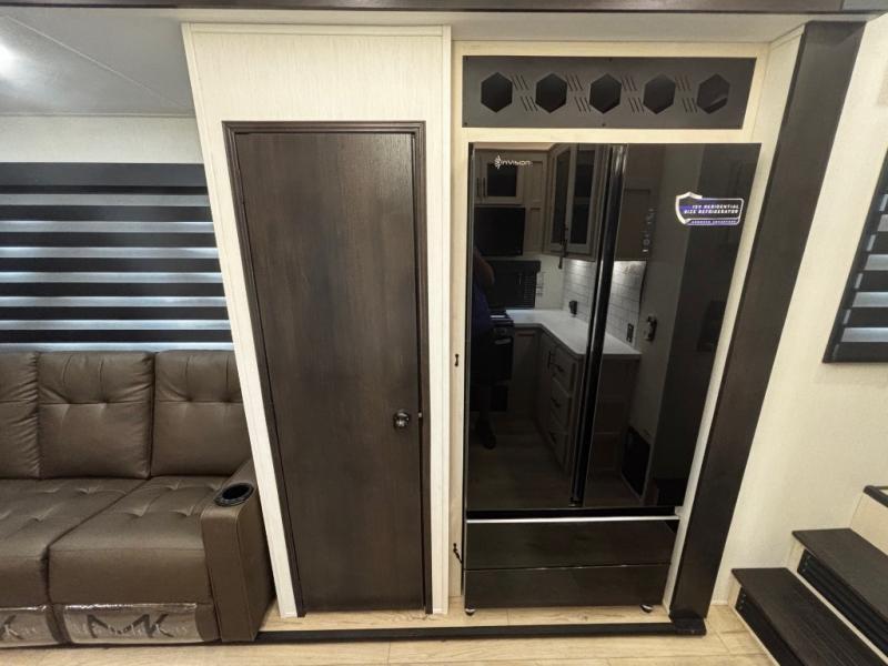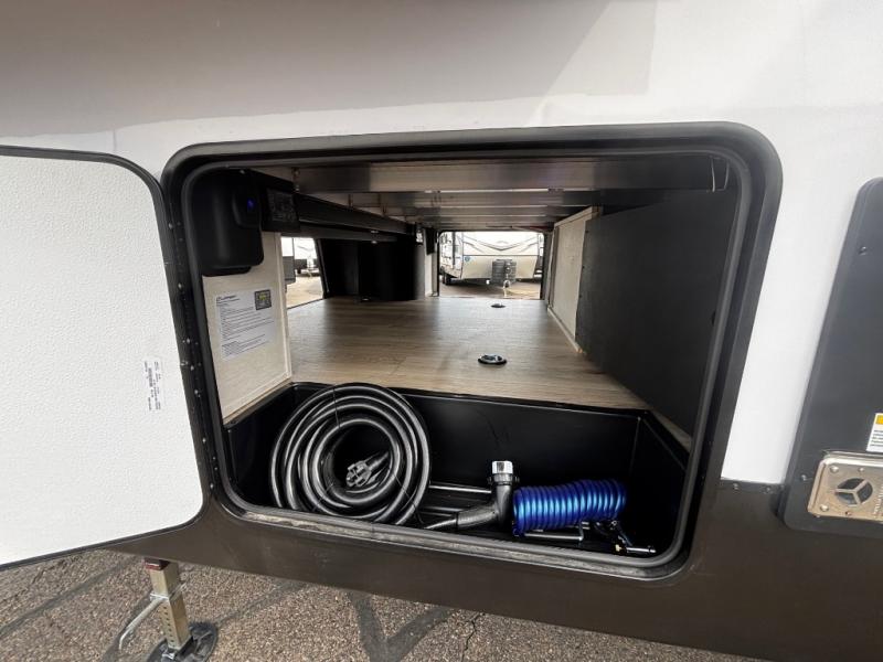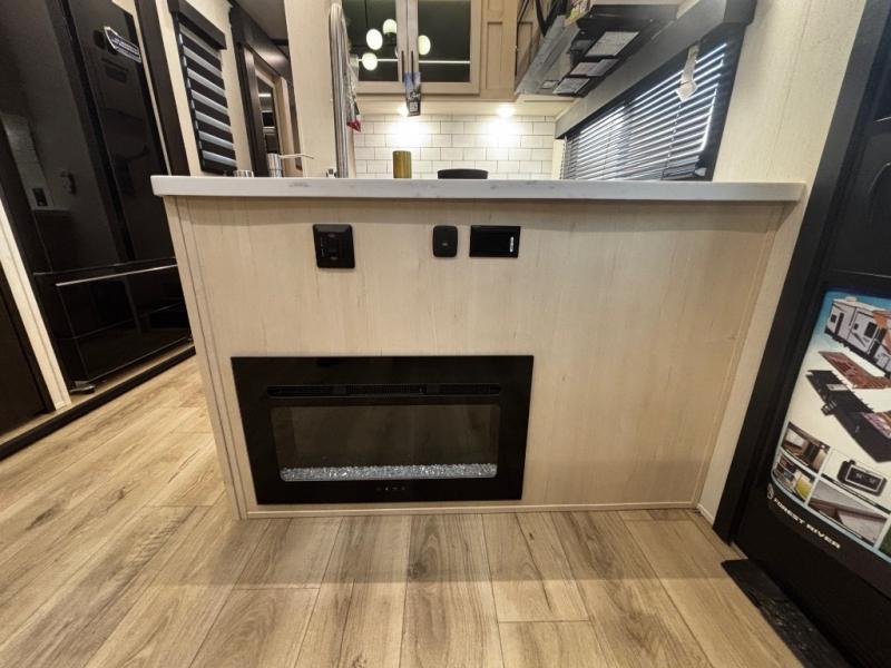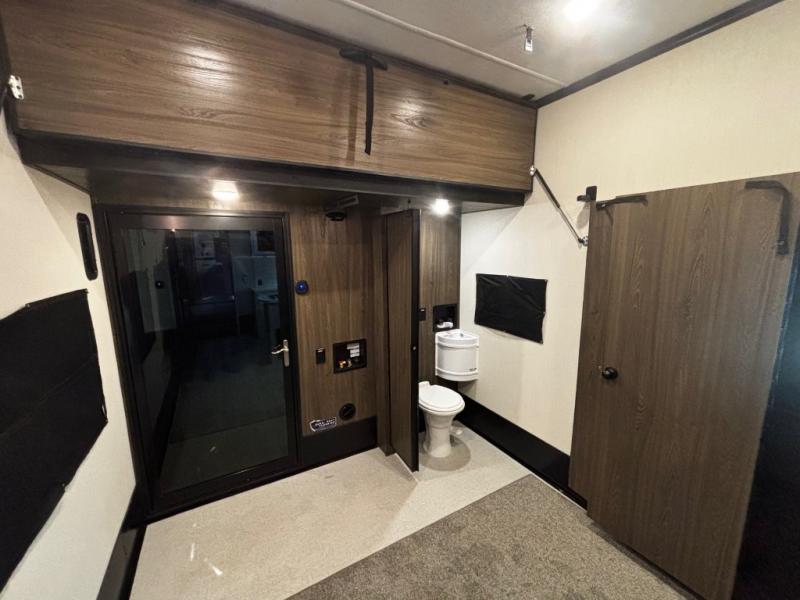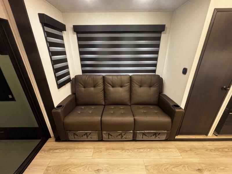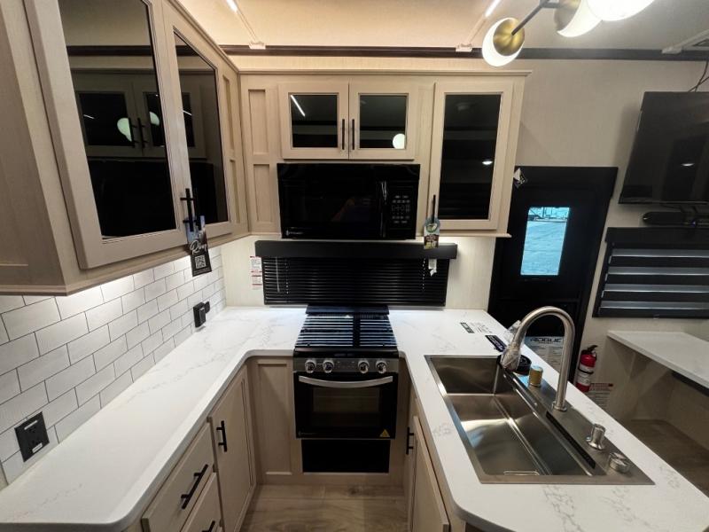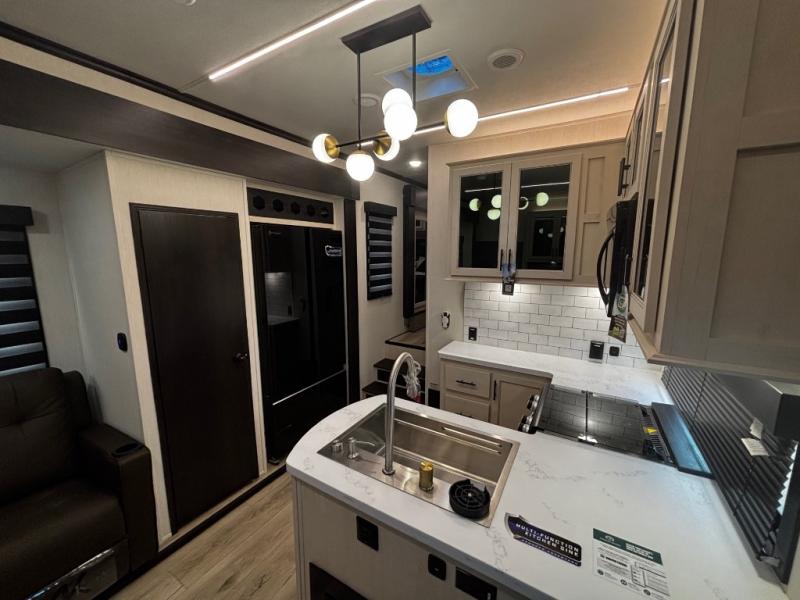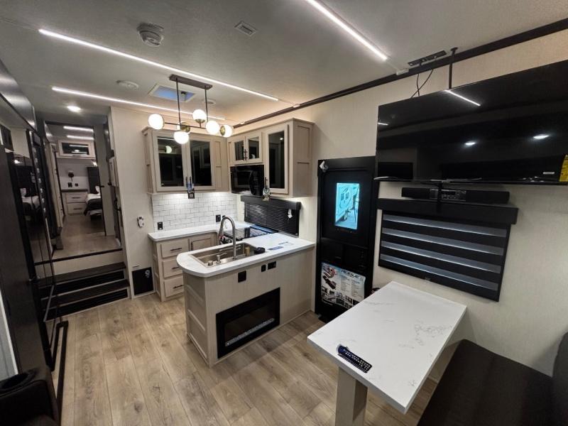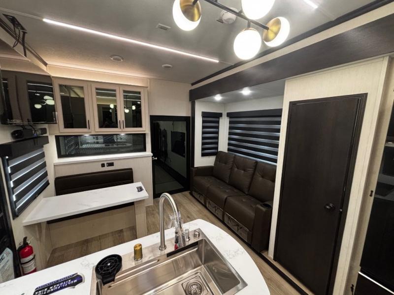 The whole gang can join in on the fun with this fifth wheel toy hauler! Everyone will have a comfortable place to sleep between the king bed in the front private bedroom, the raised queen bed above the flip-up sofas as well as loft space in the garage area, plus you can even use the sofa in the living area if needed. The large kitchen pantry is big enough to hold your favorite snacks and the dinette with a bench seat is another place to enjoy your meals comfortably. You are sure to appreciate that this unit features two entry/exit doors as well as the rear ramp making it easy to load and unload, and when needing access to the garage space with all of your gear you don't have to come through the main living area. Two awnings offer you plenty of protected outdoor space so you can enjoy the fresh air as much as you like, even if the weather isn't perfect.