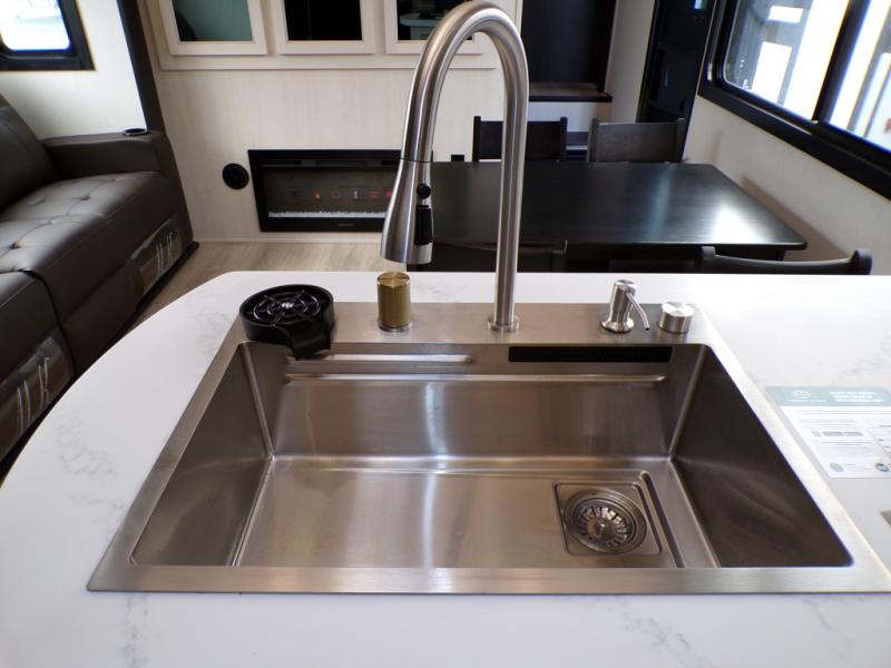 This toy hauler is perfect for a larger group since it can sleep up to eight with the added loft in the garage. There are also dual flip-up sofas here, along with a queen bed above and a half bath for added convenience! The dual entry full bath is up front, creating a master bedroom you are sure to love. There is a king bed slide out, a front wardrobe, and a dresser to keep your things organized. Head to the middle kitchen and living room to relax on the sofa within the large slide out, dine at the table with four chairs, and cook in the full kitchen. This unit also includes a fireplace to make it cozier, a large pantry to keep snacks stocked, and dual power awnings to expand your living space outdoors!