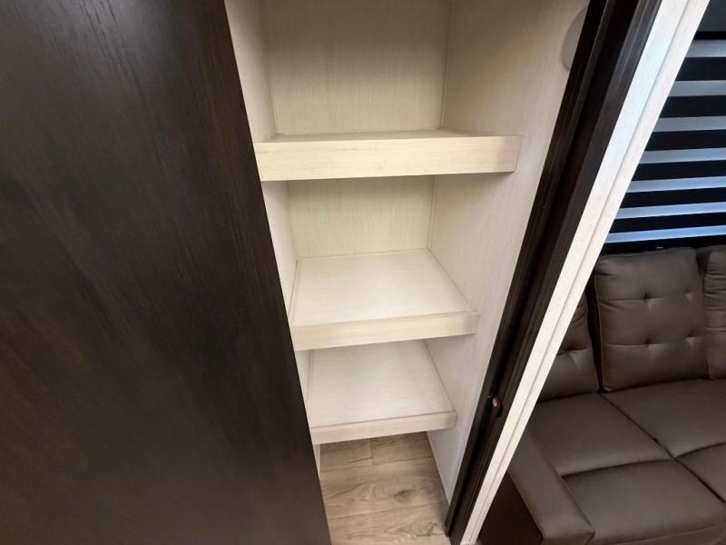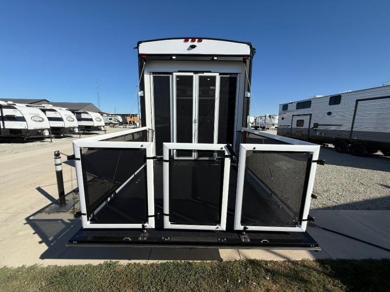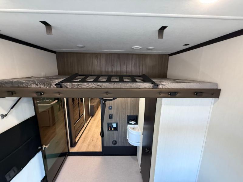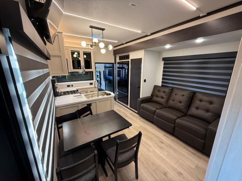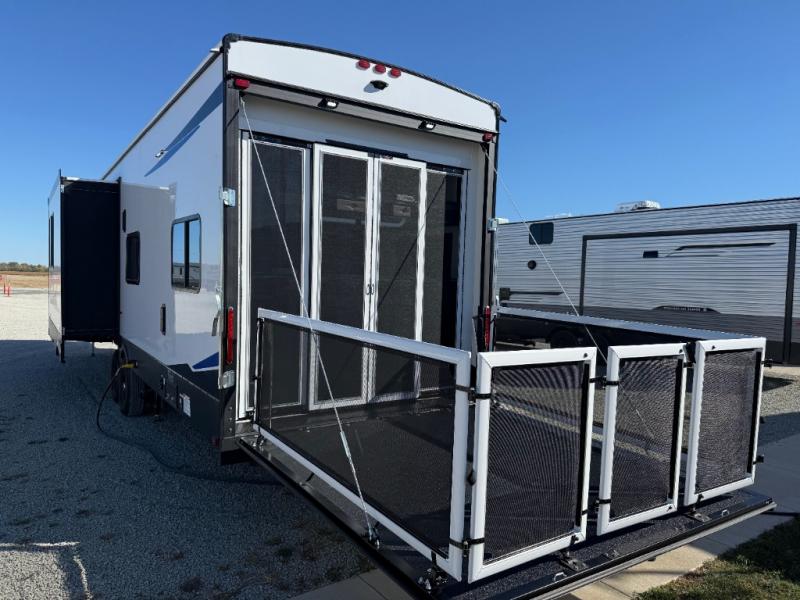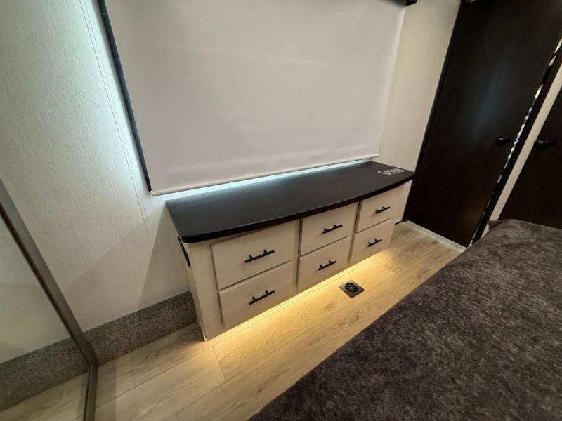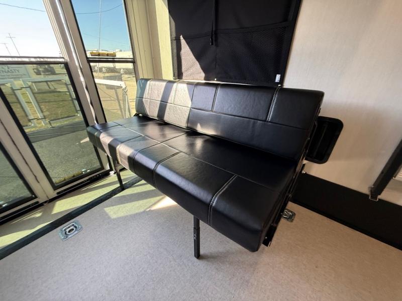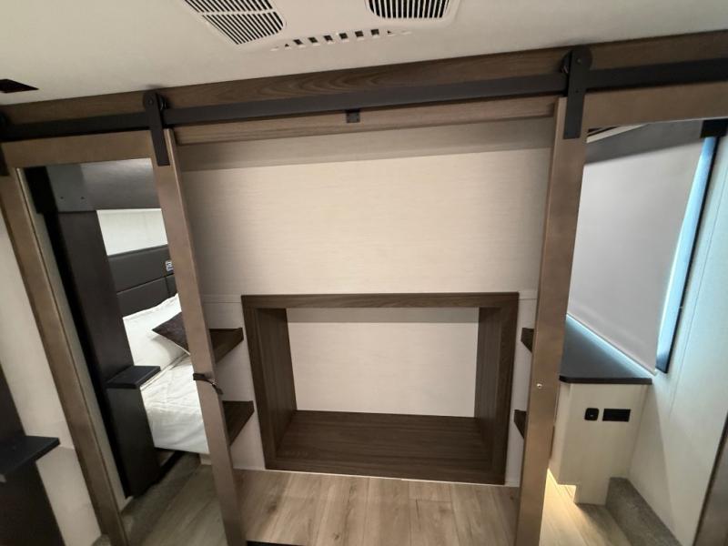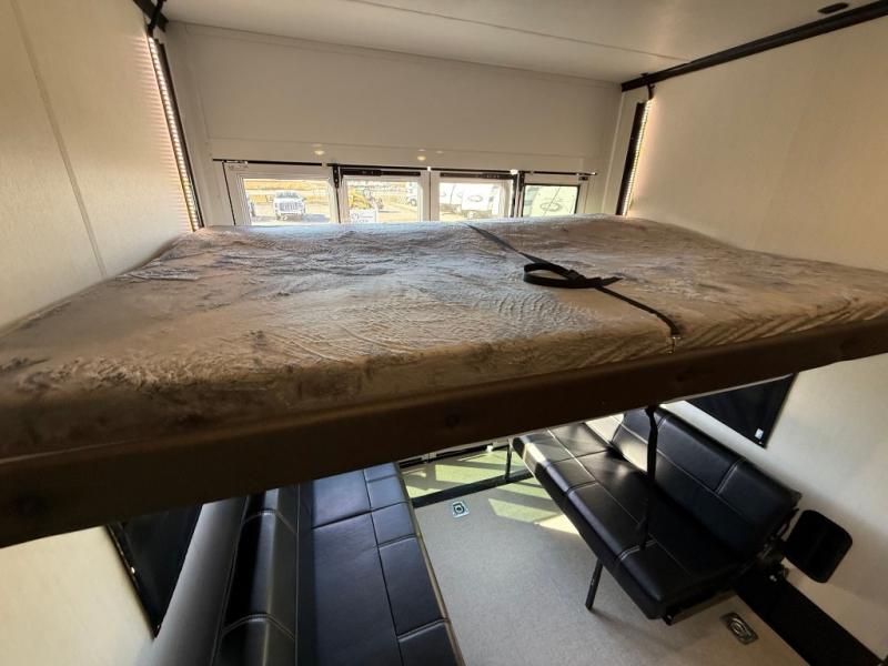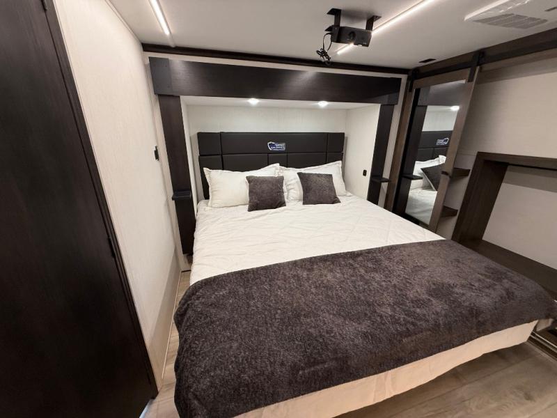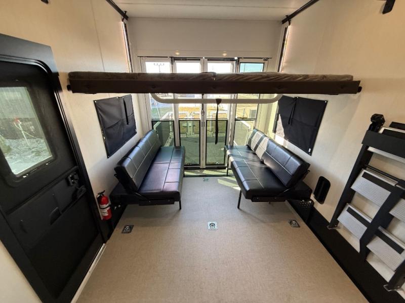 This toy hauler is perfect for a larger group since it can sleep up to eight with the added loft in the garage. There are also dual flip-up sofas here, along with a queen bed above and a half bath for added convenience! The dual entry full bath is up front, creating a master bedroom you are sure to love. There is a king bed slide out, a front wardrobe, and a dresser to keep your things organized. Head to the middle kitchen and living room to relax on the sofa within the large slide out, dine at the table with four chairs, and cook in the full kitchen. This unit also includes a fireplace to make it cozier, a large pantry to keep snacks stocked, and dual power awnings to expand your living space outdoors!