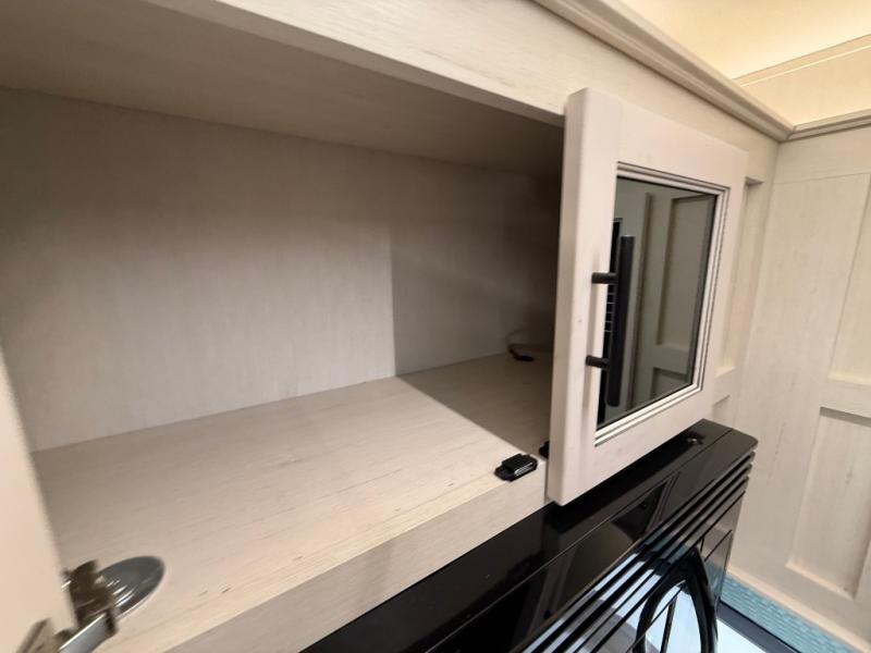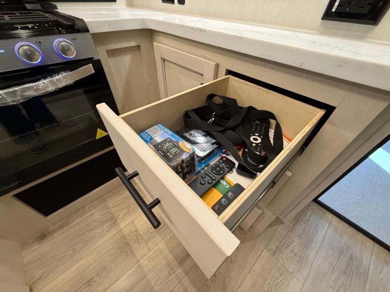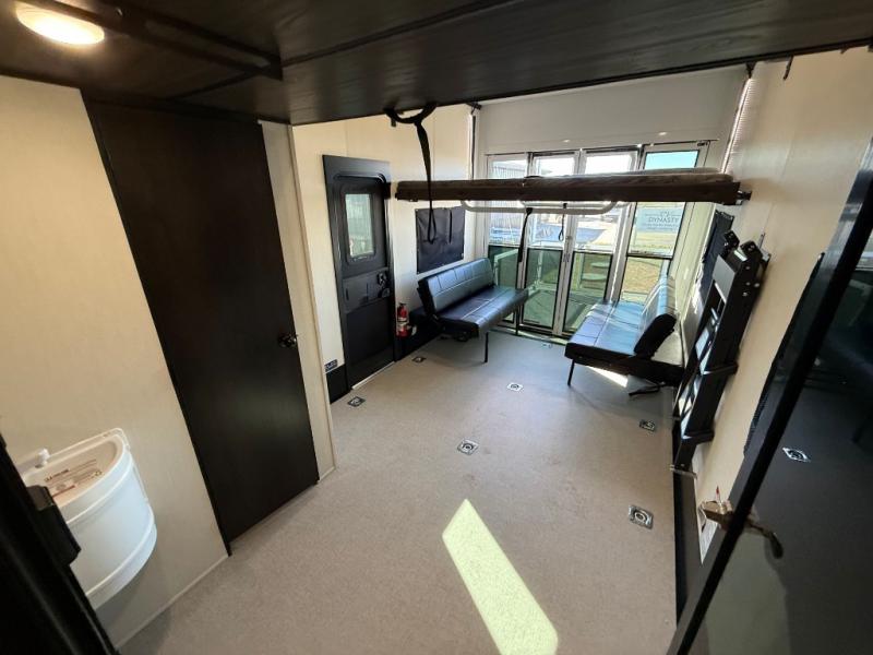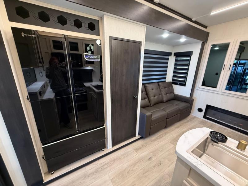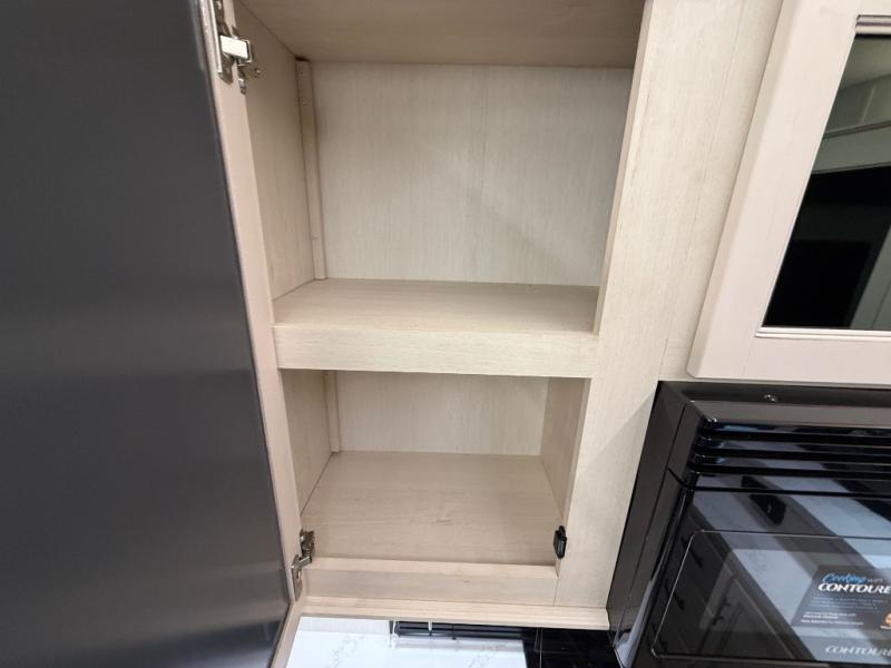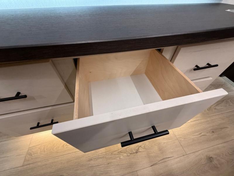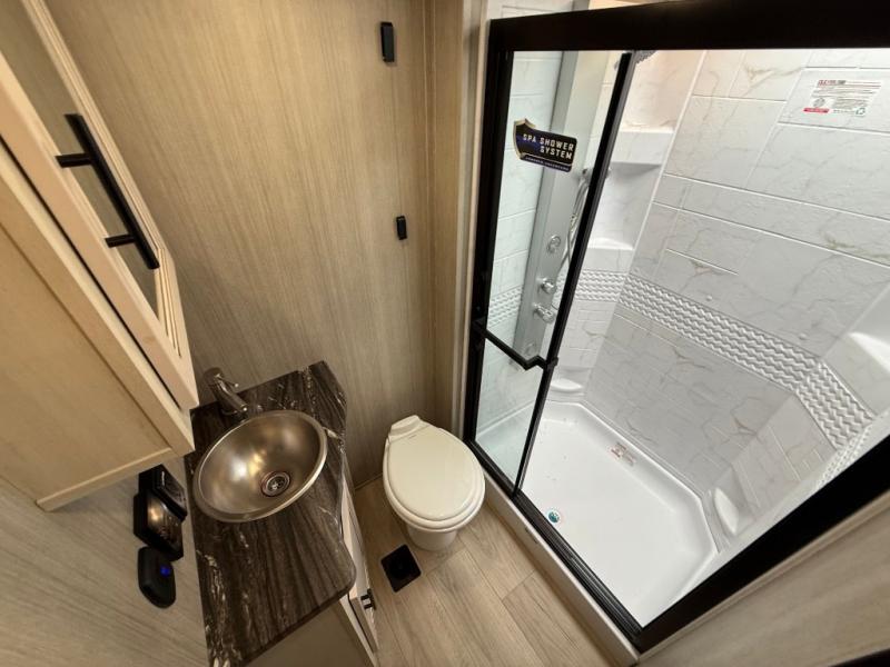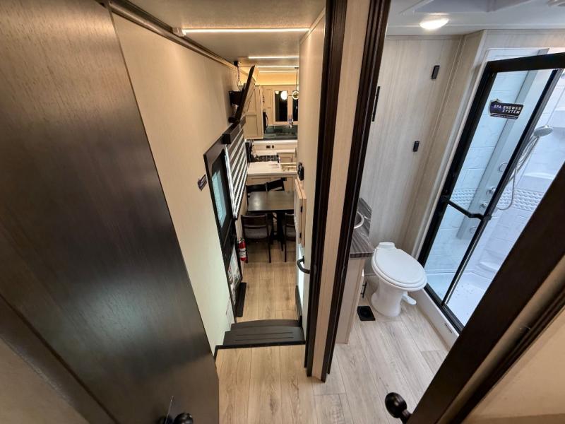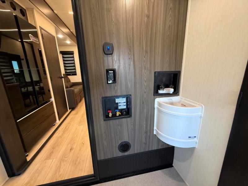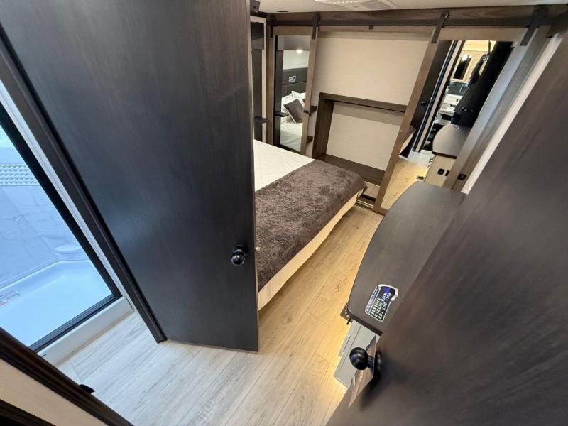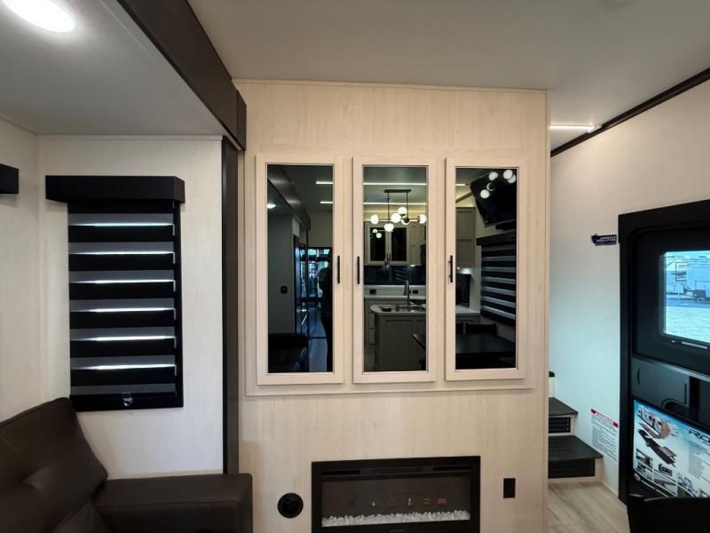 This toy hauler is perfect for a larger group since it can sleep up to eight with the added loft in the garage. There are also dual flip-up sofas here, along with a queen bed above and a half bath for added convenience! The dual entry full bath is up front, creating a master bedroom you are sure to love. There is a king bed slide out, a front wardrobe, and a dresser to keep your things organized. Head to the middle kitchen and living room to relax on the sofa within the large slide out, dine at the table with four chairs, and cook in the full kitchen. This unit also includes a fireplace to make it cozier, a large pantry to keep snacks stocked, and dual power awnings to expand your living space outdoors!
