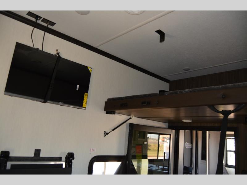 This toy hauler is perfect for a larger group since it can sleep up to eight with the added loft in the garage. There are also dual flip-up sofas here, along with a queen bed above and a half bath for added convenience! The dual entry full bath is up front, creating a master bedroom you are sure to love. There is a king bed slide out, a front wardrobe, and a dresser to keep your things organized. Head to the middle kitchen and living room to relax on the sofa within the large slide out, dine at the table with four chairs, and cook in the full kitchen. This unit also includes a fireplace to make it cozier, a large pantry to keep snacks stocked, and dual power awnings to expand your living space outdoors!
