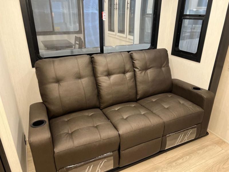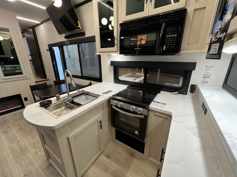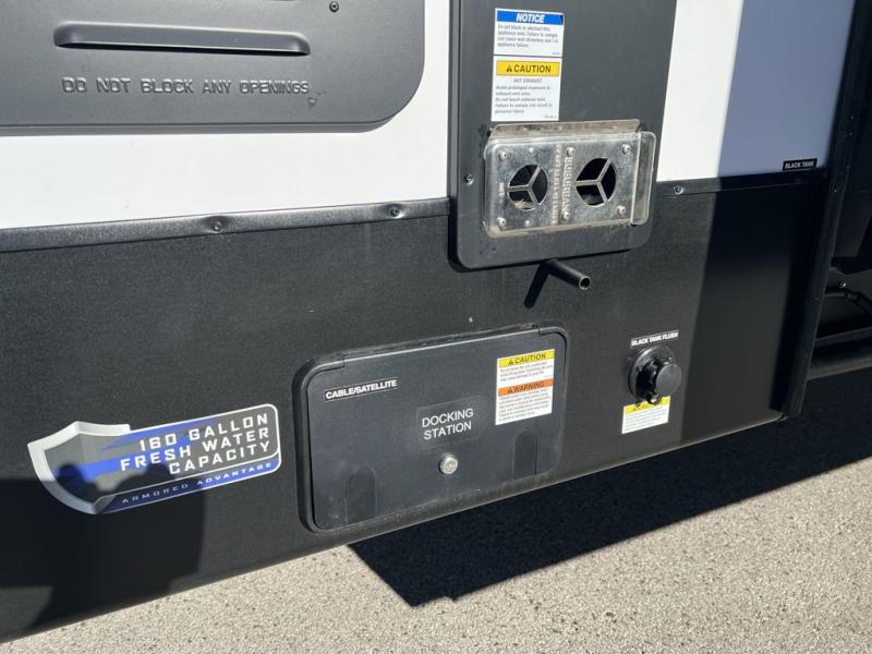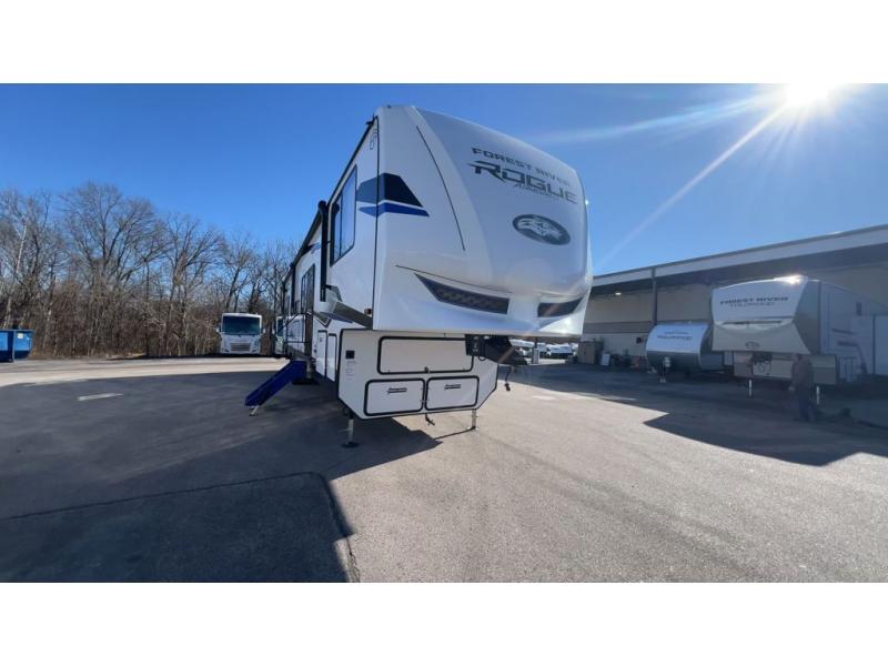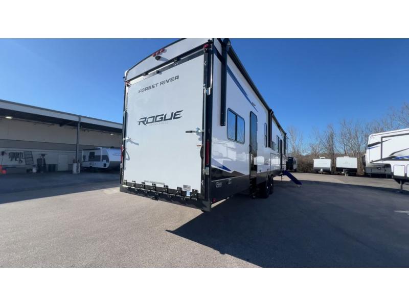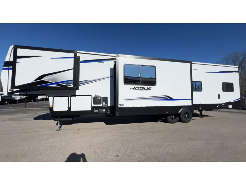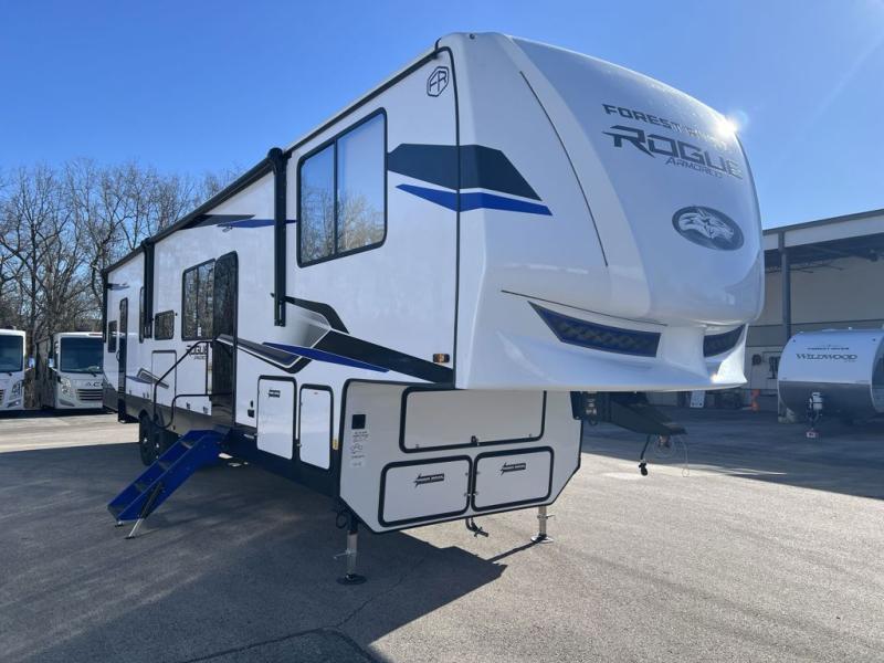 Every one of these Forest River Vengeance Rogue Armored fifth wheel toy haulers come with the features you want most at an affordable price tag! The DuraPoxy gas/oil resistant floor has 5,000 lb. tie downs to ensure your toys will arrive safely without damaging the flooring, plus the 3,000 lb. rated ramp door makes it easy to load them. Two 15,000 BTU A/Cs are "Super H Ducted" to keep you cool even on the hottest summer days, and the heated enclosed holding tanks help protect against the elements. Each model also includes a 6-point leveling system, dual LED cargo lights, solar reflective windows, and a tire pressure monitoring system. Inside, you'll enjoy the solid surface countertops, glass shower door, zebra shades in the living room, and stainless-steel multi-purpose sink to name a few comforts!