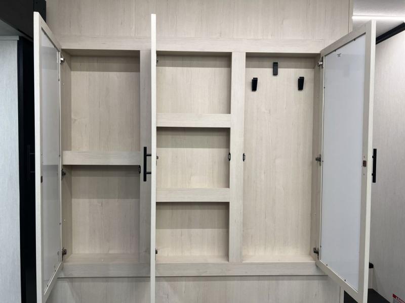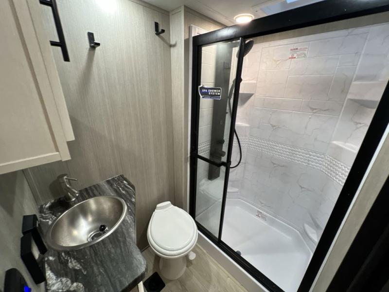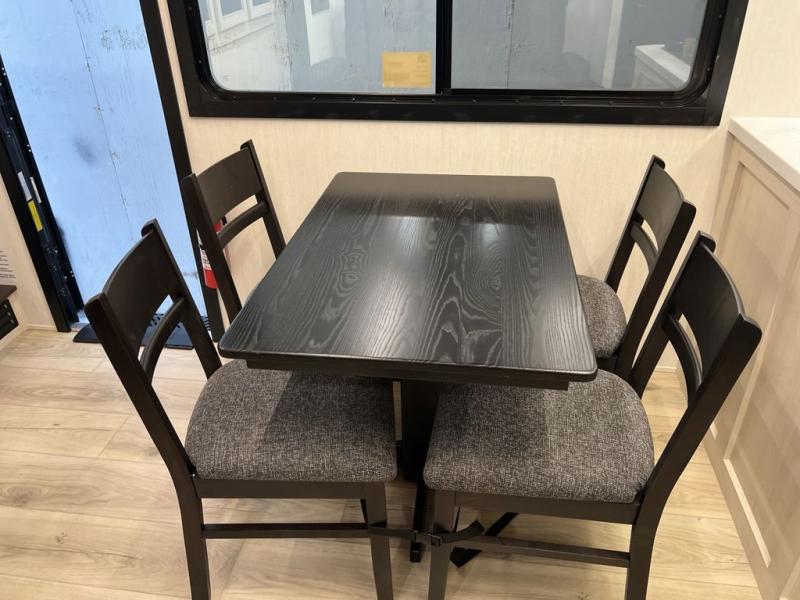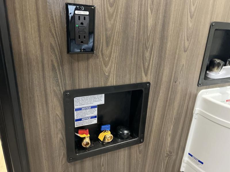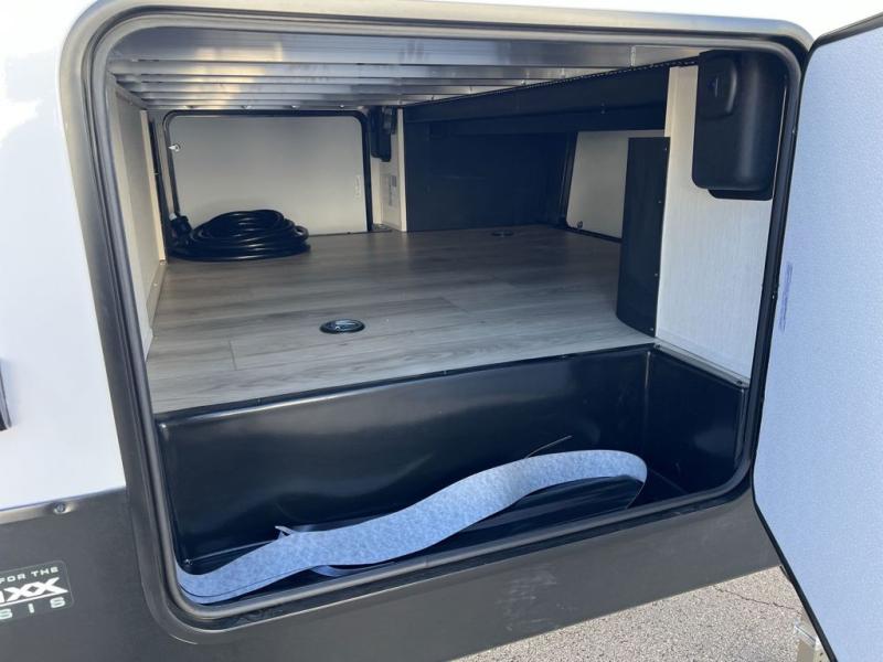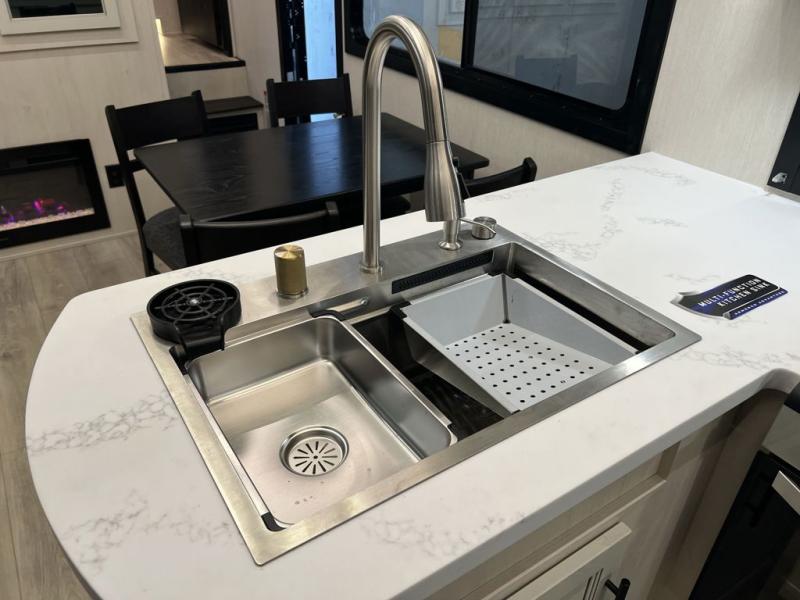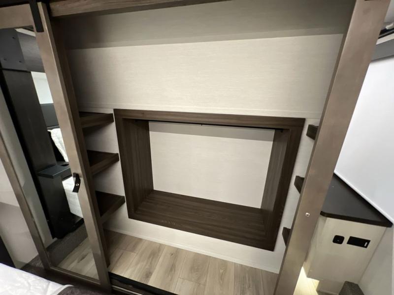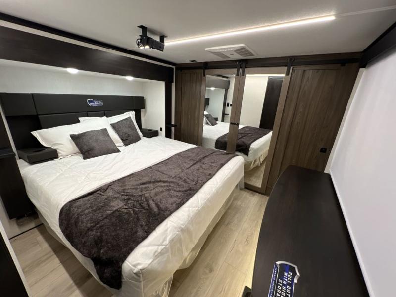 This toy hauler is perfect for a larger group since it can sleep up to eight with the added loft in the garage. There are also dual flip-up sofas here, along with a queen bed above and a half bath for added convenience! The dual entry full bath is up front, creating a master bedroom you are sure to love. There is a king bed slide out, a front wardrobe, and a dresser to keep your things organized. Head to the middle kitchen and living room to relax on the sofa within the large slide out, dine at the table with four chairs, and cook in the full kitchen. This unit also includes a fireplace to make it cozier, a large pantry to keep snacks stocked, and dual power awnings to expand your living space outdoors!