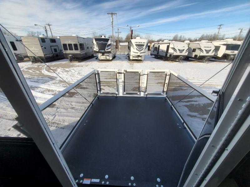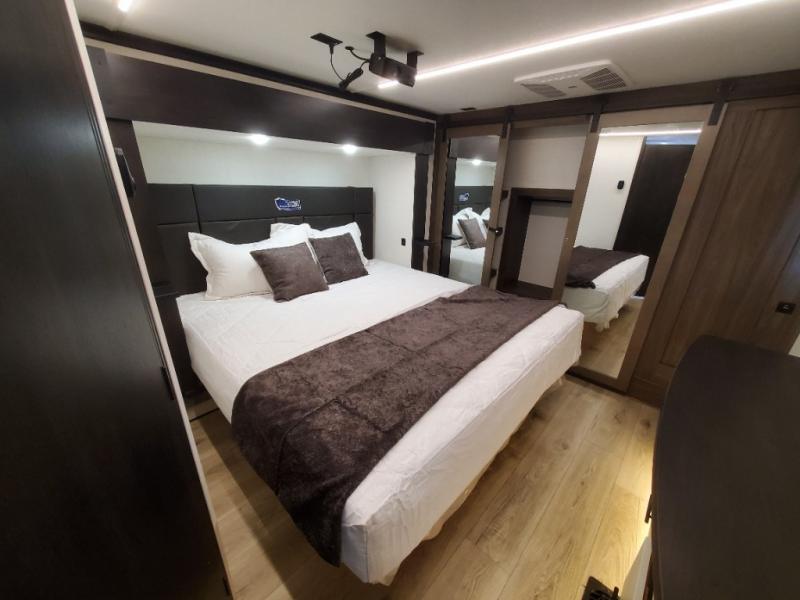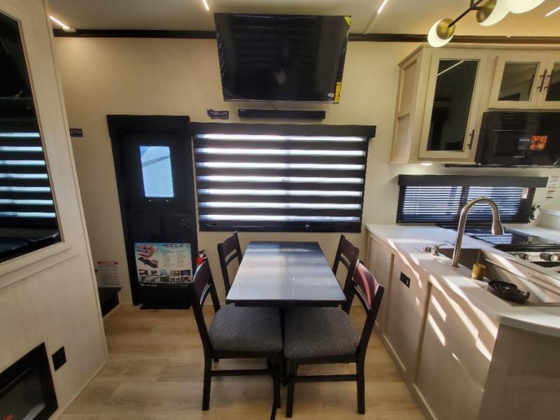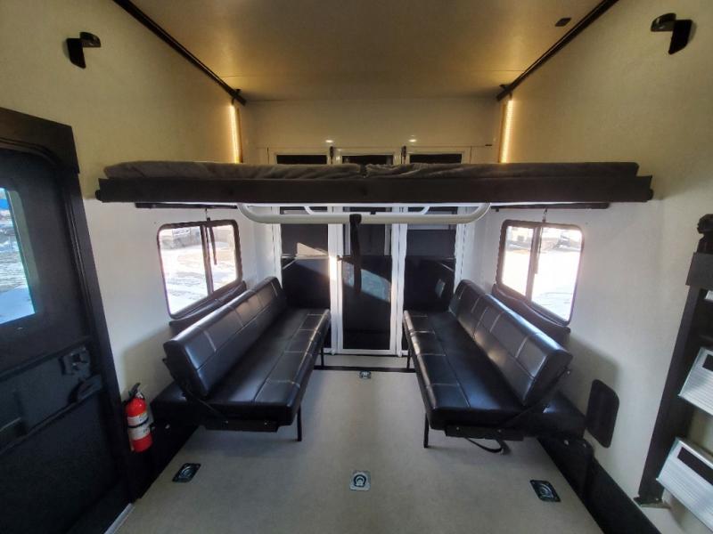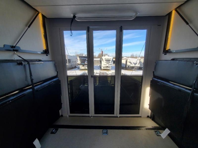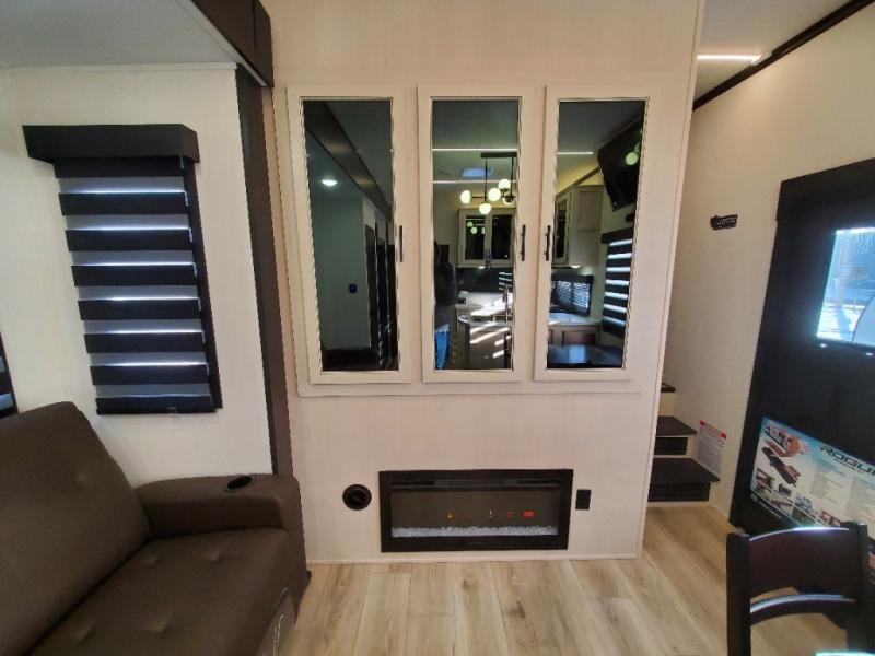 This toy hauler is perfect for a larger group since it can sleep up to eight with the added loft in the garage. There are also dual flip-up sofas here, along with a queen bed above and a half bath for added convenience! The dual entry full bath is up front, creating a master bedroom you are sure to love. There is a king bed slide out, a front wardrobe, and a dresser to keep your things organized. Head to the middle kitchen and living room to relax on the sofa within the large slide out, dine at the table with four chairs, and cook in the full kitchen. This unit also includes a fireplace to make it cozier, a large pantry to keep snacks stocked, and dual power awnings to expand your living space outdoors!