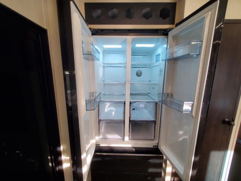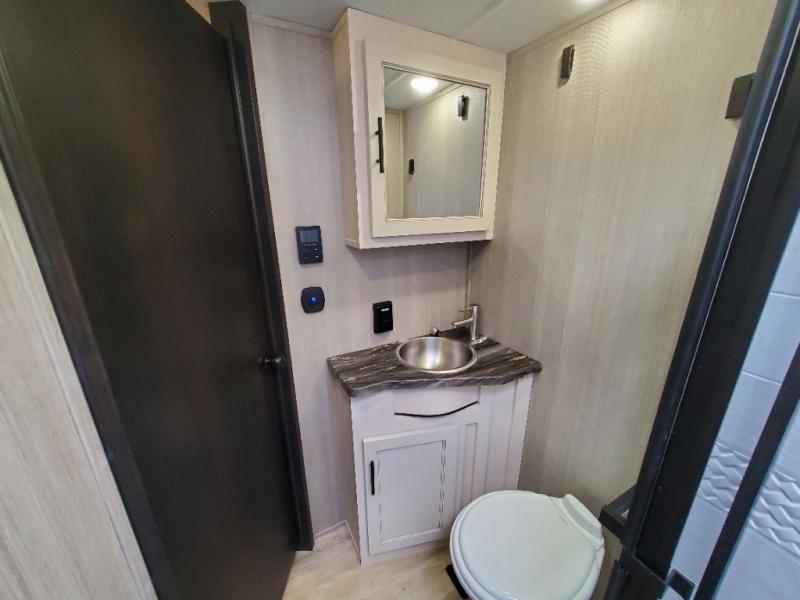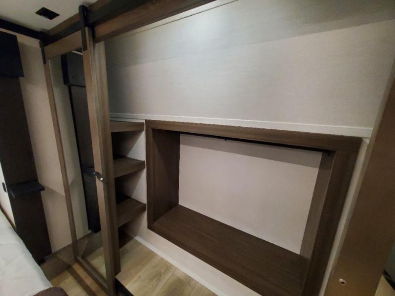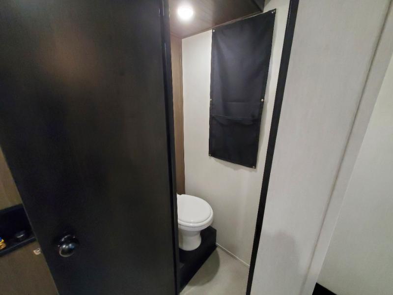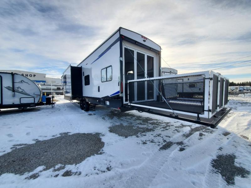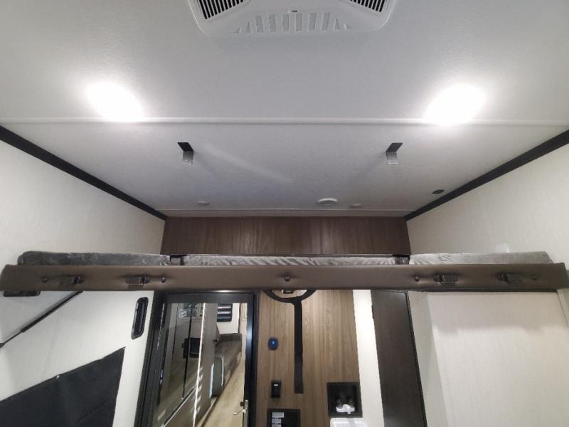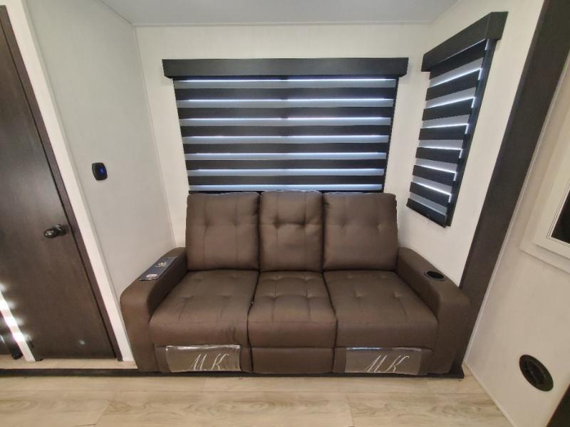This toy hauler is perfect for a larger group since it can sleep up to eight with the added loft in the garage. There are also dual flip-up sofas here, along with a queen bed above and a half bath for added convenience! The dual entry full bath is up front, creating a master bedroom you are sure to love. There is a king bed slide out, a front wardrobe, and a dresser to keep your things organized. Head to the middle kitchen and living room to relax on the sofa within the large slide out, dine at the table with four chairs, and cook in the full kitchen. This unit also includes a fireplace to make it cozier, a large pantry to keep snacks stocked, and dual power awnings to expand your living space outdoors!