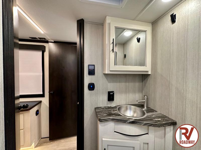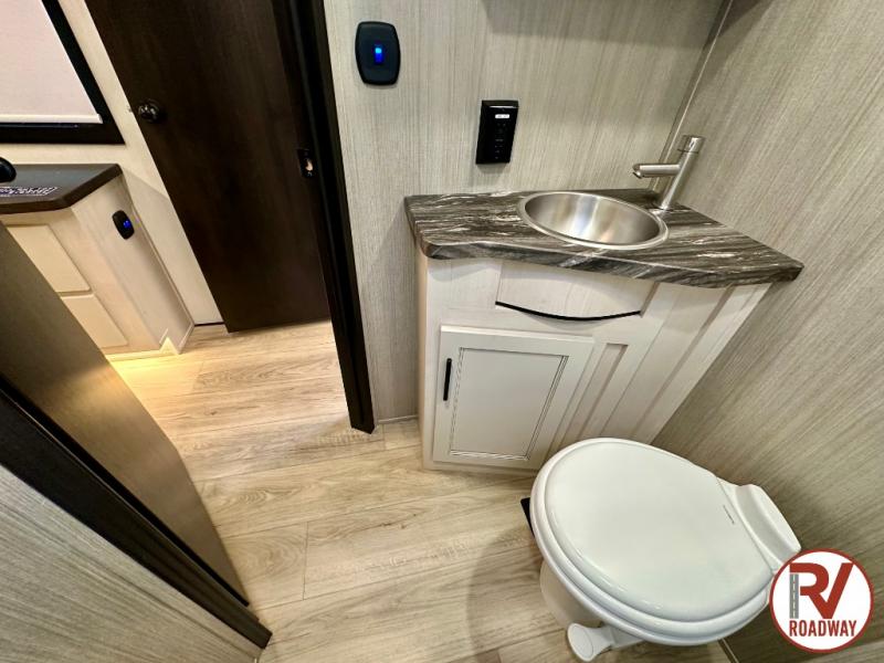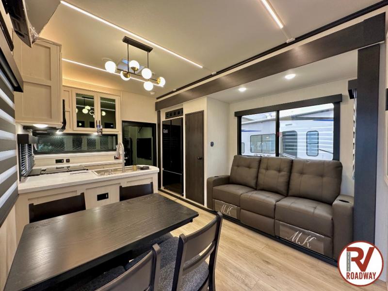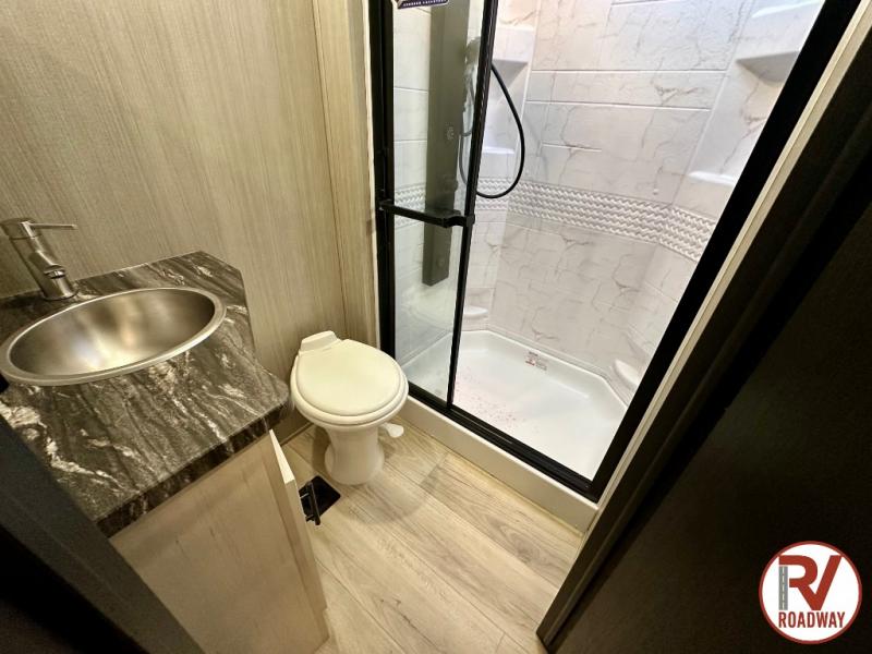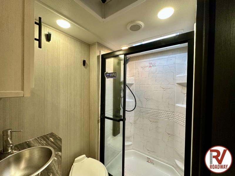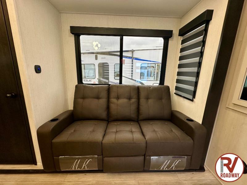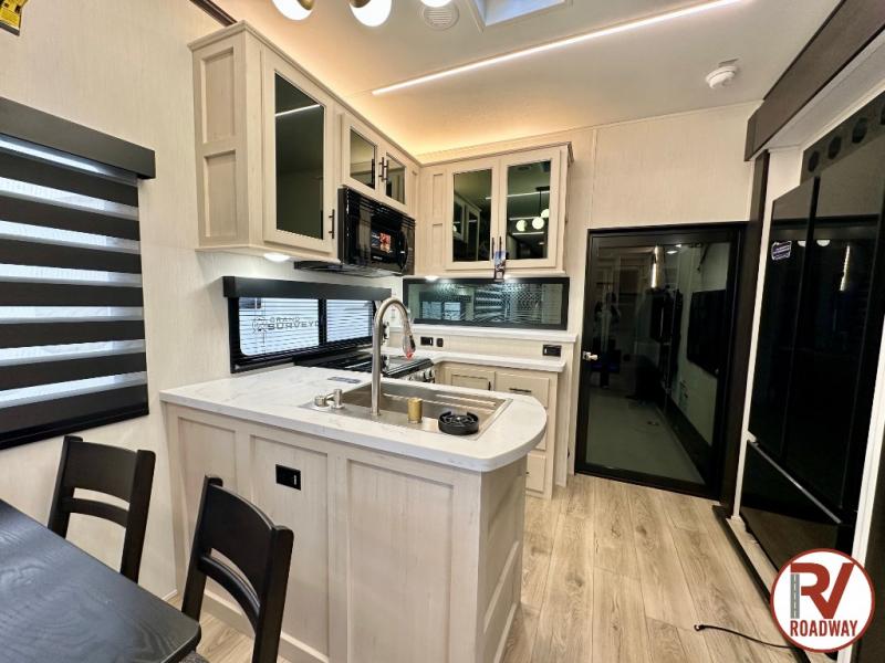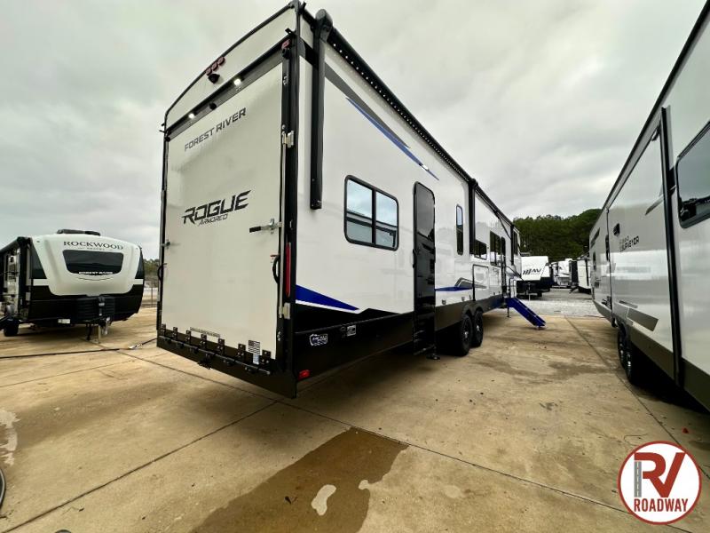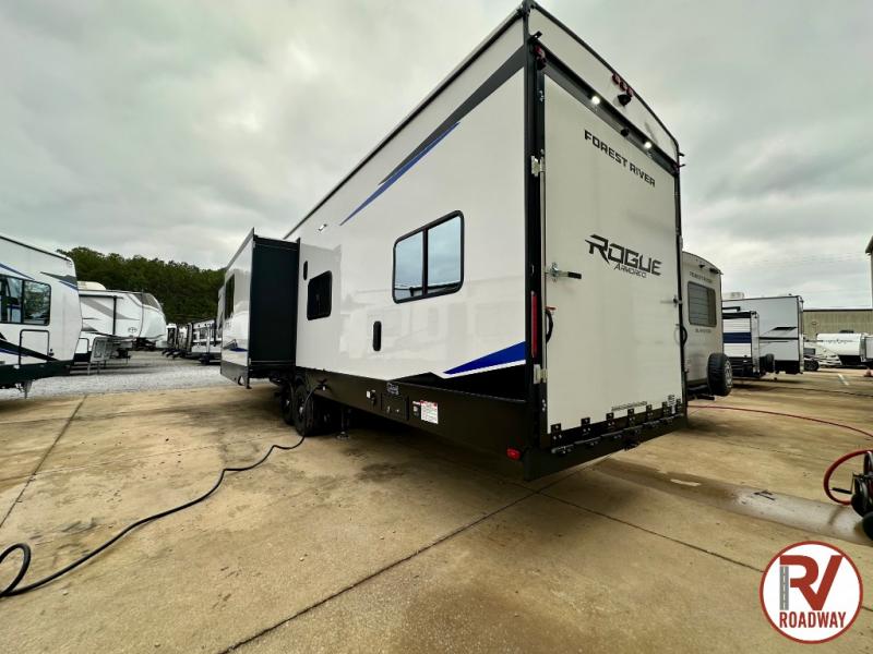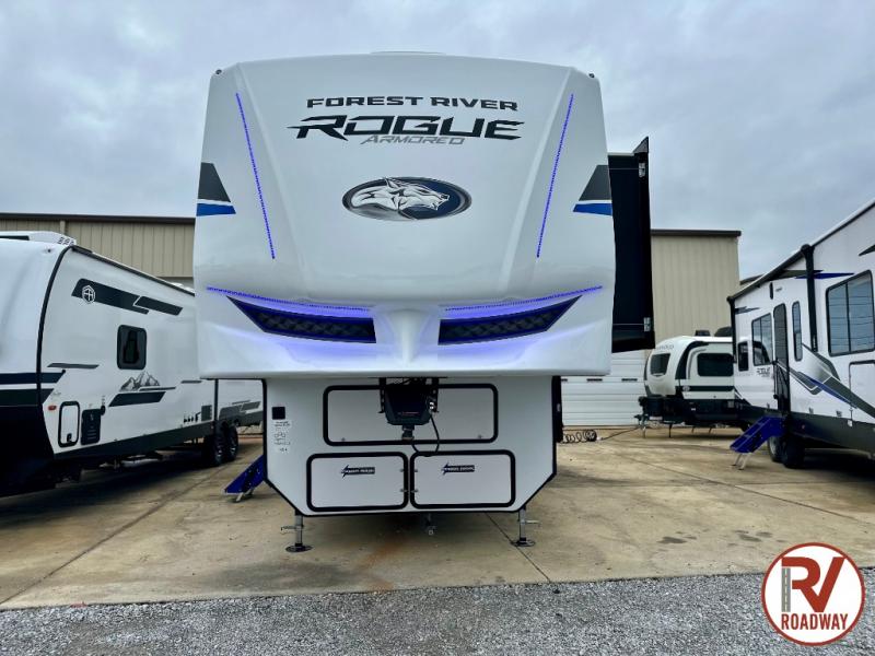 Every one of these Forest River Vengeance Rogue Armored fifth wheel toy haulers come with the features you want most at an affordable price tag! The DuraPoxy gas/oil resistant floor has 5,000 lb. tie downs to ensure your toys will arrive safely without damaging the flooring, plus the 3,000 lb. rated ramp door makes it easy to load them. Two 15,000 BTU A/Cs are "Super H Ducted" to keep you cool even on the hottest summer days, and the heated enclosed holding tanks help protect against the elements. Each model also includes a 6-point leveling system, dual LED cargo lights, solar reflective windows, and a tire pressure monitoring system. Inside, you'll enjoy the solid surface countertops, glass shower door, zebra shades in the living room, and stainless-steel multi-purpose sink to name a few comforts!