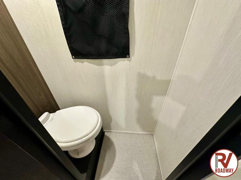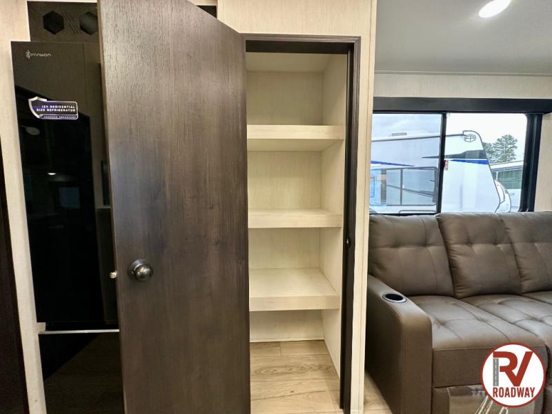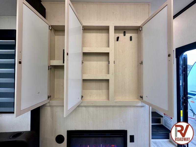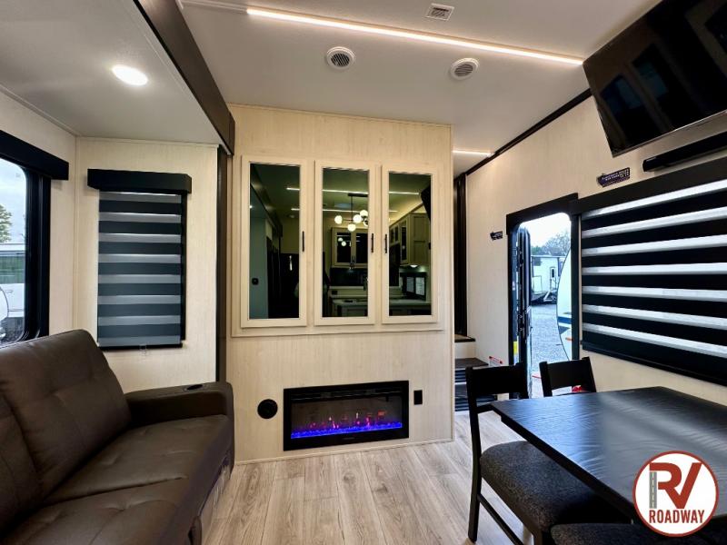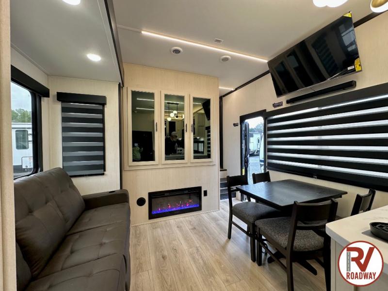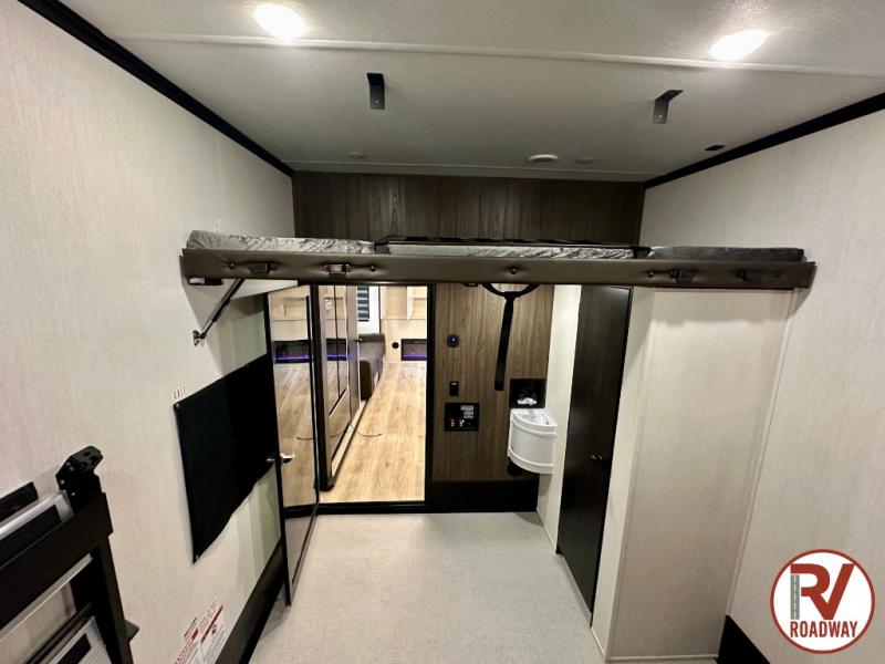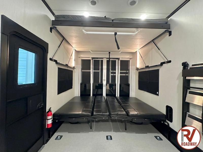 This toy hauler is perfect for a larger group since it can sleep up to eight with the added loft in the garage. There are also dual flip-up sofas here, along with a queen bed above and a half bath for added convenience! The dual entry full bath is up front, creating a master bedroom you are sure to love. There is a king bed slide out, a front wardrobe, and a dresser to keep your things organized. Head to the middle kitchen and living room to relax on the sofa within the large slide out, dine at the table with four chairs, and cook in the full kitchen. This unit also includes a fireplace to make it cozier, a large pantry to keep snacks stocked, and dual power awnings to expand your living space outdoors!