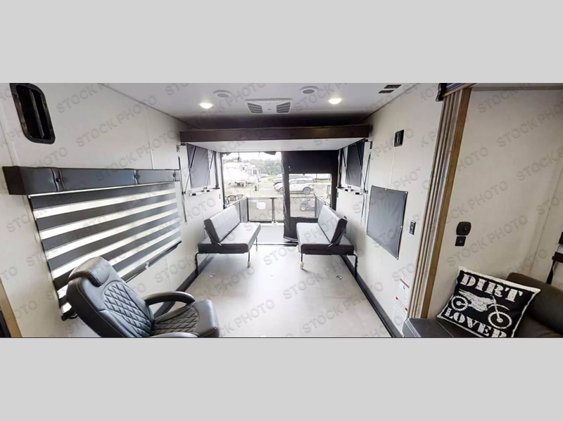 You're going to love this spacious toy hauler with a kitchen slide out! There is a 10' 6" garage with 15' 10" total garage space if you include the main living area where the flip-up sofa and optional lounge chairs are. Once your toys are unloaded, your crew can relax on the roll-over sofas, and at night they can sleep on the quick set queen bed system. You will enjoy the front master bedroom with a Rogue king bed, dual wardrobes, and a private entrance into the dual entry bath!