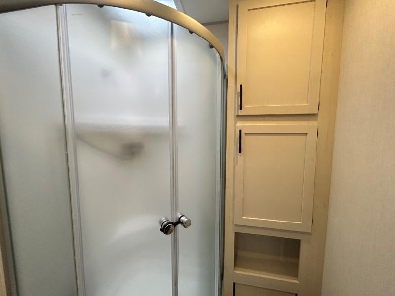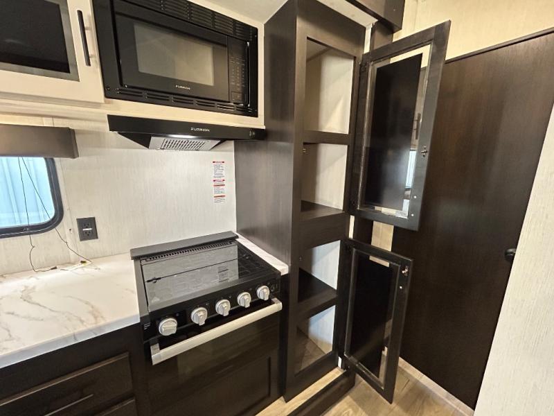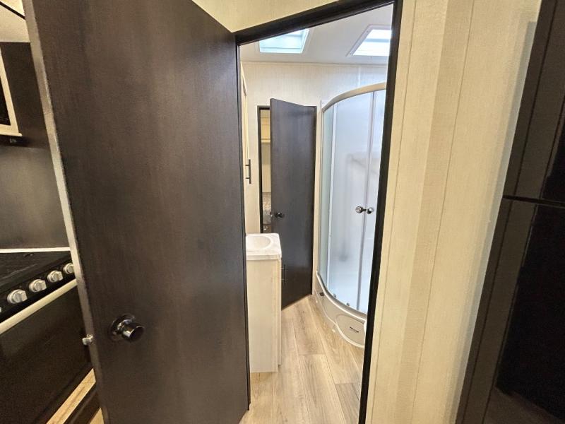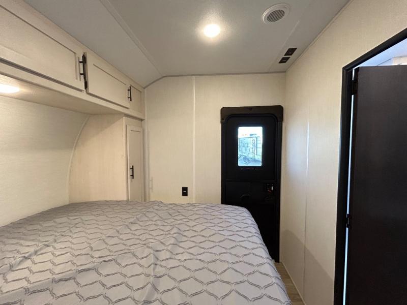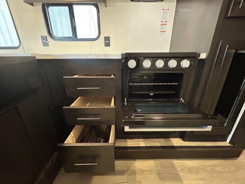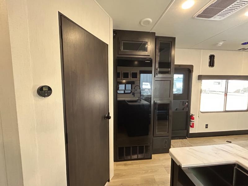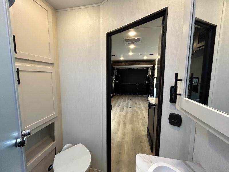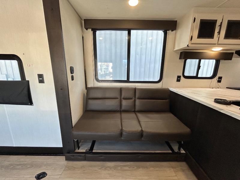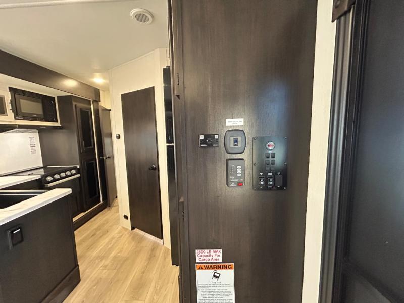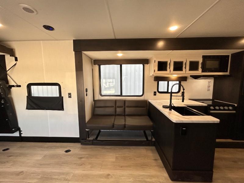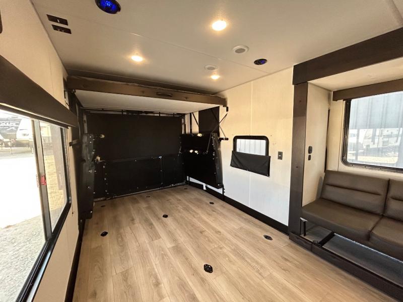 You're going to love this spacious toy hauler with a kitchen slide out! There is a 10' 6" garage with 15' 10" total garage space if you include the main living area where the flip-up sofa and optional lounge chairs are. Once your toys are unloaded, your crew can relax on the roll-over sofas, and at night they can sleep on the quick set queen bed system. You will enjoy the front master bedroom with a Rogue king bed, dual wardrobes, and a private entrance into the dual entry bath!