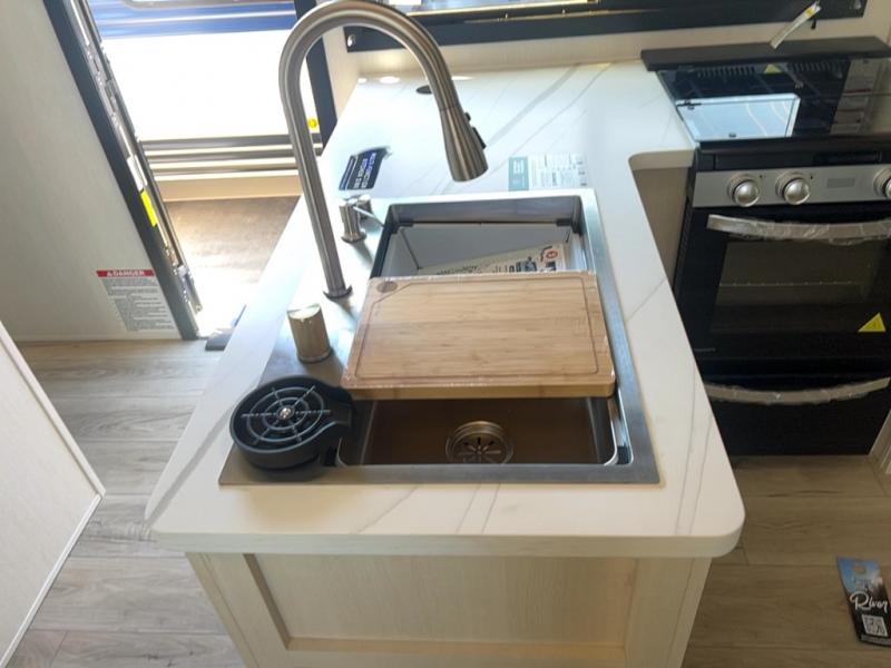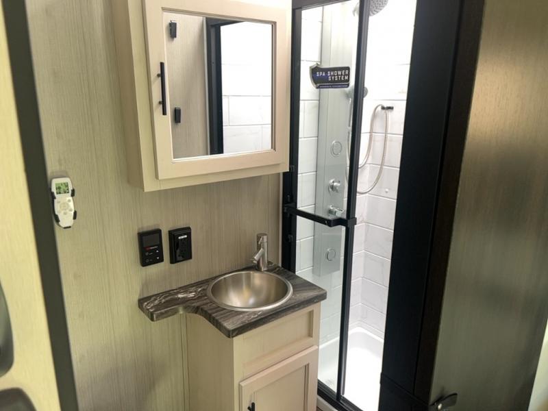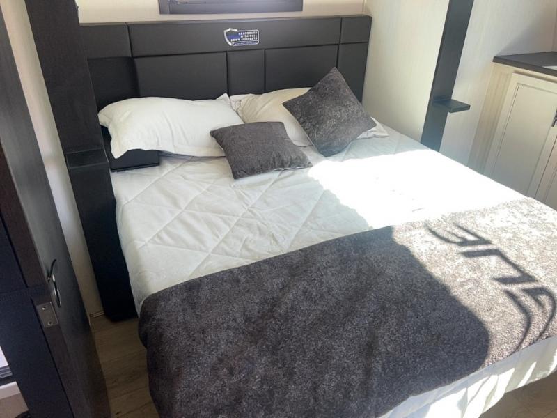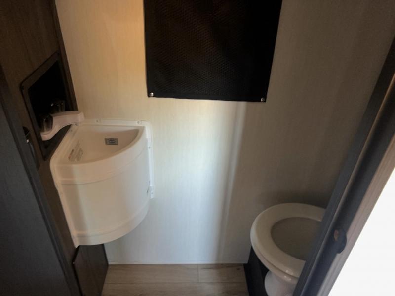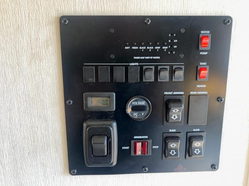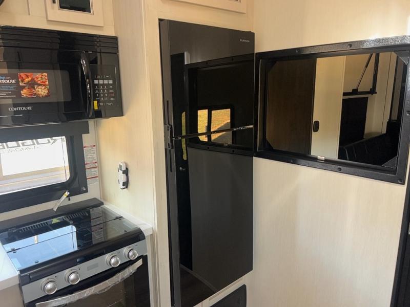 The bath and a half and separate garage in this toy hauler make it the perfect model to camp with friends or family. Your guests will have two roll-over sofas and a quick set queen bed system to sleep on plus their own half bath and private entry door. You'll enjoy the Rouge king bed in the front master bedroom, along with dual wardrobes, and easy access into the dual entry bath! Everyone can meet in the main living area on the sofa slide out, and the opposing slide will create maximum space to relax. There is also an island peninsula in the kitchen, a three burner cooktop with an oven, and a 10 cu. ft. 12V high-efficiency residential refrigerator for food storage.