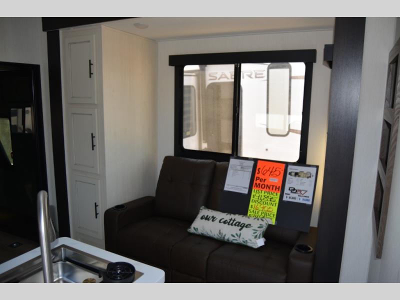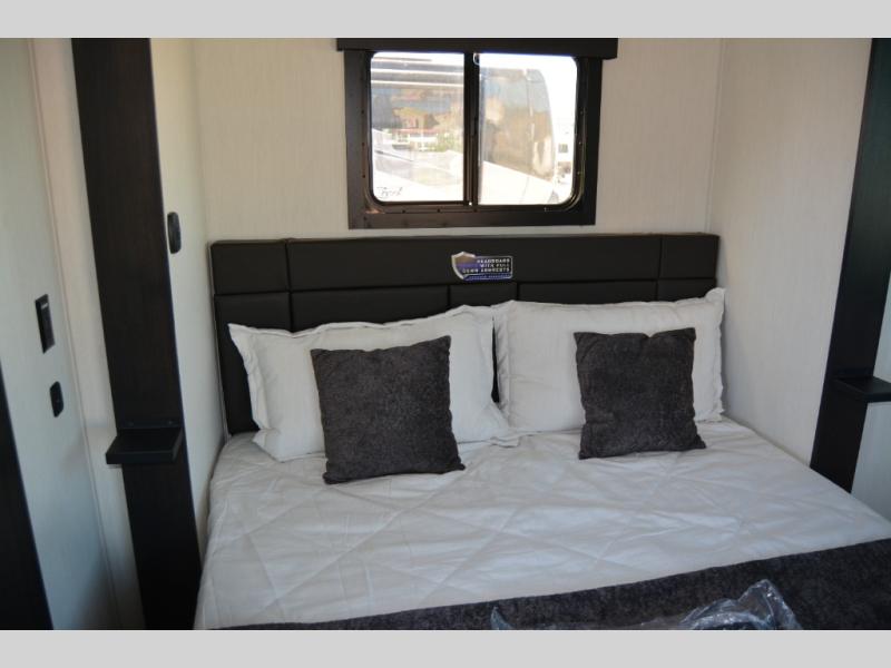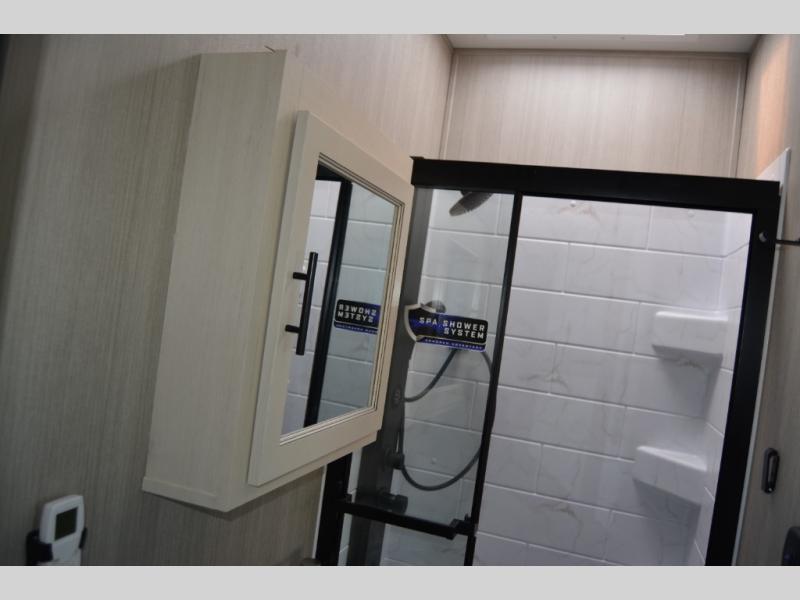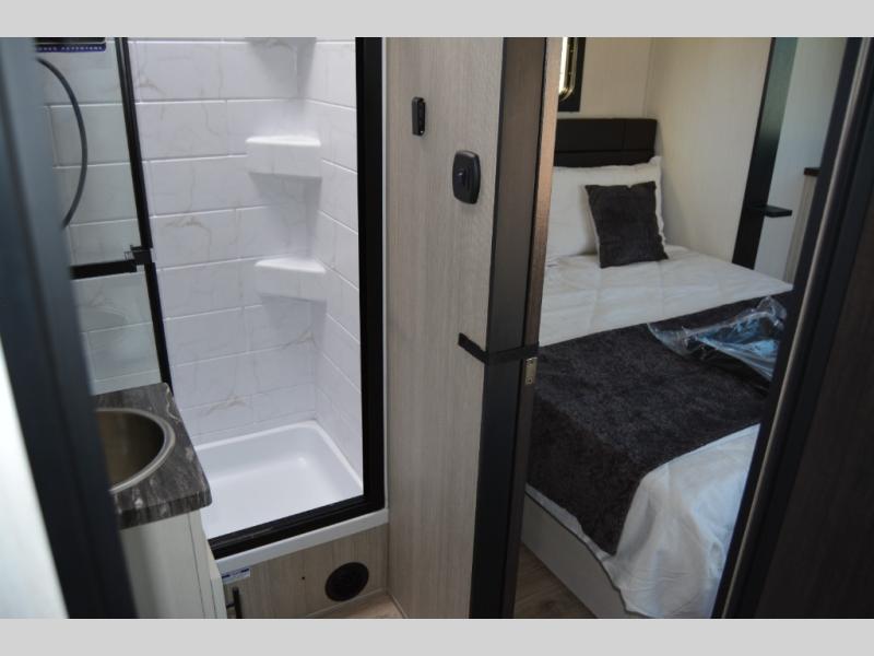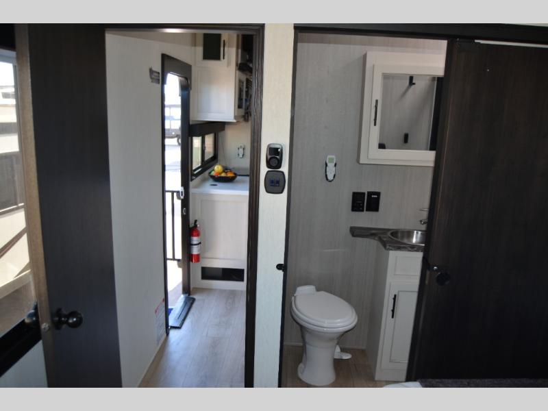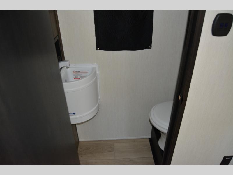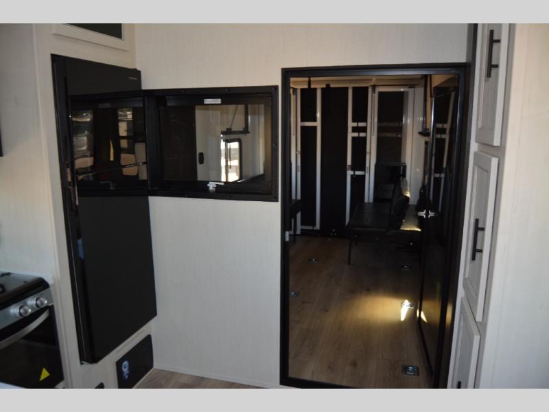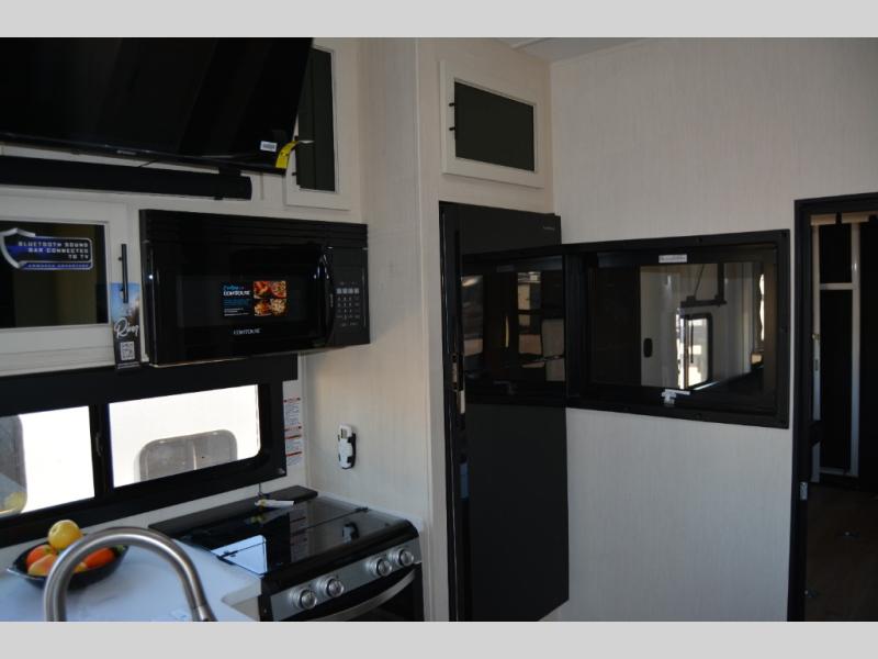 The bath and a half and separate garage in this toy hauler make it the perfect model to camp with friends or family. Your guests will have two roll-over sofas and a quick set queen bed system to sleep on plus their own half bath and private entry door. You'll enjoy the Rouge king bed in the front master bedroom, along with dual wardrobes, and easy access into the dual entry bath! Everyone can meet in the main living area on the sofa slide out, and the opposing slide will create maximum space to relax. There is also an island peninsula in the kitchen, a three burner cooktop with an oven, and a 10 cu. ft. 12V high-efficiency residential refrigerator for food storage.