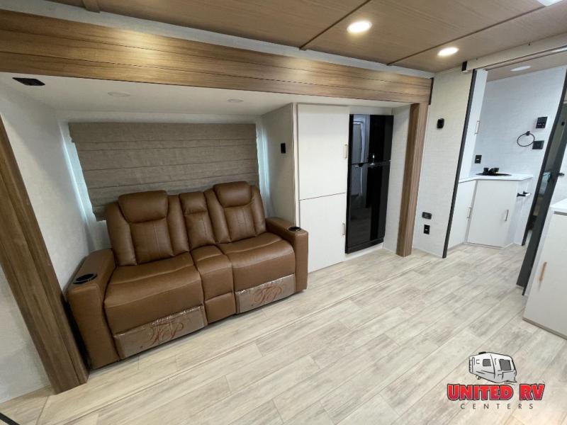 You'll love camping trips in this couple's trailer! The rear of this unit includes a full-width bar top with two stools, and in the corner there is a 40" TV with shelves for movies or books. You can relax comfortably on the theater seating that is close by the pantry and 12V residential refrigerator to grab a snack. A walk-through bath is spacious so you can easily clean up each day, and the front master bedroom is sure to bring comfort. Here, you'll find a custom king bed with underbed storage, dual bedside closets, plus one of the two entry doors for added convenience!