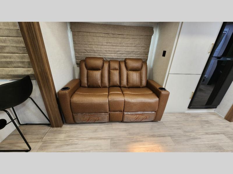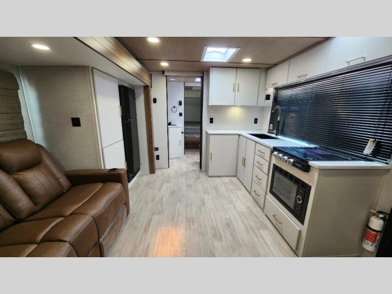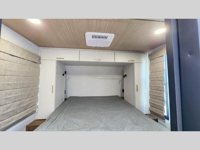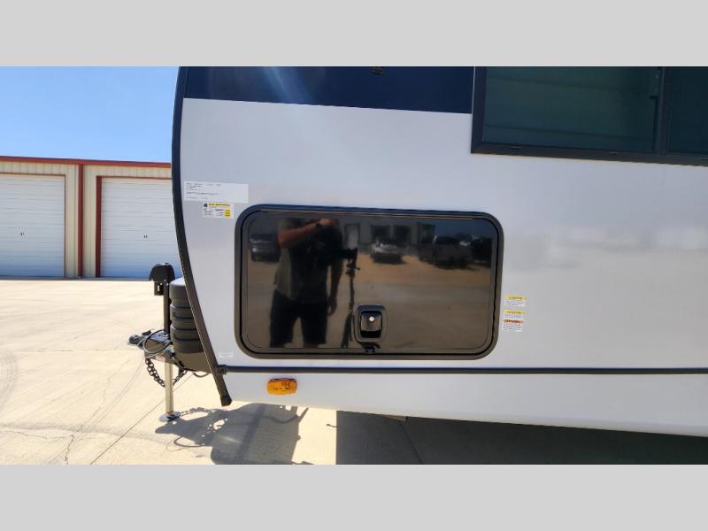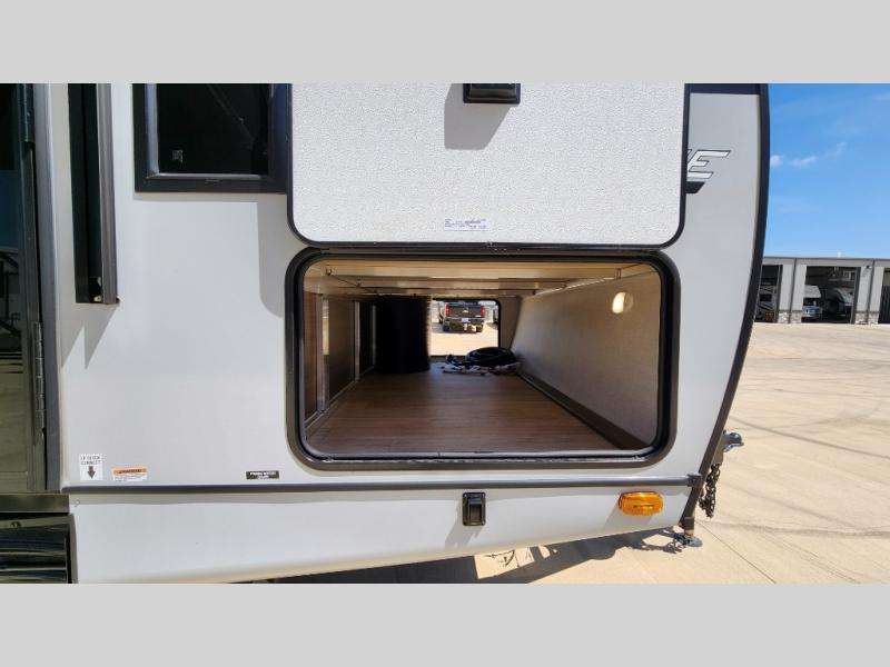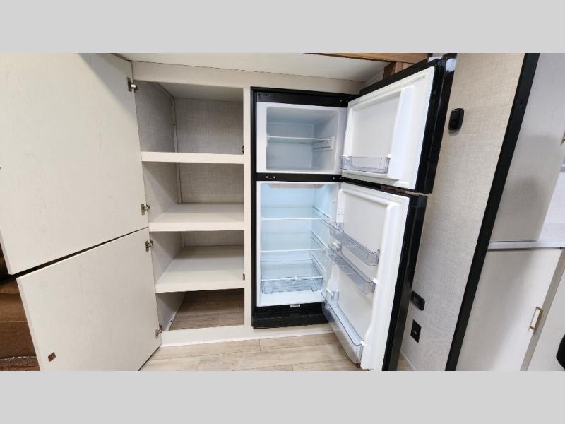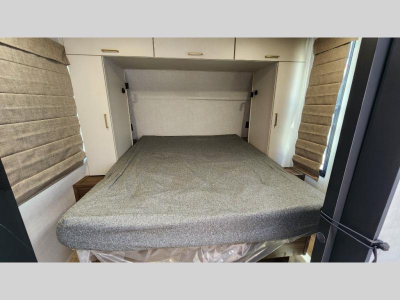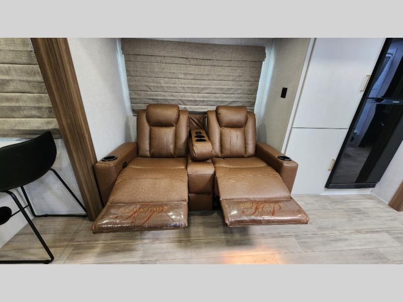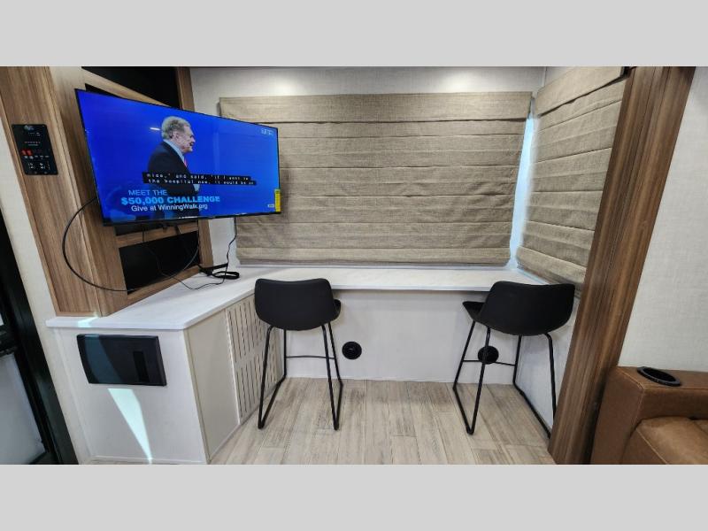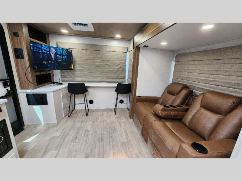 You'll love camping trips in this couple's trailer! The rear of this unit includes a full-width bar top with two stools, and in the corner there is a 40" TV with shelves for movies or books. You can relax comfortably on the theater seating that is close by the pantry and 12V residential refrigerator to grab a snack. A walk-through bath is spacious so you can easily clean up each day, and the front master bedroom is sure to bring comfort. Here, you'll find a custom king bed with underbed storage, dual bedside closets, plus one of the two entry doors for added convenience!