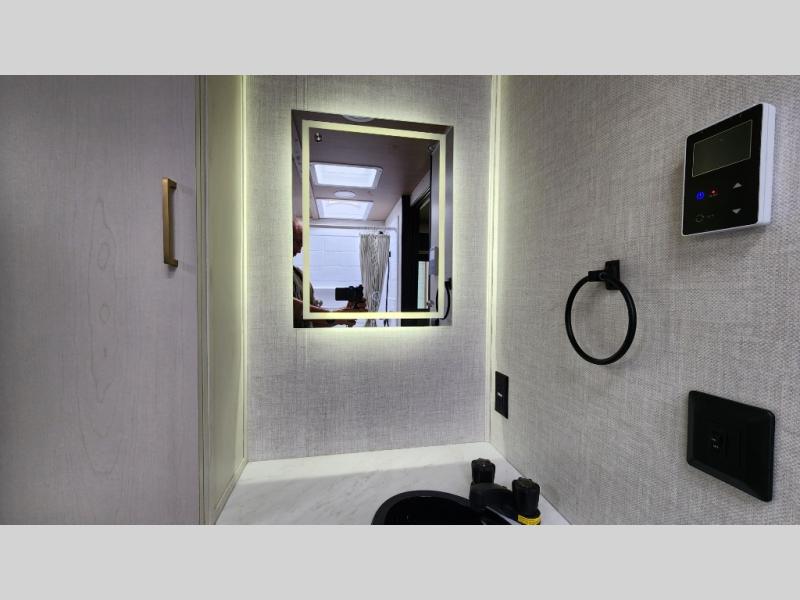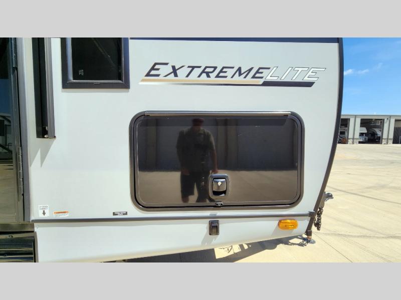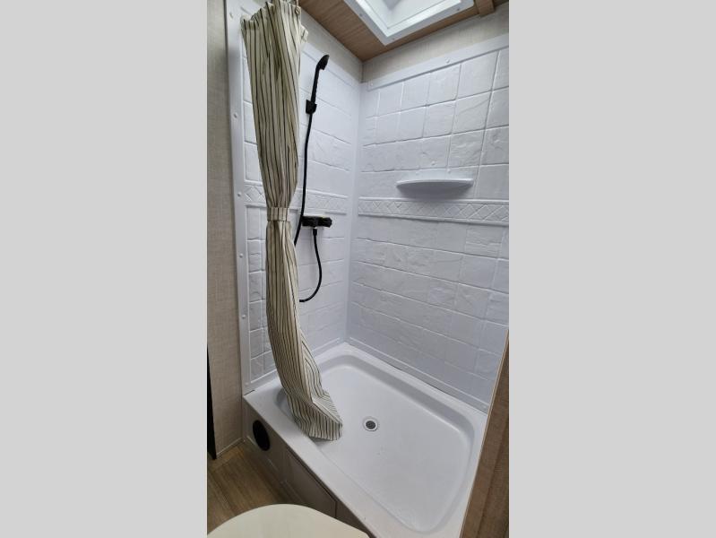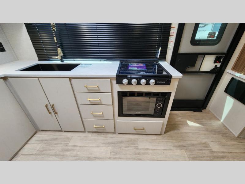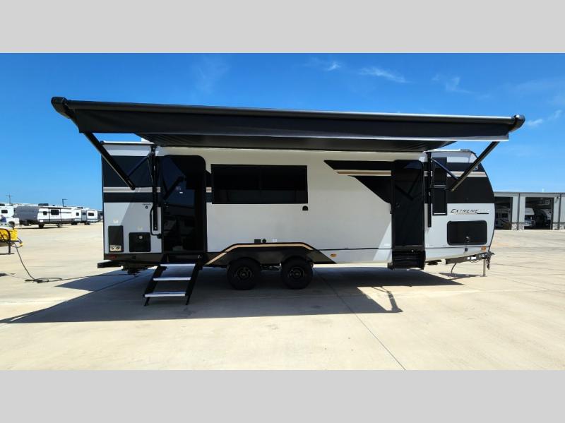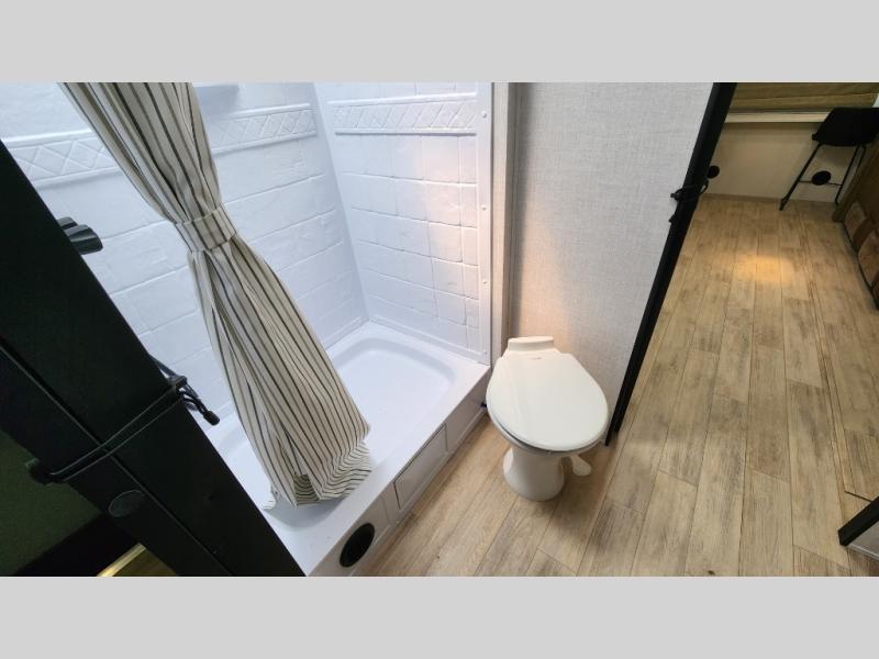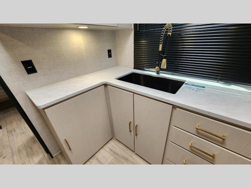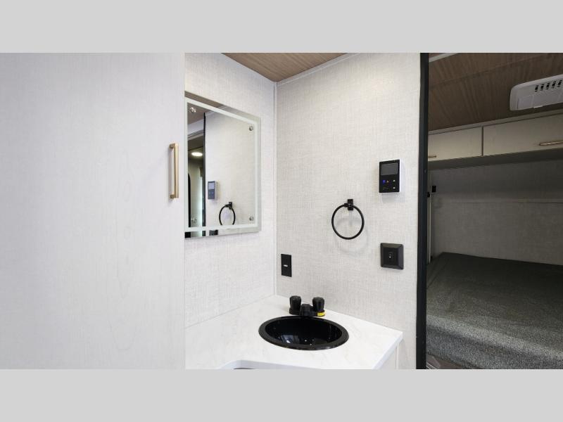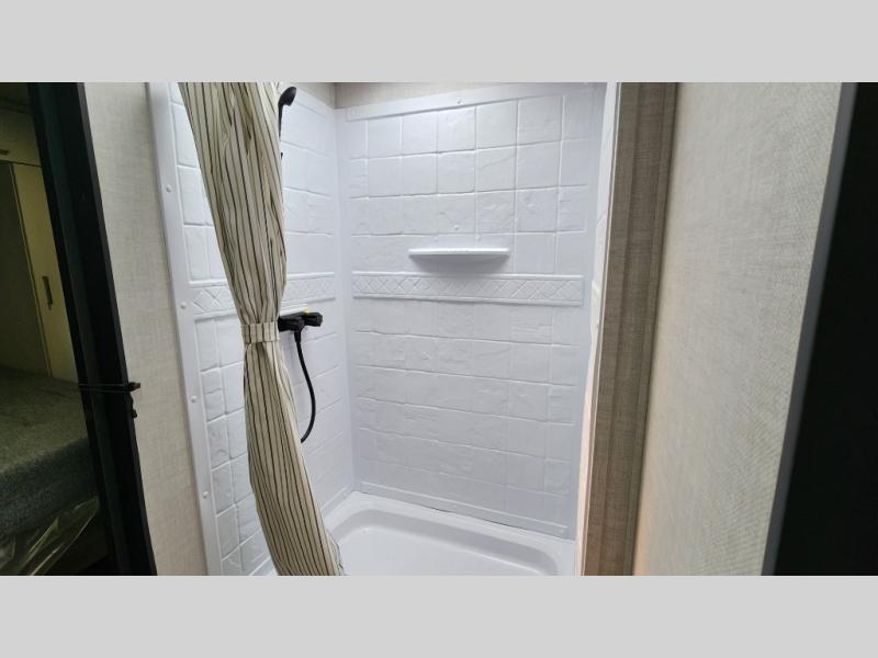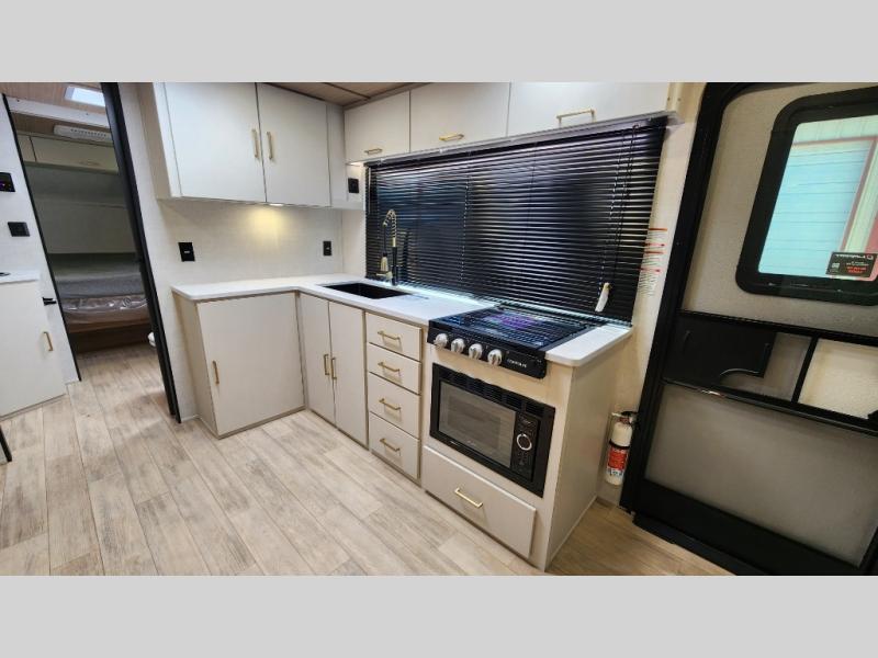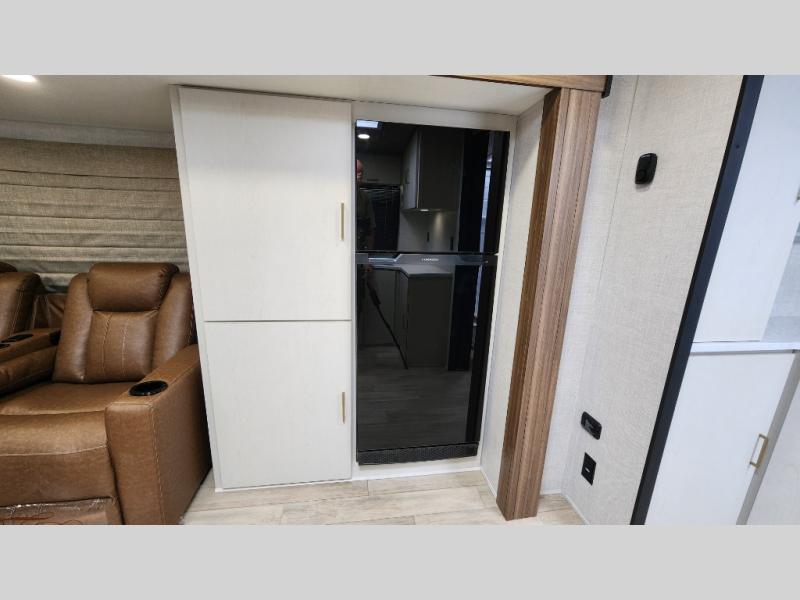 You'll love camping trips in this couple's trailer! The rear of this unit includes a full-width bar top with two stools, and in the corner there is a 40" TV with shelves for movies or books. You can relax comfortably on the theater seating that is close by the pantry and 12V residential refrigerator to grab a snack. A walk-through bath is spacious so you can easily clean up each day, and the front master bedroom is sure to bring comfort. Here, you'll find a custom king bed with underbed storage, dual bedside closets, plus one of the two entry doors for added convenience!
