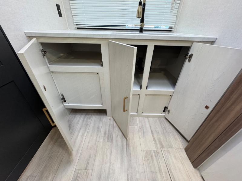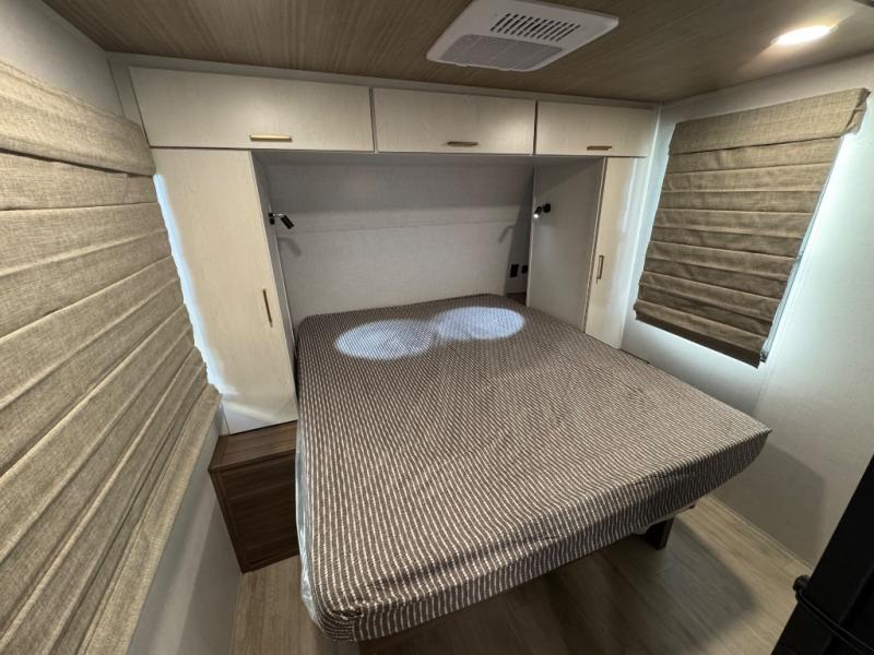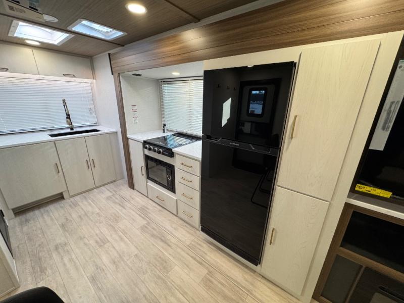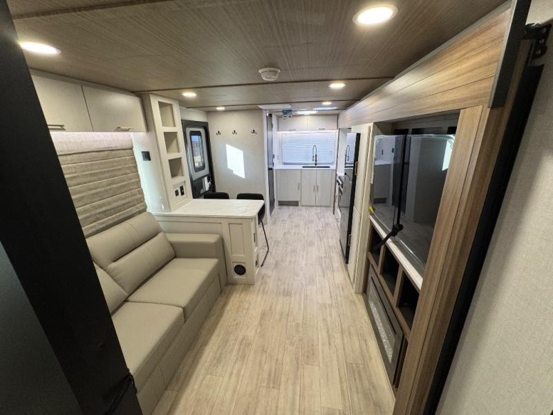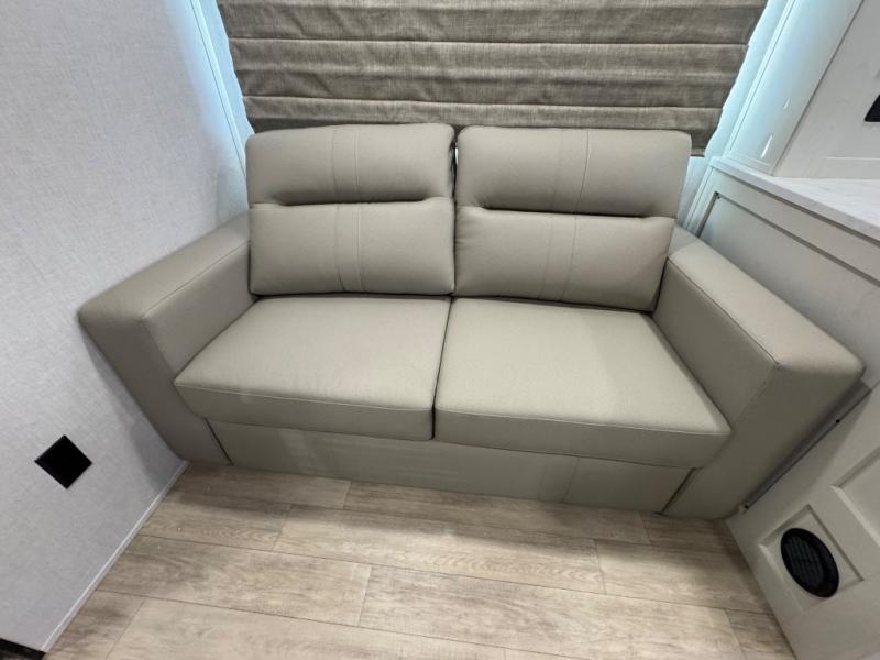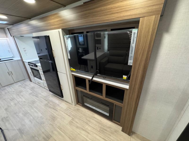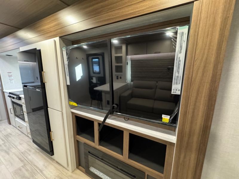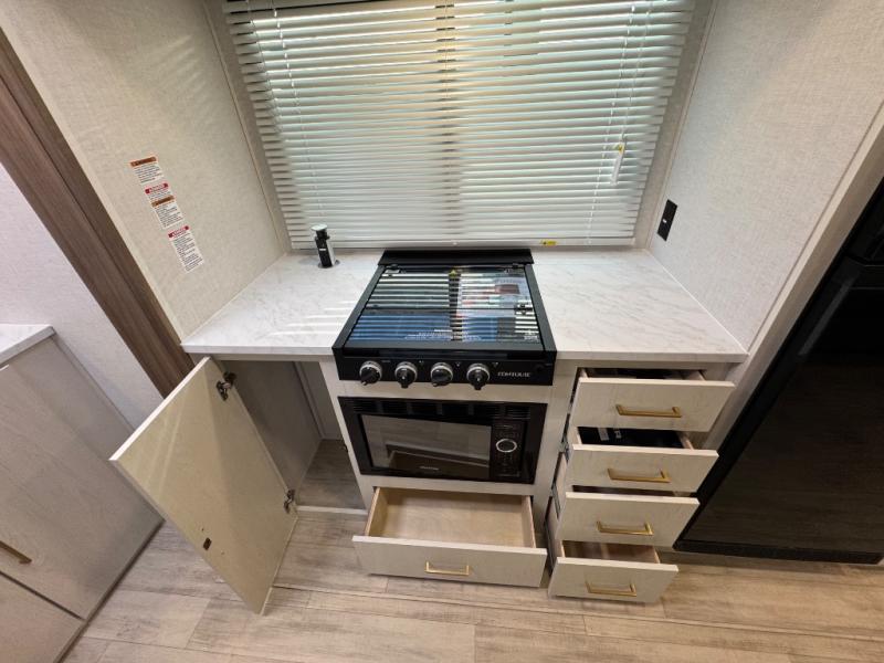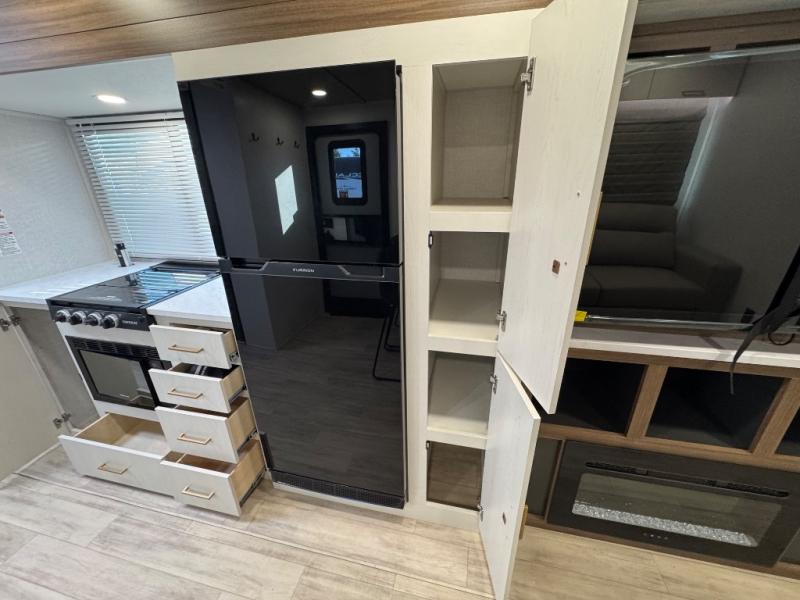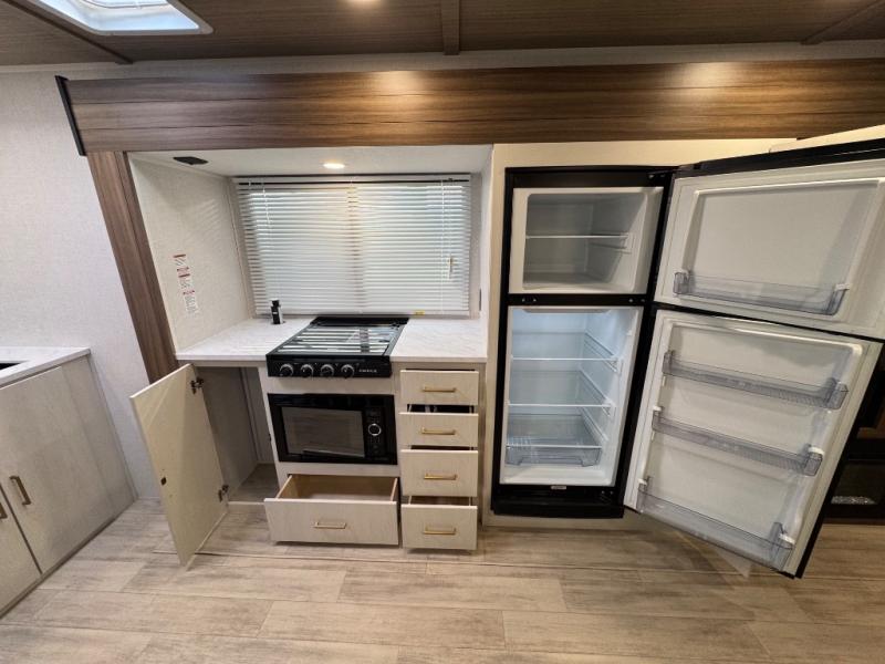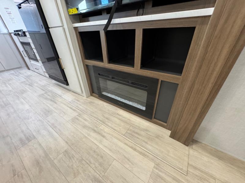 You'll love every minute spent in this spacious travel trailer for four! The custom king bed is sure to provide a great night's rest, while your guests sleep on the sleeper sofa in the living area. There is also an entertainment center and fireplace across from the sofa so you can enjoy movie nights. The three-burner gas cooktop and microwave oven will let you make your best meals, and the pantry and 12V refrigerator provides food storage. The back of this unit includes the kitchen sink and extra countertop space, along with the full bath, complete with a walk-in shower with a seat for added comfort!