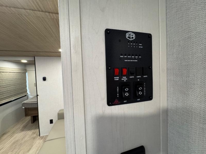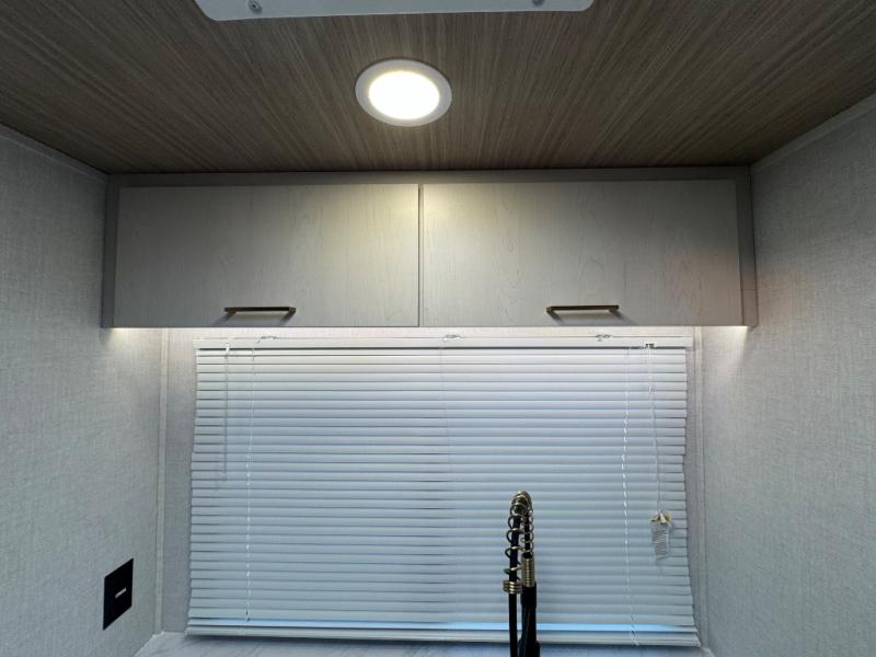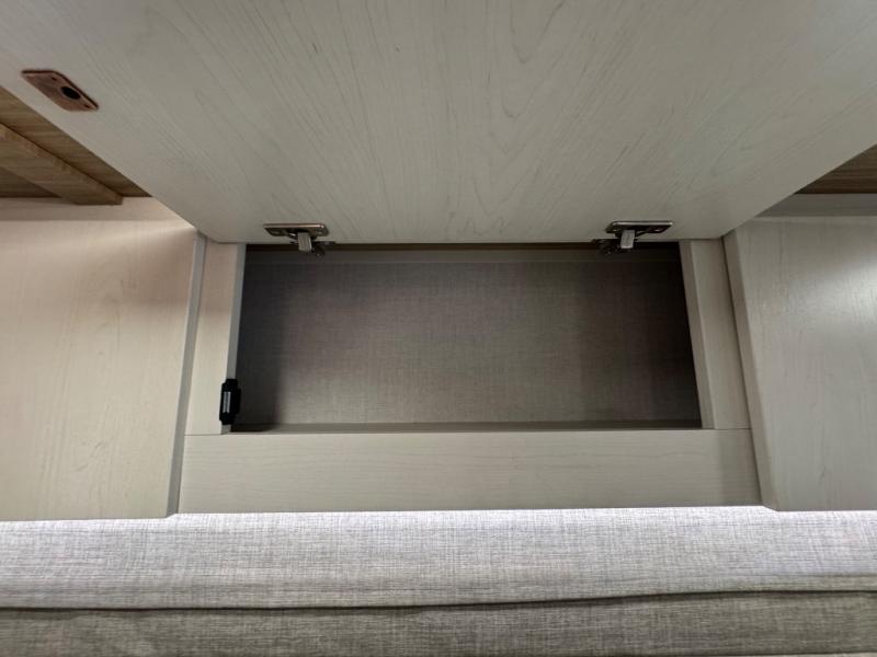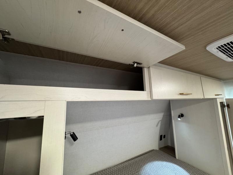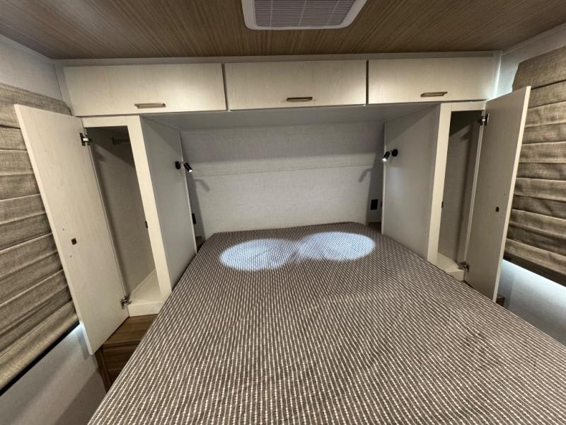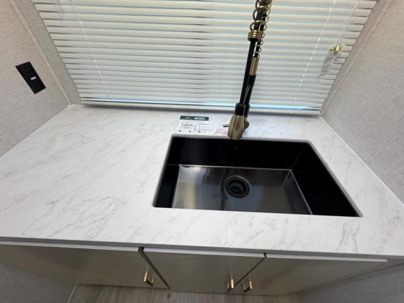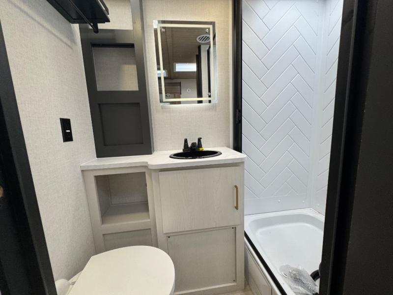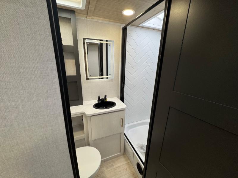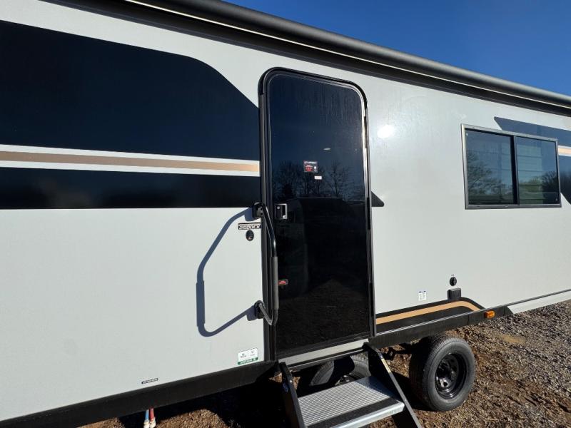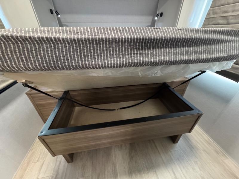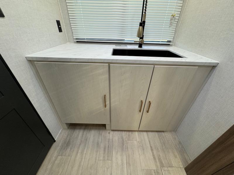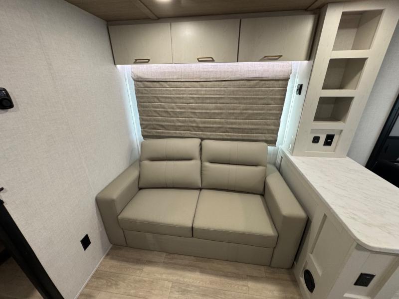 You'll love every minute spent in this spacious travel trailer for four! The custom king bed is sure to provide a great night's rest, while your guests sleep on the sleeper sofa in the living area. There is also an entertainment center and fireplace across from the sofa so you can enjoy movie nights. The three-burner gas cooktop and microwave oven will let you make your best meals, and the pantry and 12V refrigerator provides food storage. The back of this unit includes the kitchen sink and extra countertop space, along with the full bath, complete with a walk-in shower with a seat for added comfort!