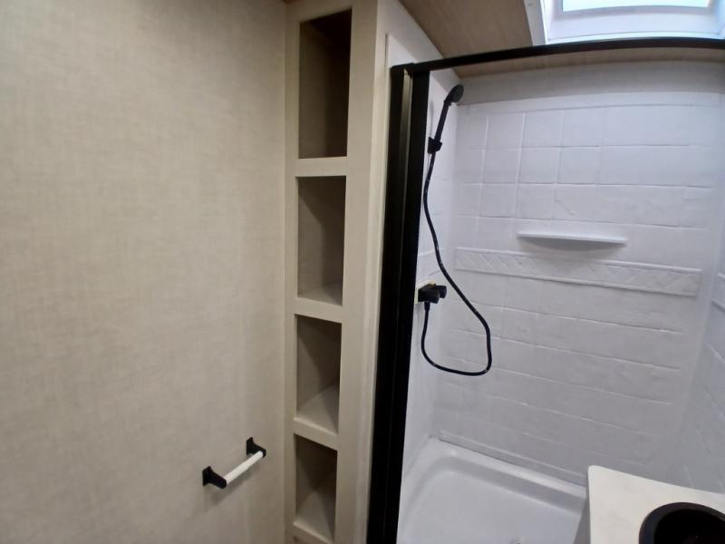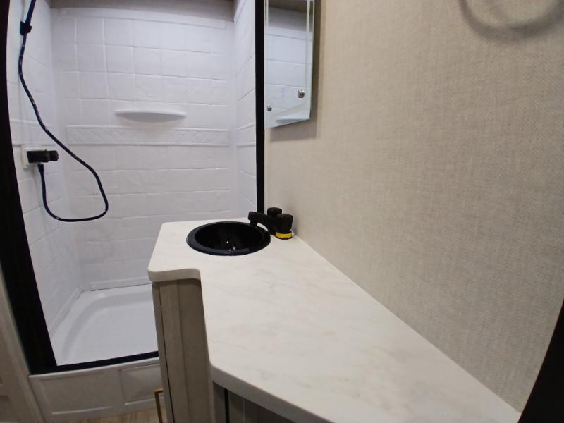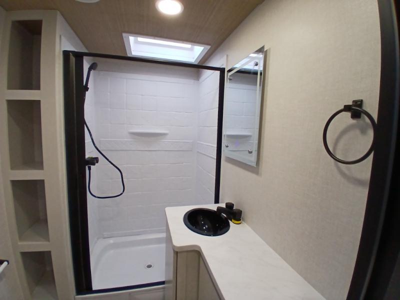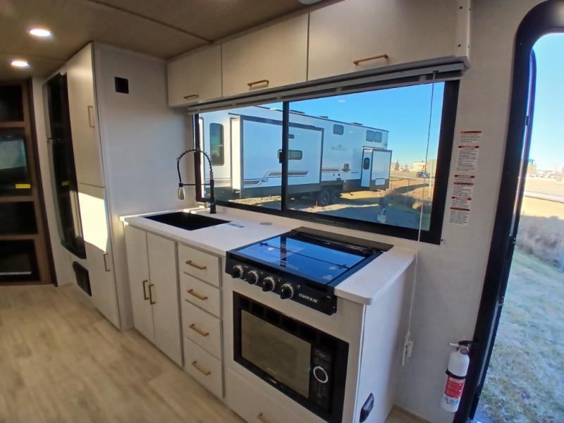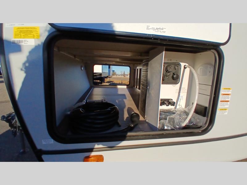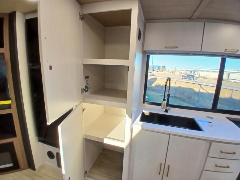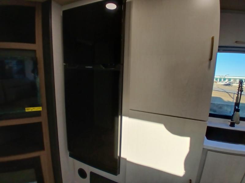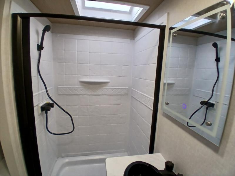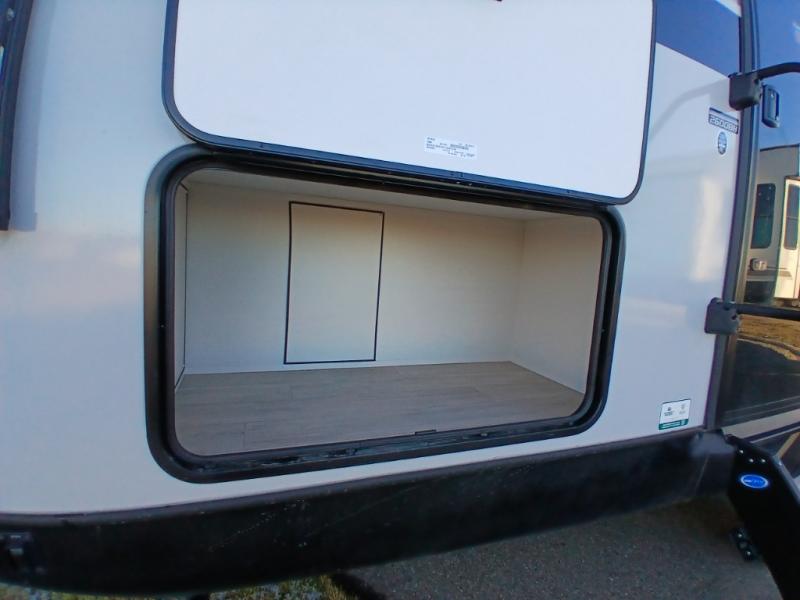 Escape to the great outdoors in this Vibe travel trailer. Once you arrive at your campsite, set up the 20' electric awning with LED lights, then grab the fishing poles from the large pass-through storage. You can make lunch on the electric oven/air fryer, and your food can be stored in the 12V refrigerator. The spacious full bath includes a 36" x 30" walk-in shower to clean up every day, and there is a linen closet to store clean towels and necessities.