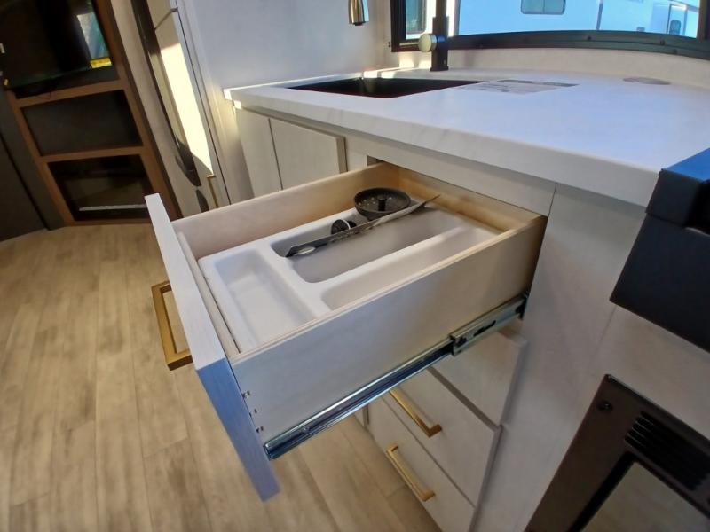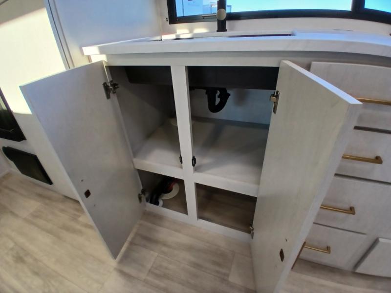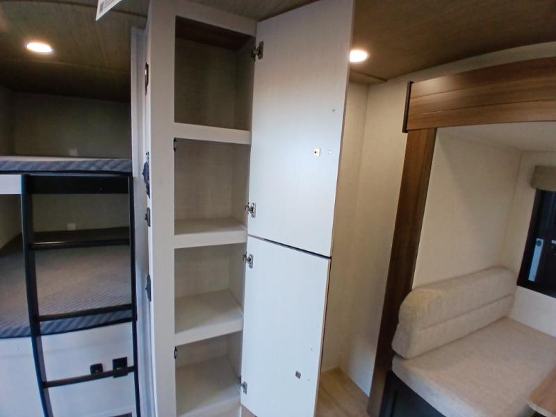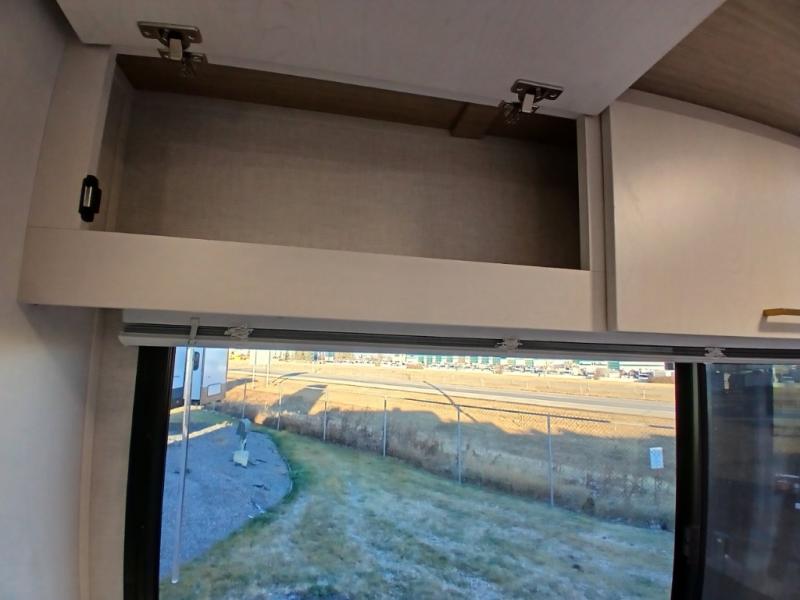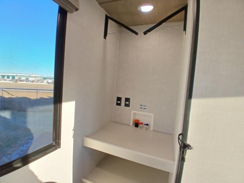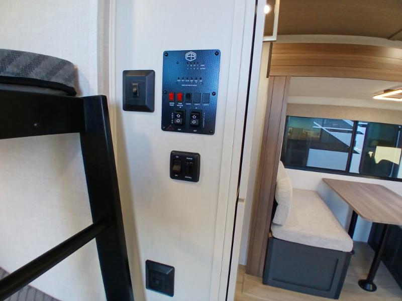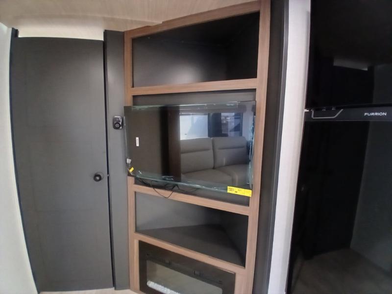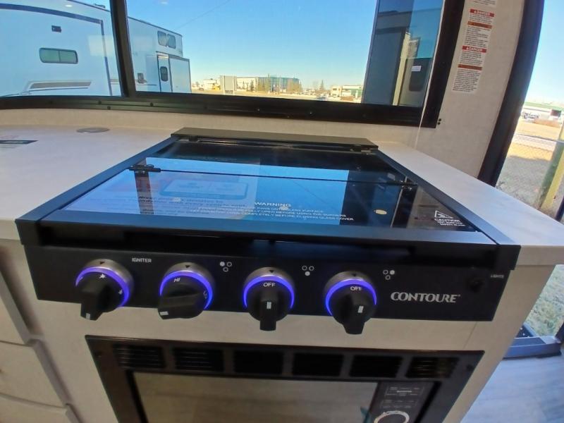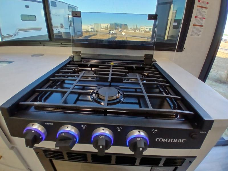 Escape to the great outdoors in this Vibe travel trailer. Once you arrive at your campsite, set up the 20' electric awning with LED lights, then grab the fishing poles from the large pass-through storage. You can make lunch on the electric oven/air fryer, and your food can be stored in the 12V refrigerator. The spacious full bath includes a 36" x 30" walk-in shower to clean up every day, and there is a linen closet to store clean towels and necessities.