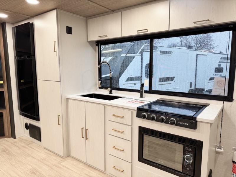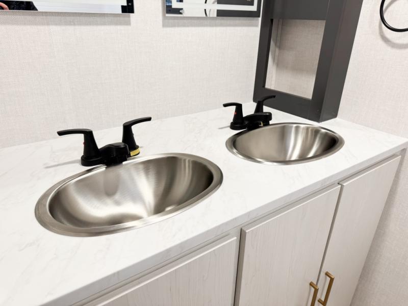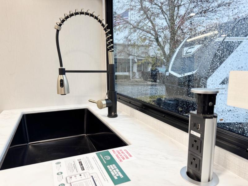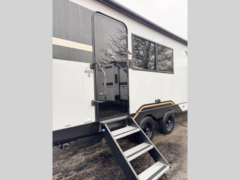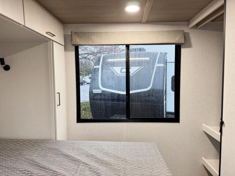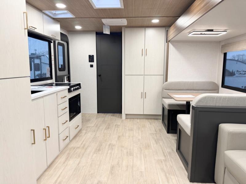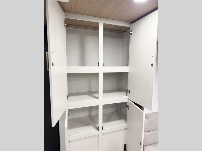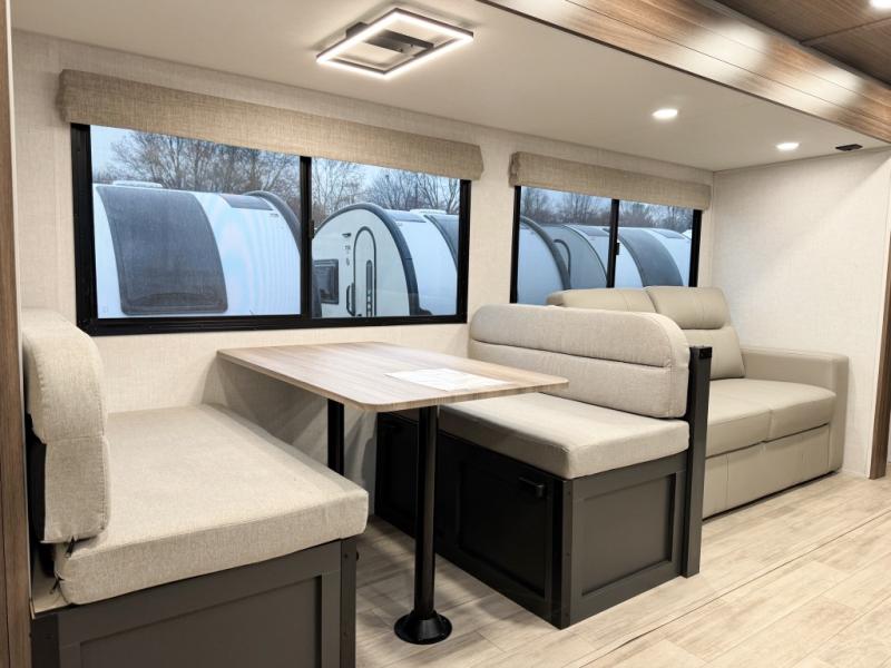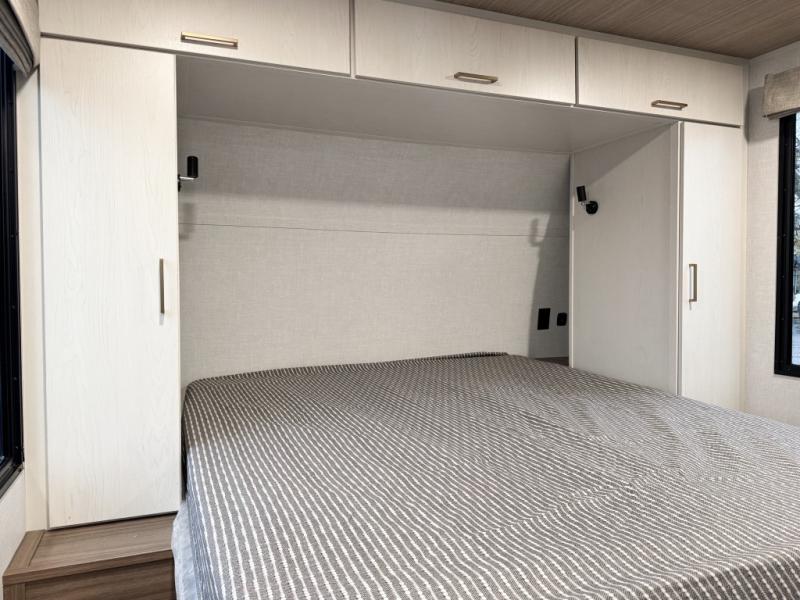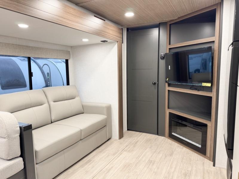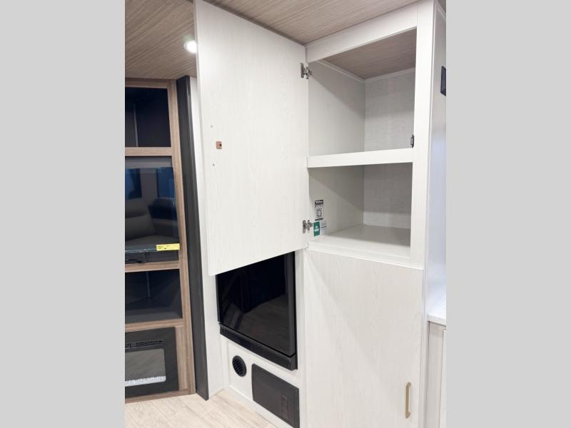 You will love camping every other weekend in this spacious travel trailer. There is a full rear bath with a spacious shower and linen closet for towels and toiletries. Your crew can get comfortable on the theater seating across from the entertainment center, and it even swings open to reveal hidden pantry storage. Easily prepare your meals in the kitchen on the three burner cooktop, or in the oven. There is also a 12V refrigerator, plus a microwave for meals on the go. When you're ready to call it a night, the front private bedroom is sure to provide comfort with its custom king bed, wardrobe, and underbed storage.