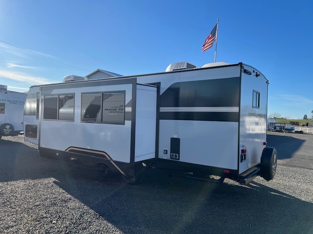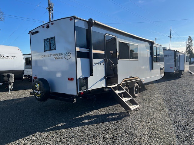 With any Vibe travel trailer by Forest River, you will enjoy comfort at every turn! There is a Norco huck-bolted steel frame, an enclosed underbelly with 12V heating pads, and a PVC roof membrane for added durability. You will also find a universal docking station outside, along with slam latch doors, and the largest square windows in its class. Inside, you'll find a 6' 8" ceiling height, an oversized residential-style sink, no carpet for easier cleaning, plus premium residential-style furniture for all around comfort. Each model is also prepped for a back-up camera, an On-The-Go ladder attachment, and solar power, allowing you to upgrade your travel trailer if you choose!