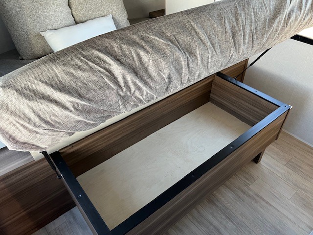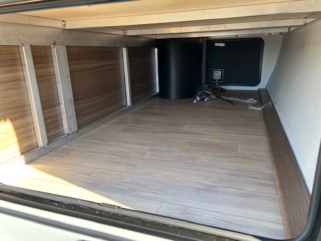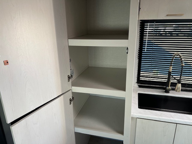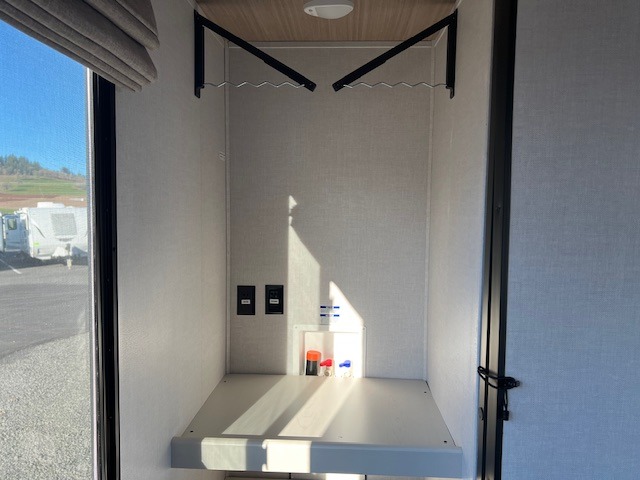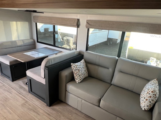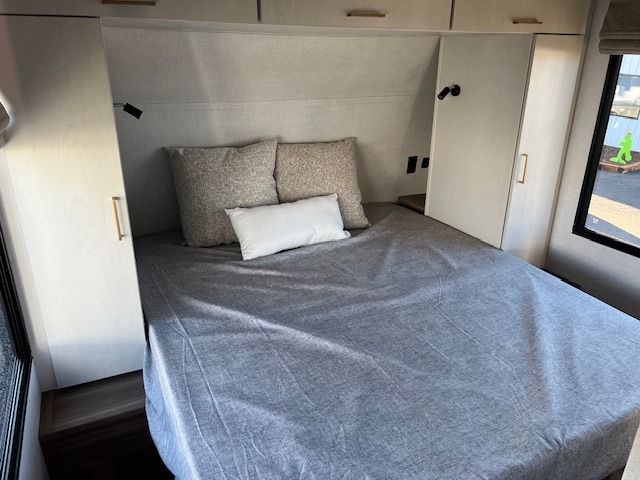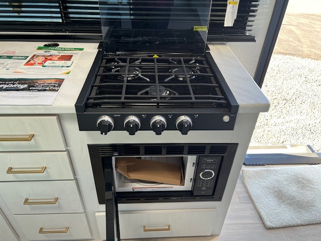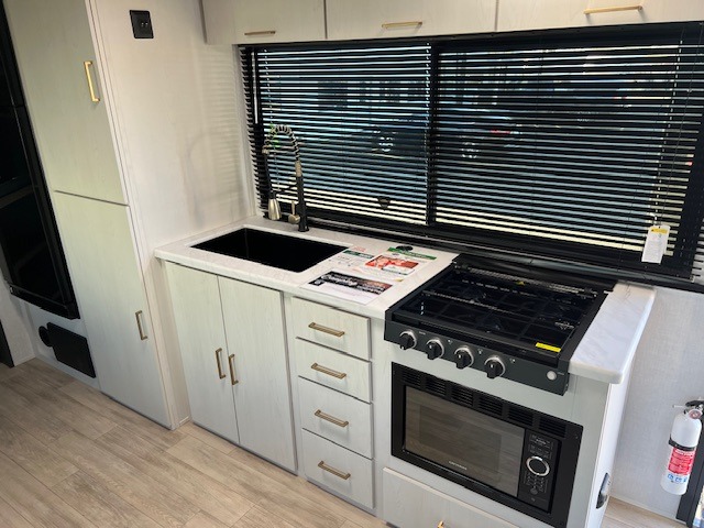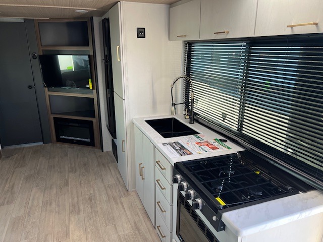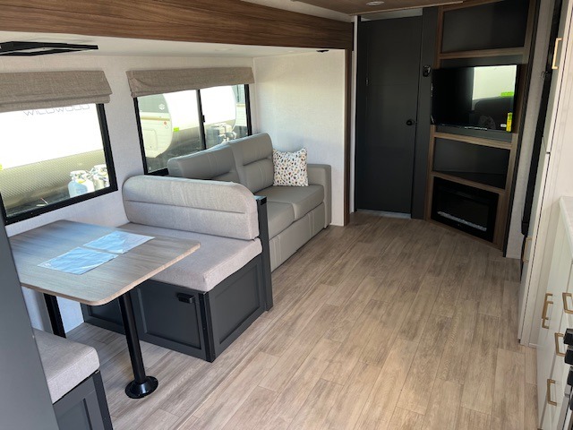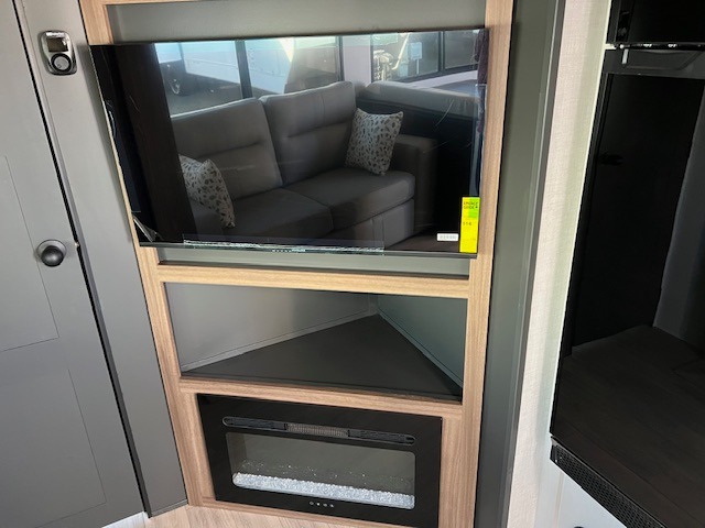 You will love camping every other weekend in this spacious travel trailer. There is a full rear bath with a spacious shower and linen closet for towels and toiletries. Your crew can get comfortable on the theater seating across from the entertainment center and fireplace. Easily prepare your meals in the kitchen on the three-burner cooktop, or in the oven. There is also a 12V refrigerator, plus a microwave for meals on the go. When you're ready to call it a night, the front private bedroom is sure to provide comfort with its custom king bed and generous storage space.