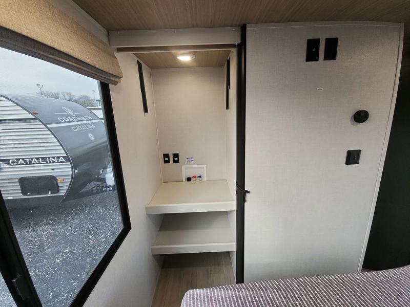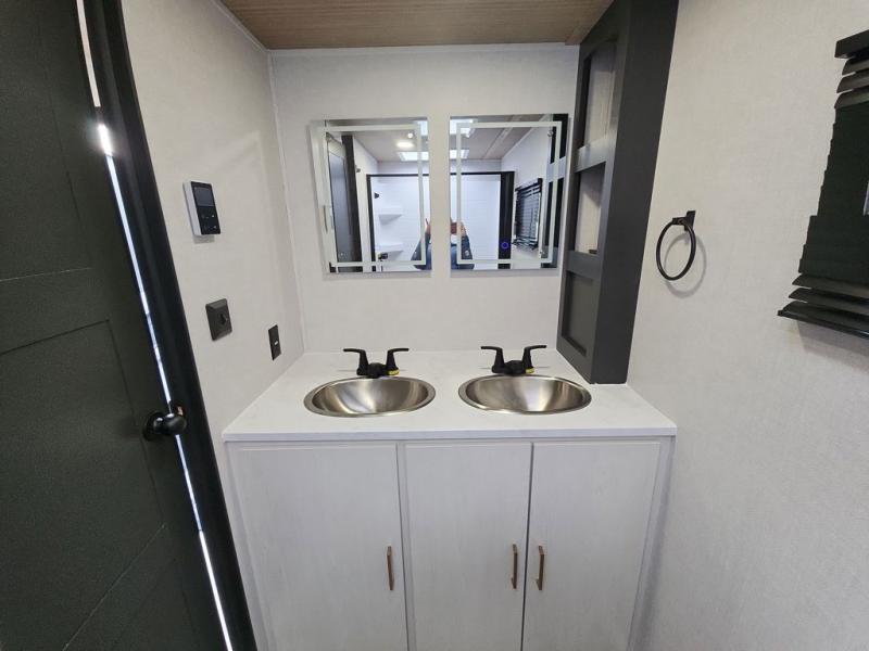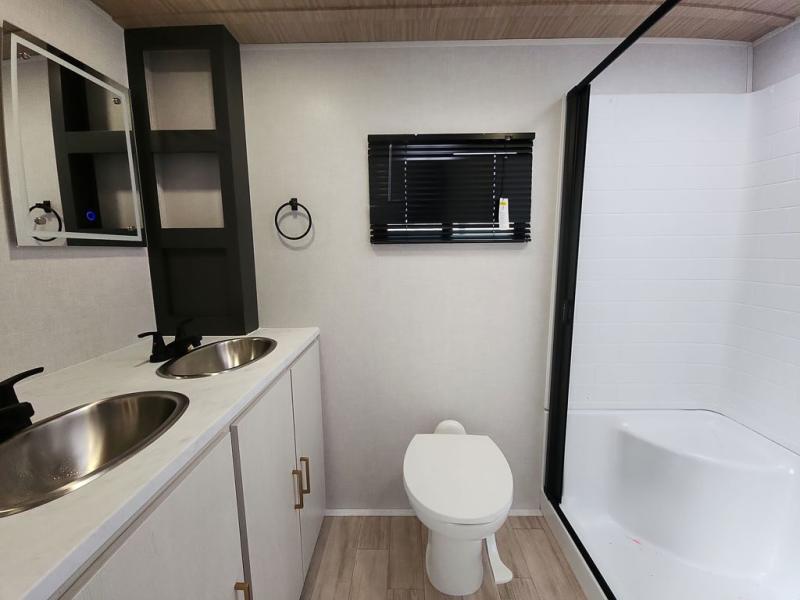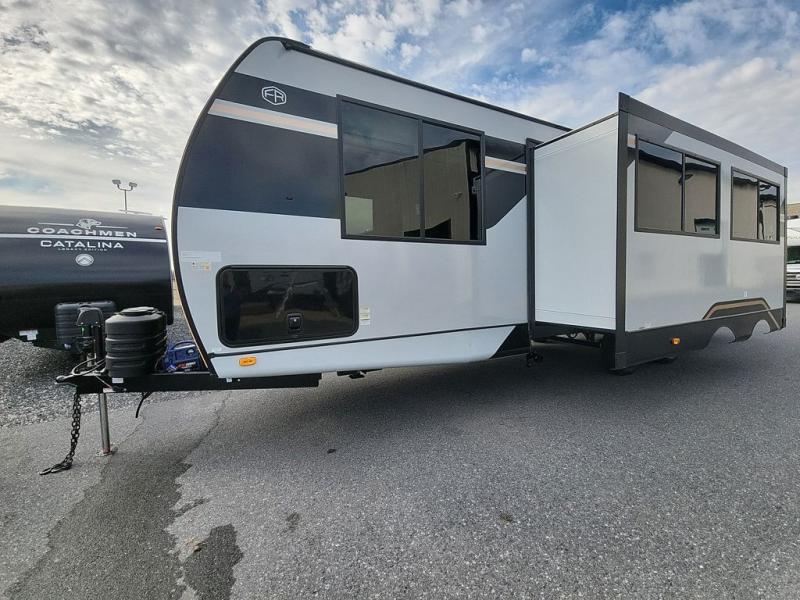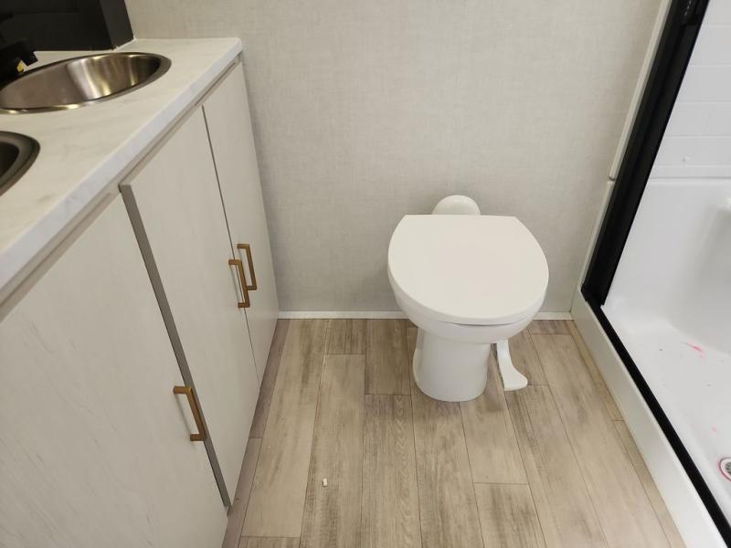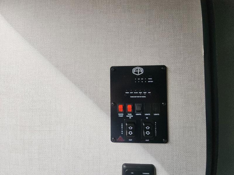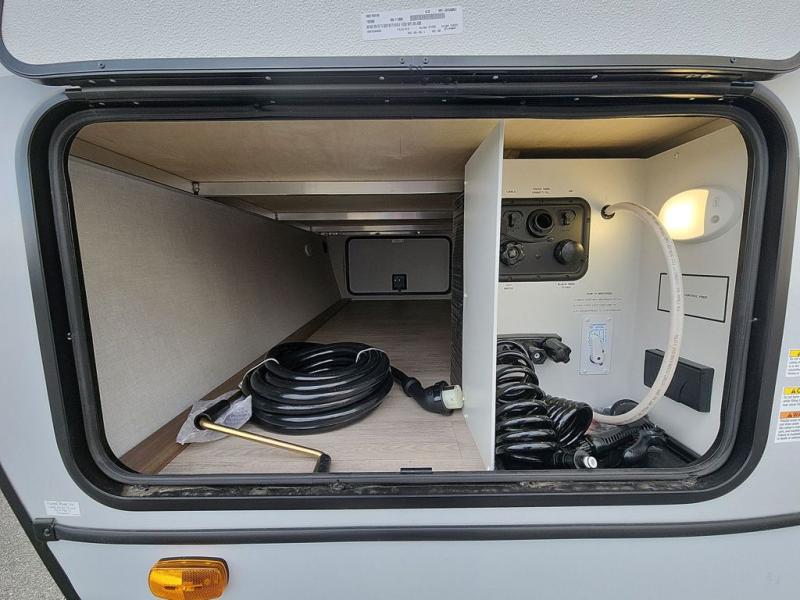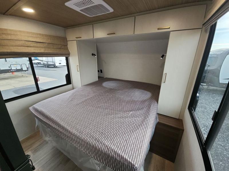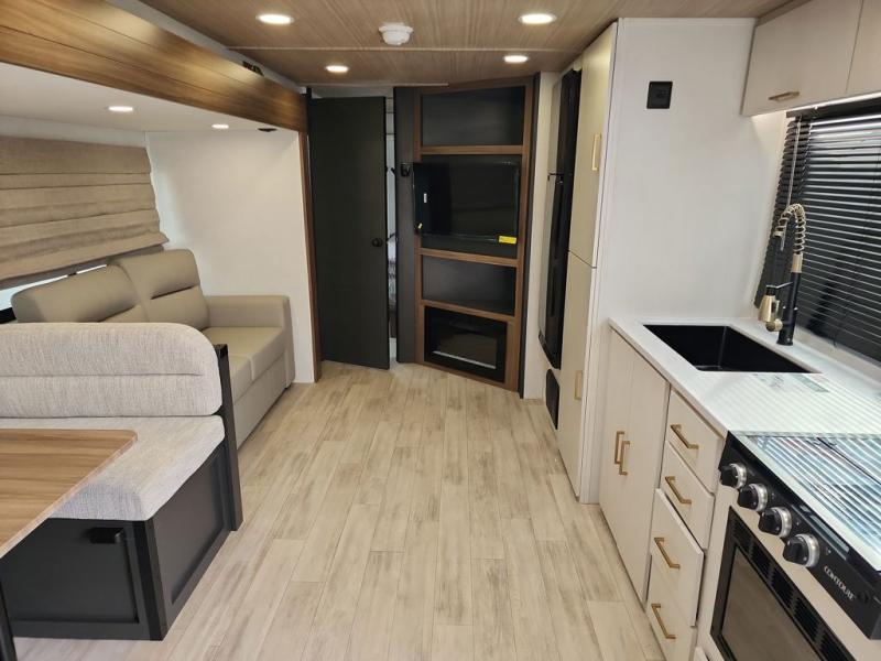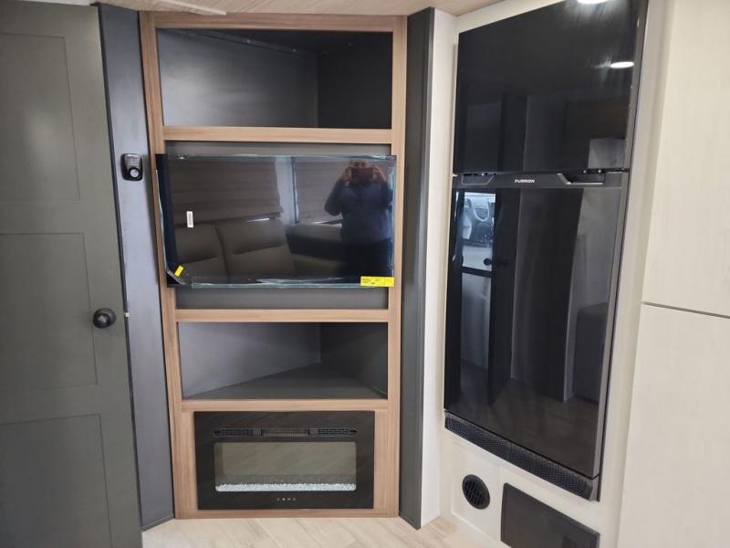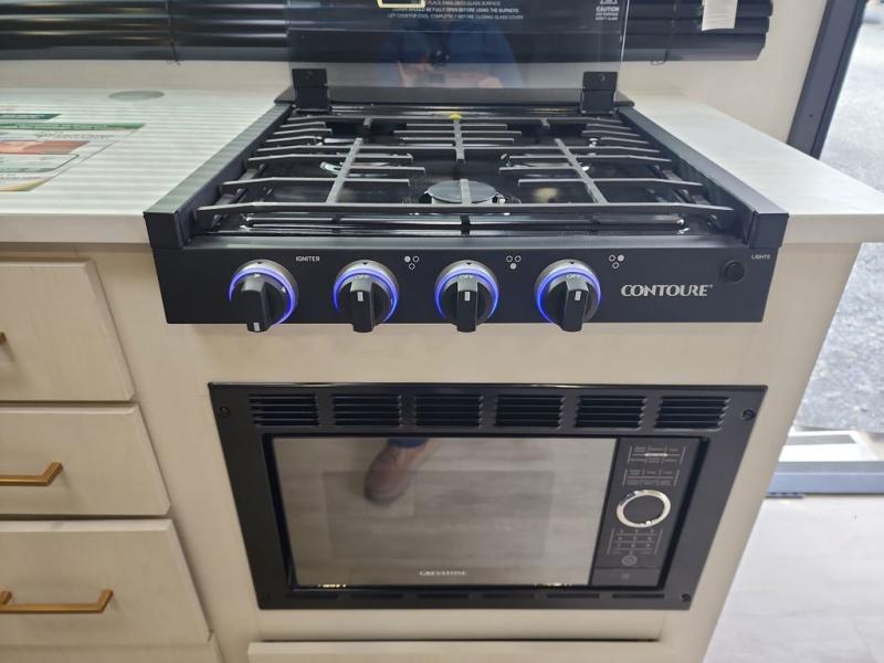 You will love camping every other weekend in this spacious travel trailer. There is a full rear bath with a spacious shower and linen closet for towels and toiletries. Your crew can get comfortable on the theater seating across from the entertainment center and fireplace. Easily prepare your meals in the kitchen on the three-burner cooktop, or in the oven. There is also a 12V refrigerator, plus a microwave for meals on the go. When you're ready to call it a night, the front private bedroom is sure to provide comfort with its custom king bed and generous storage space.
